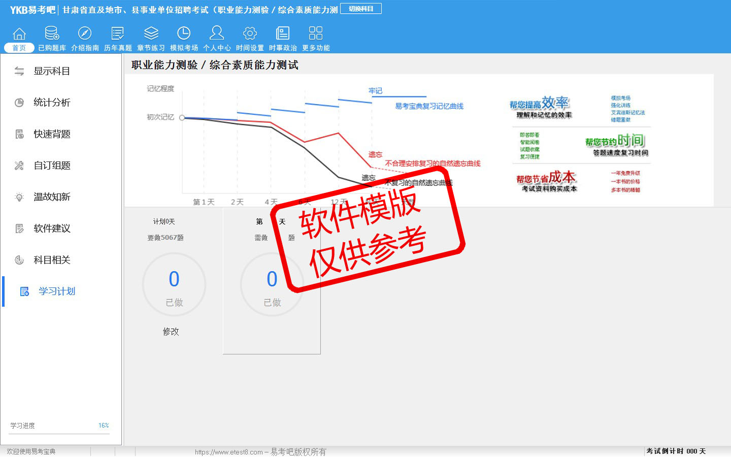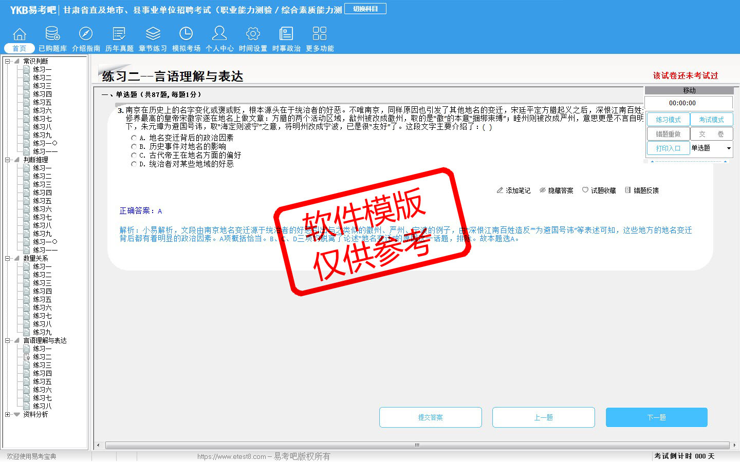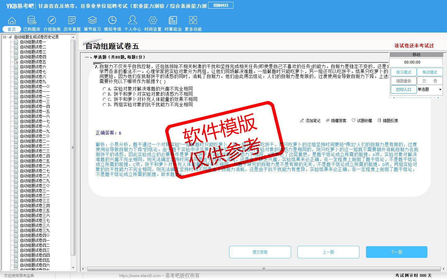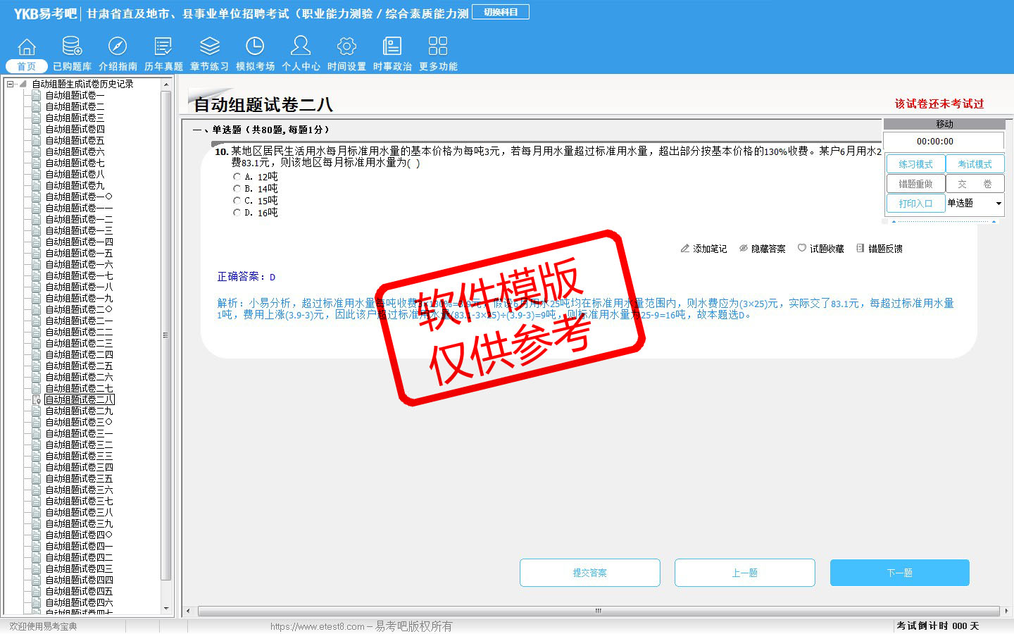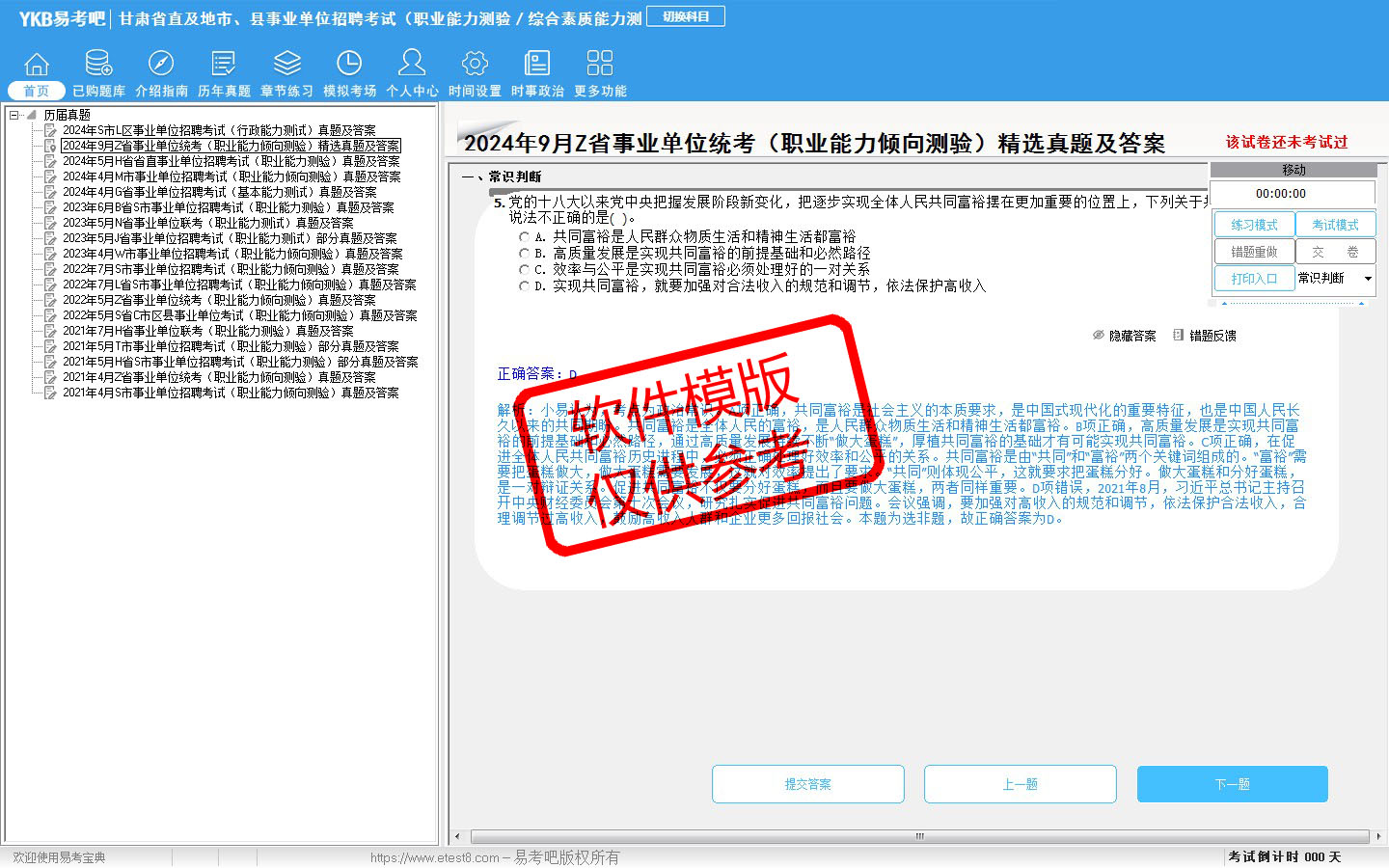 题量内容: 模拟试题库共有5352道试题,可以任意组成模拟考场试卷练习53套,历届真题有16套,另有各章节的练习试题多套,以及多条考试介绍和考试指南(辅导资料)。
