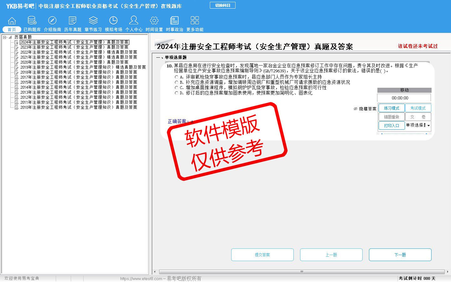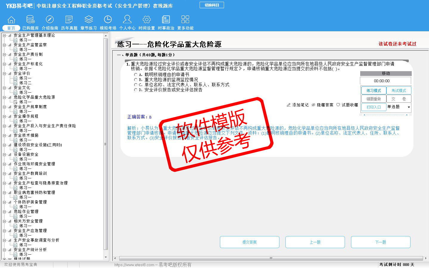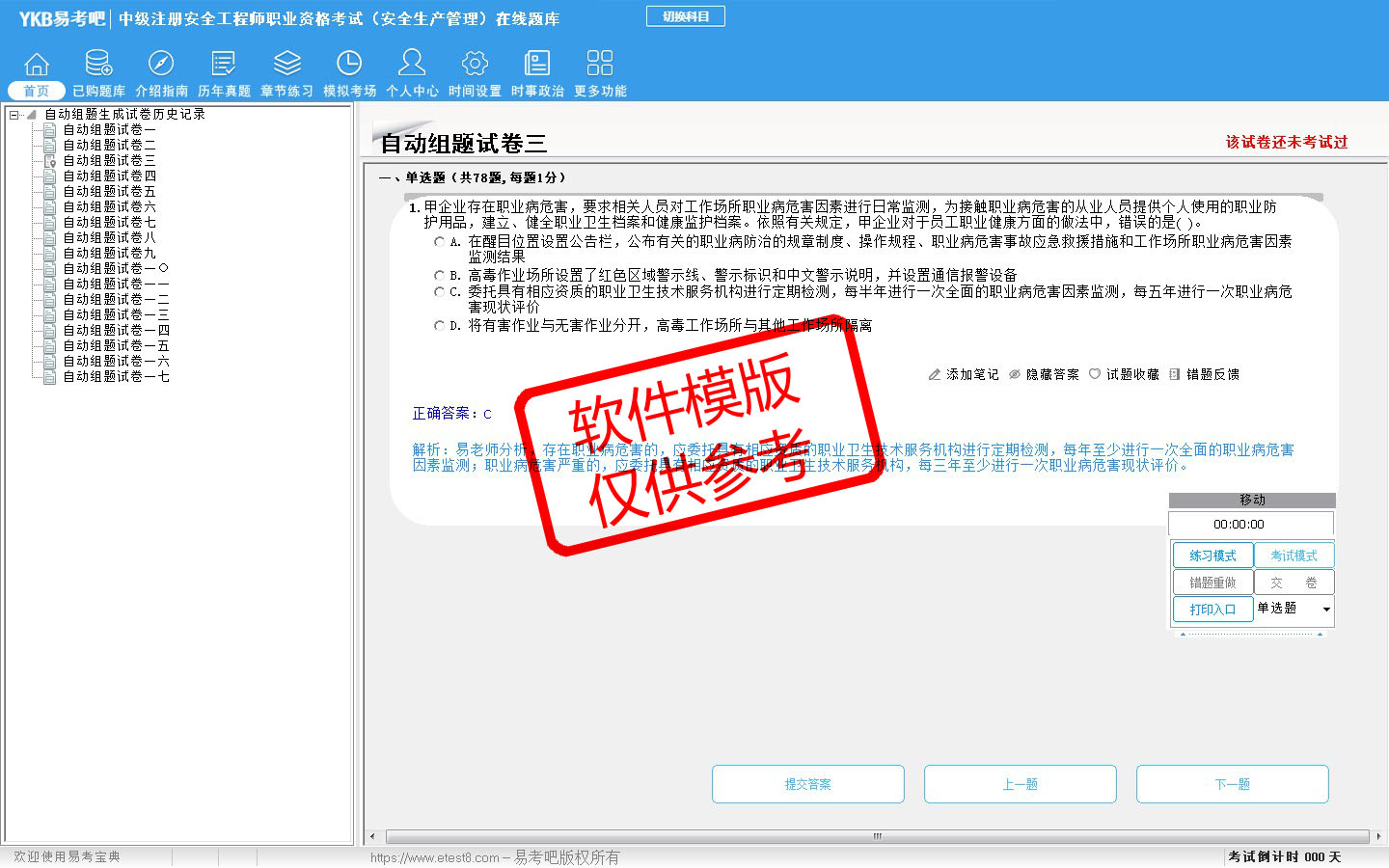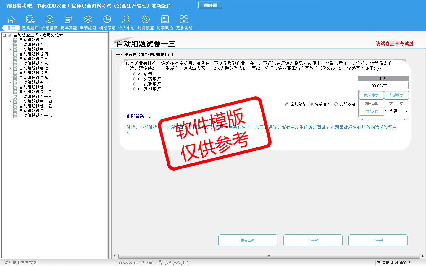题量内容: 模拟试题库共有1876道试题,可以任意组成模拟考场试卷练习18套,历届真题有6套,另有各章节的练习试题多套。