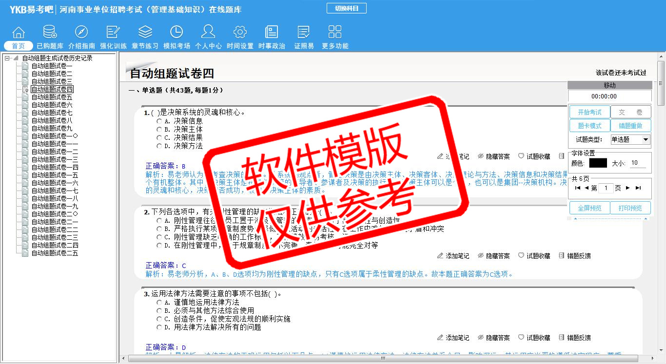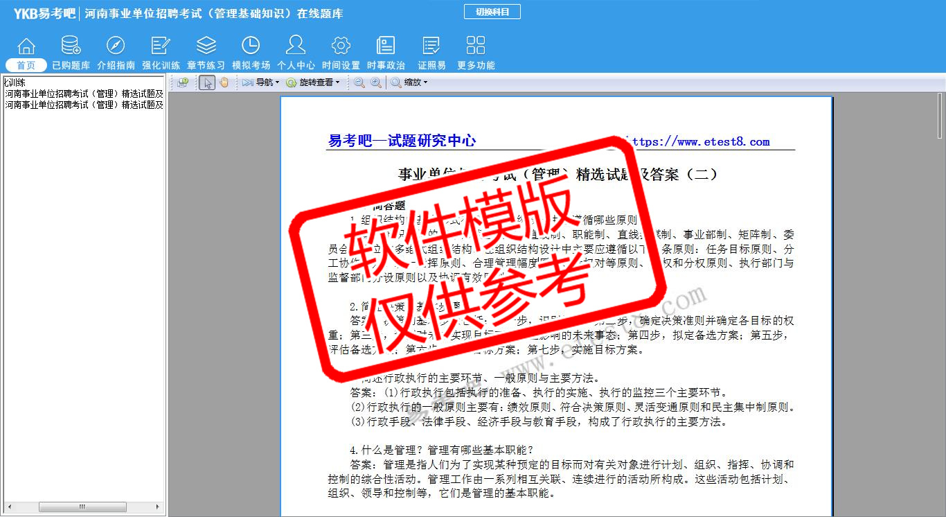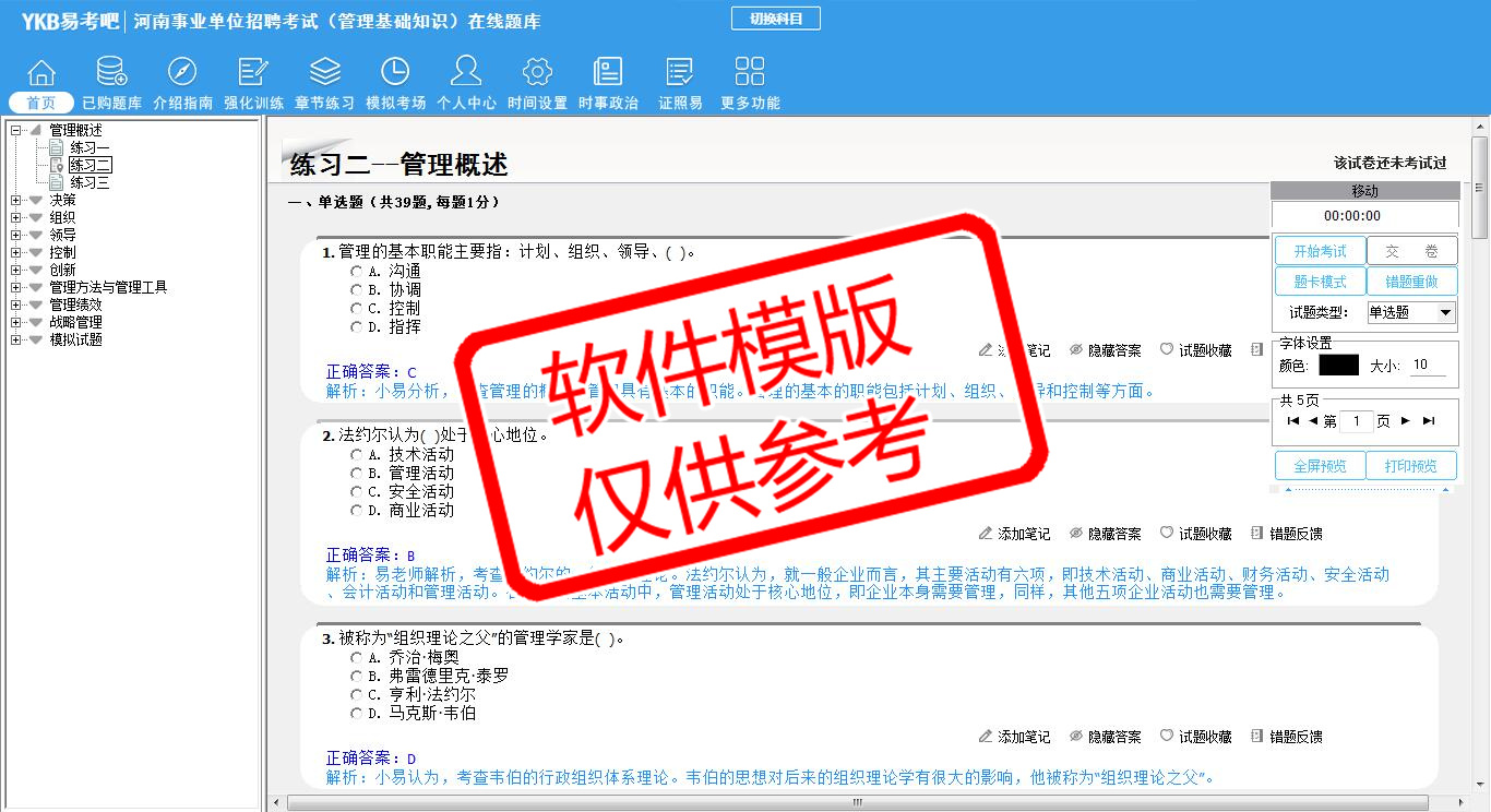 模拟试题库共有3418道试题,可以任意组成模拟考场试卷练习34套,强化训练有2套,另有各章节的练习试题多套,以及多条考试介绍和考试指南(辅导资料)。