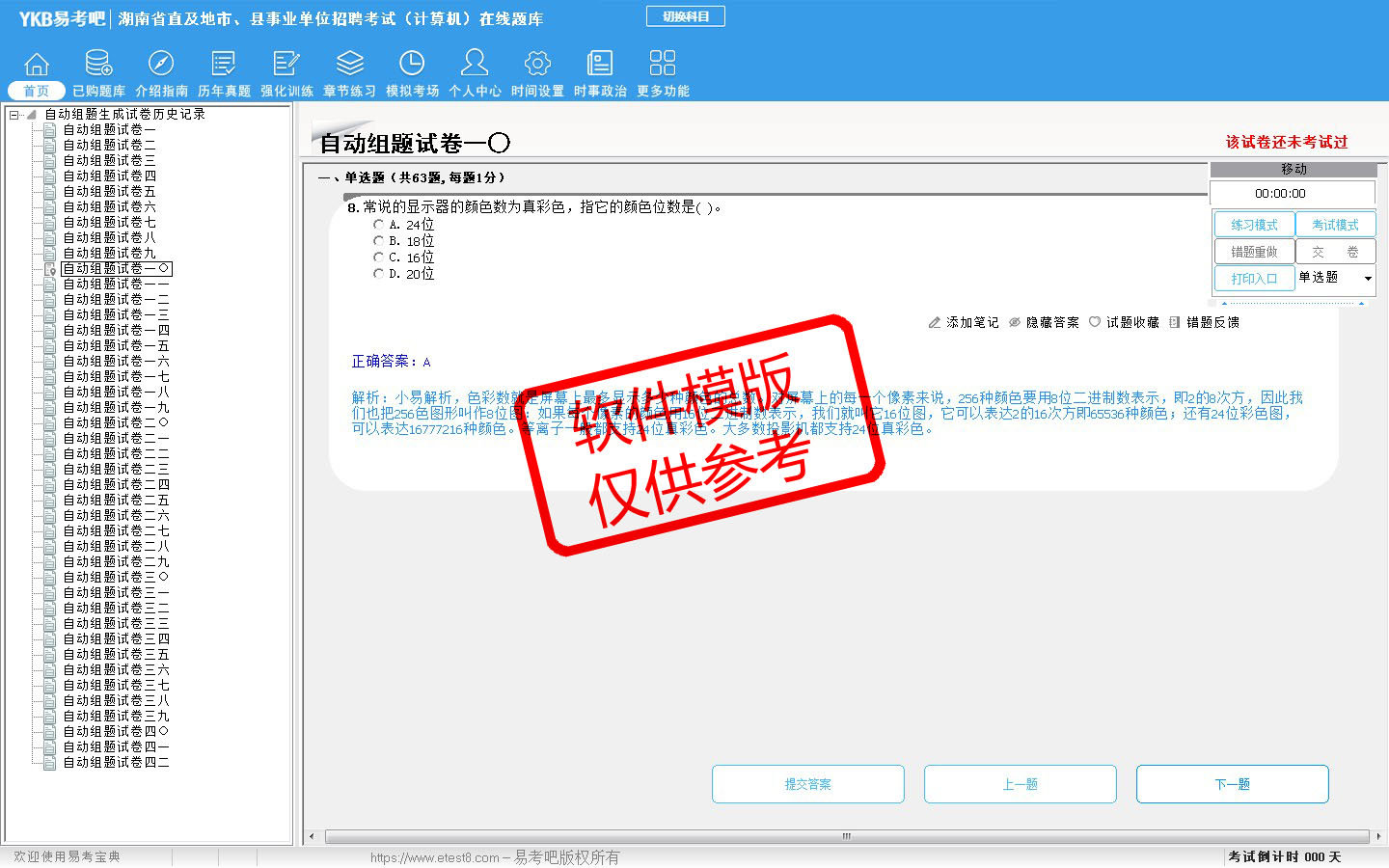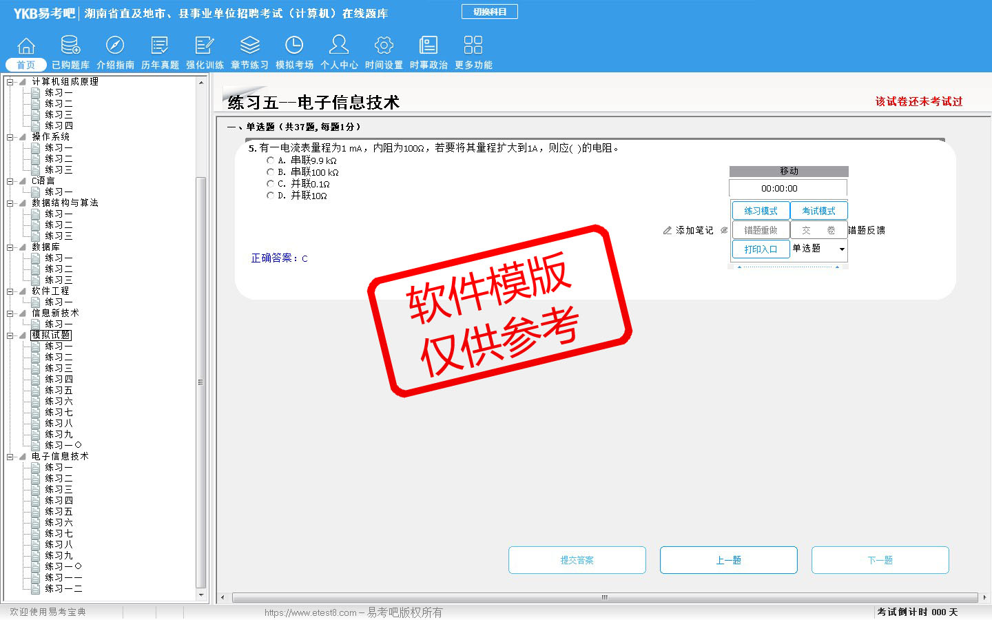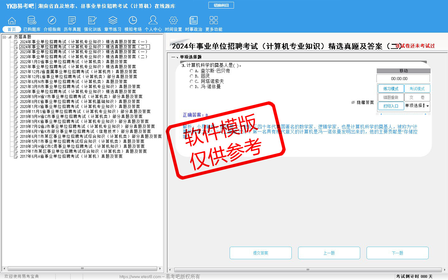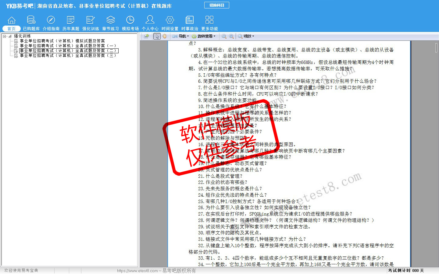 题量内容: 模拟试题库共有4239道试题,可以任意组成模拟考场试卷练习42套,强化训练有4套,历届真题有24套,另有各章节的练习试题多套,以及多条考试介绍和考试指南(辅导资料)。