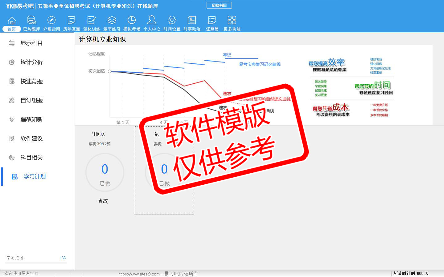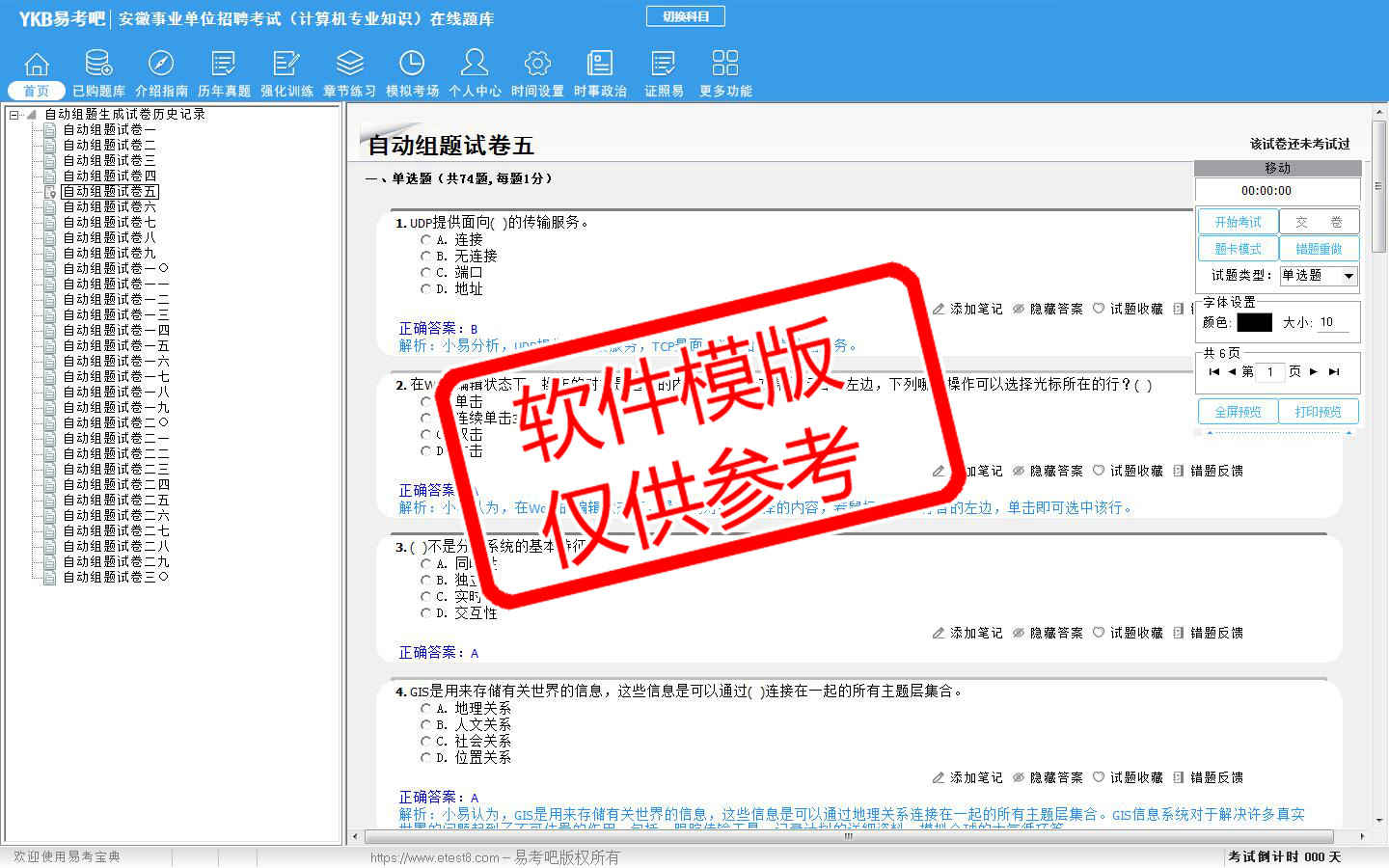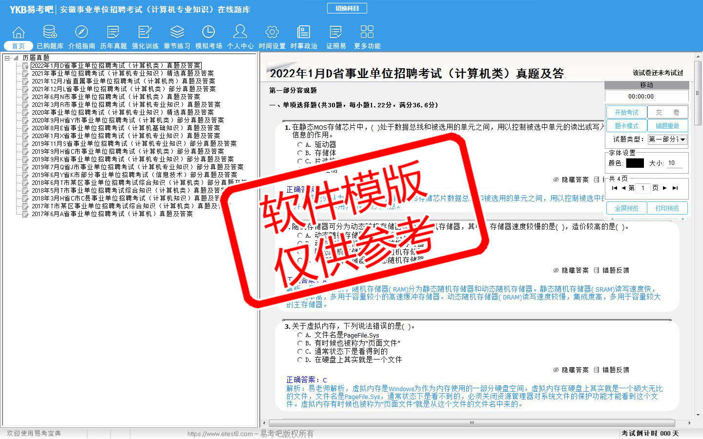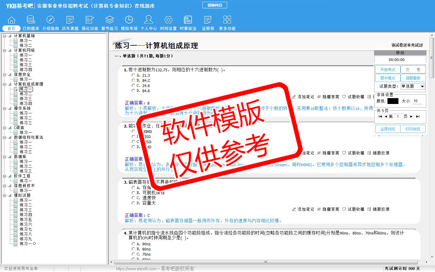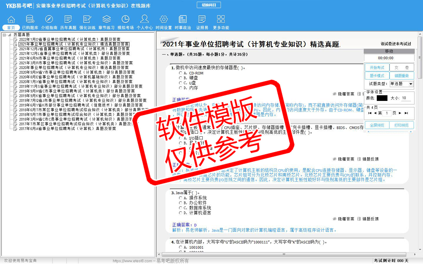 题量内容: 模拟试题库共有3724道试题,可以任意组成模拟考场试卷练习37套,历届真题有6套,另有各章节的练习试题多套,以及多条考试介绍和考试指南(辅导资料)。