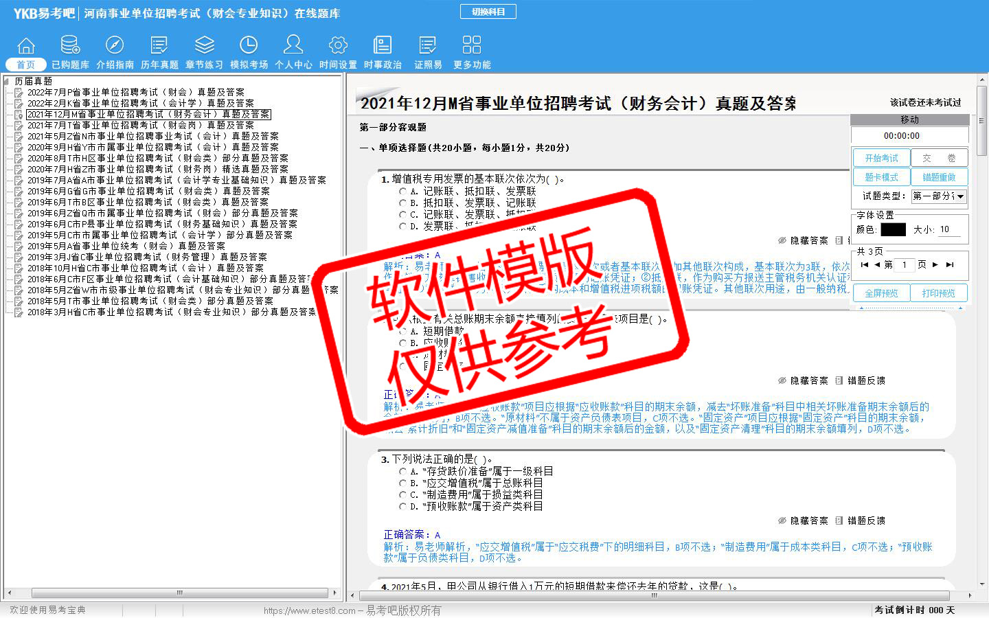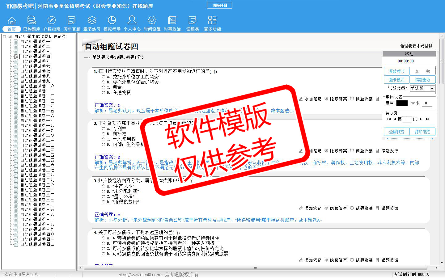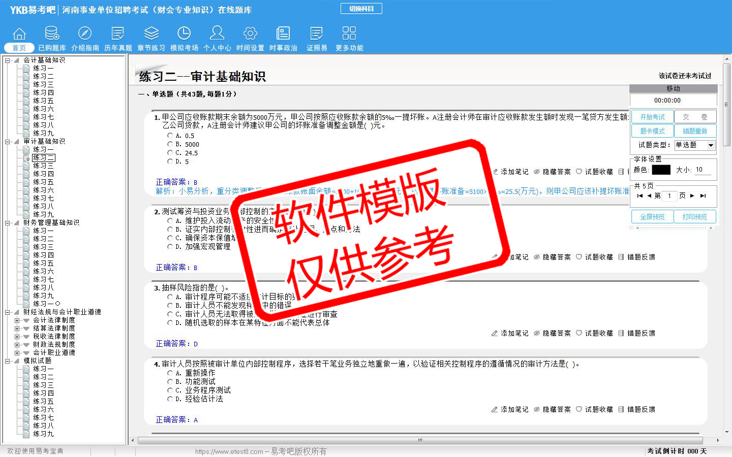 模拟试题库共有4171道试题,可以任意组成模拟考场试卷练习41套,历届真题有6套,另有各章节的练习试题多套,以及多条考试介绍和考试指南(辅导资料)。