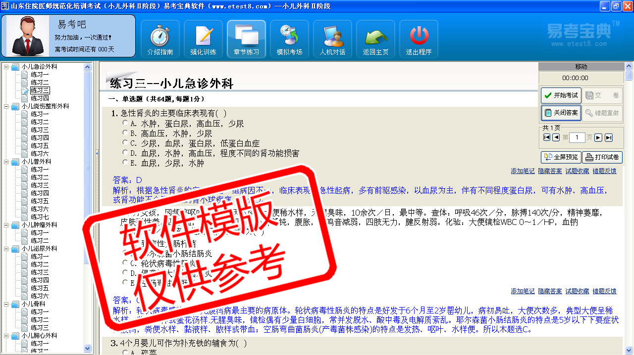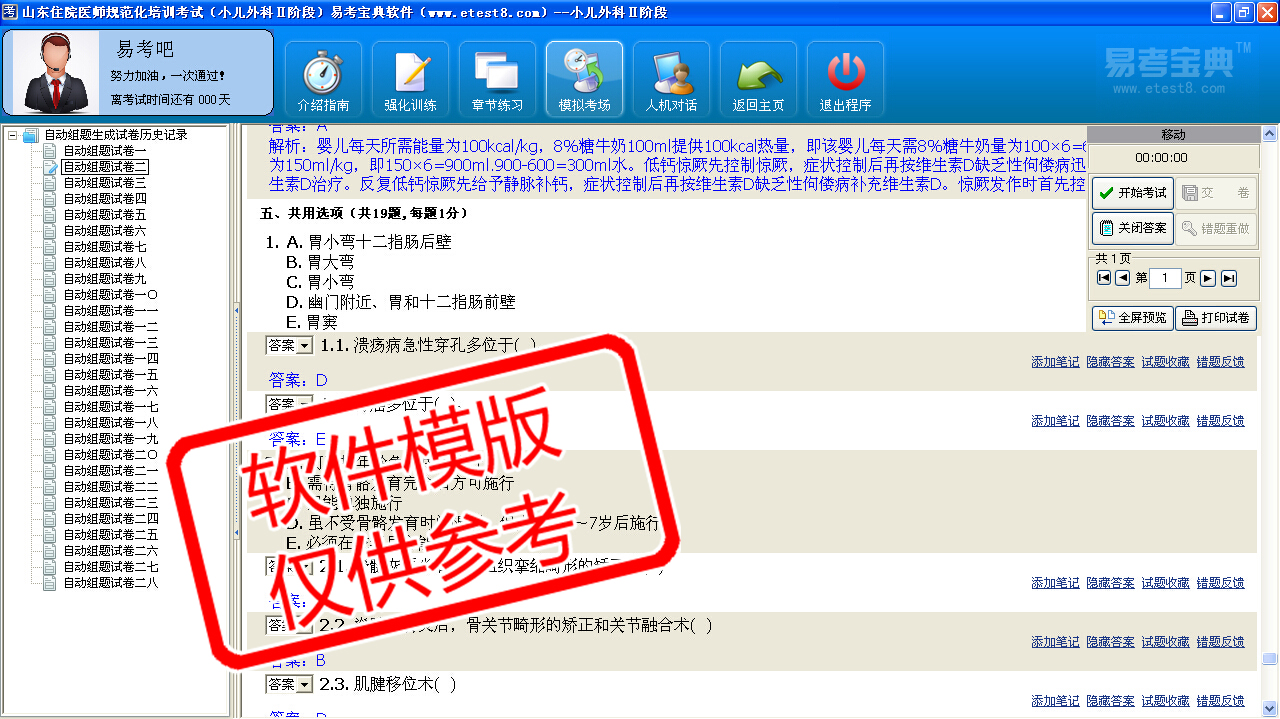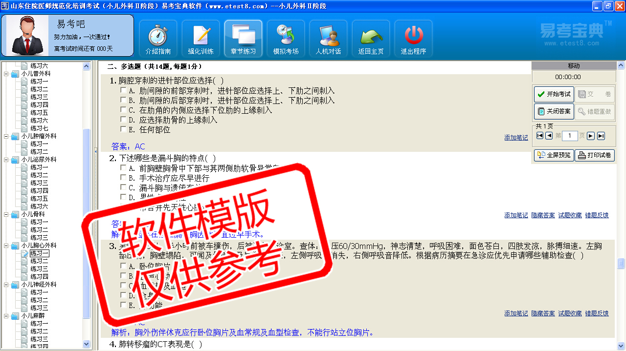 模拟试题库共有2960道试题,可以任意组成23套模拟试题。题库内容主要有:小儿急诊外科、小儿烧伤整形外科、小儿普外科、小儿肿瘤外科、小儿泌尿外科、小儿骨科、小儿胸心外科、小儿神经外科、小儿麻醉