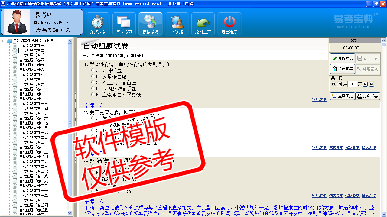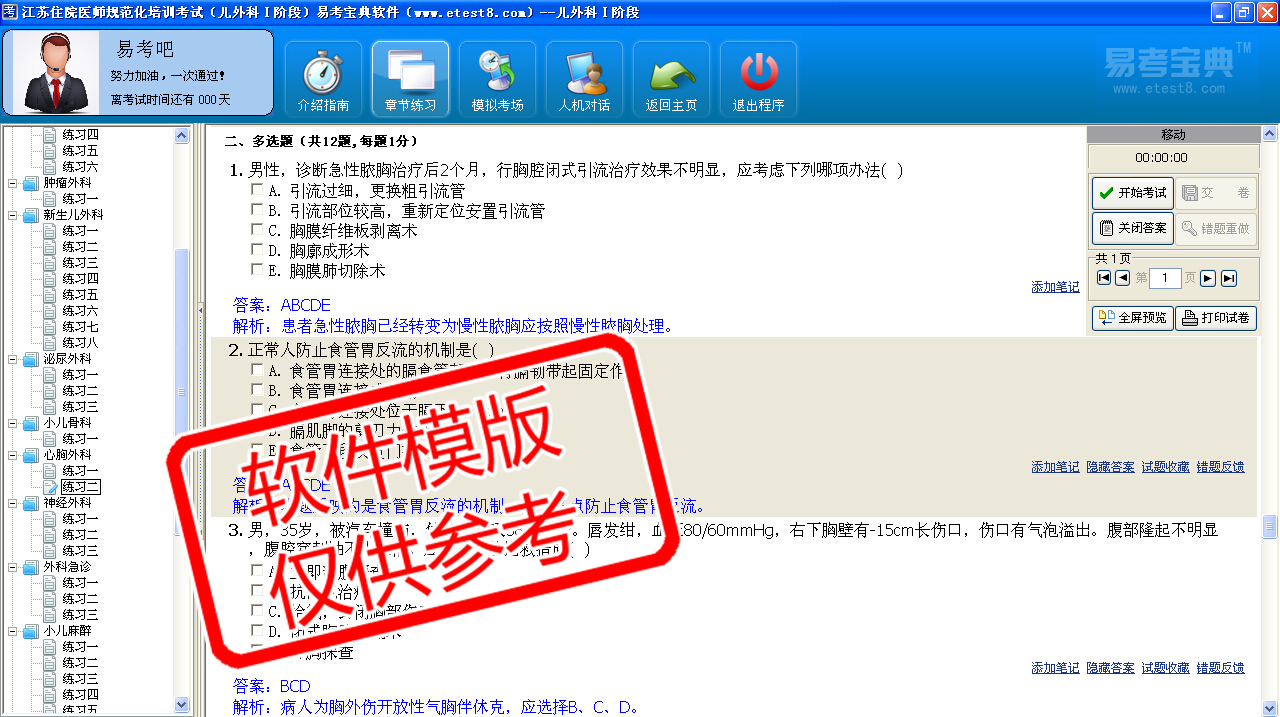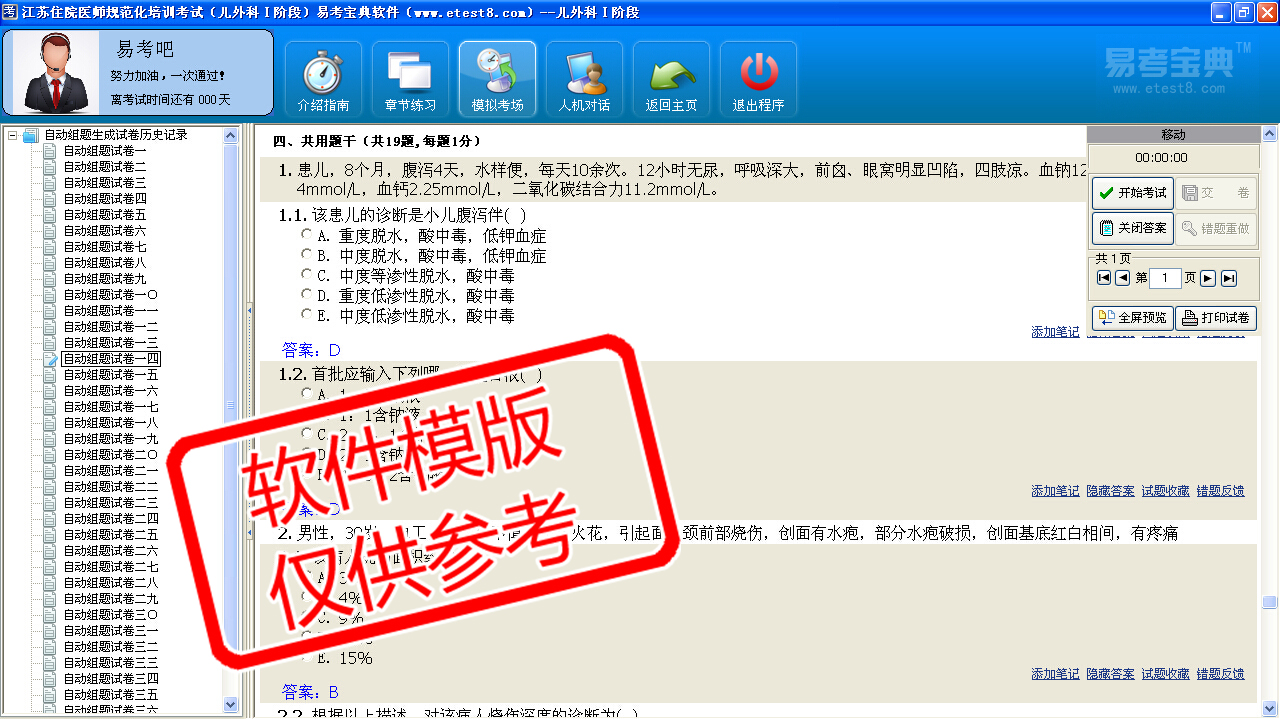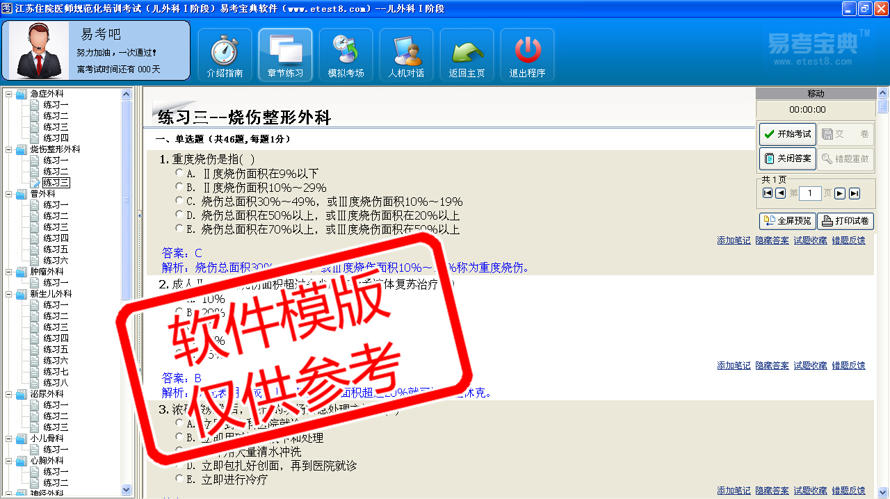 模拟试题库共有4350道试题,可以任意组成32套模拟试题。题库内容主要有:急症外科、烧伤整形外科、普外科、肿瘤外科、新生儿外科、泌尿外科、小儿骨科、心胸外科、神经外科、外科急诊、小儿麻醉、放射科、B超
