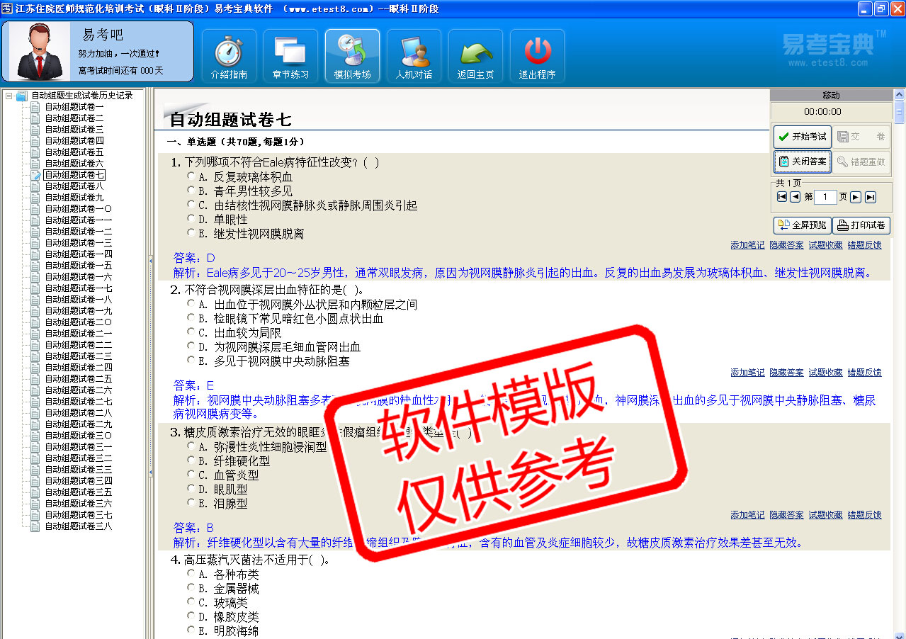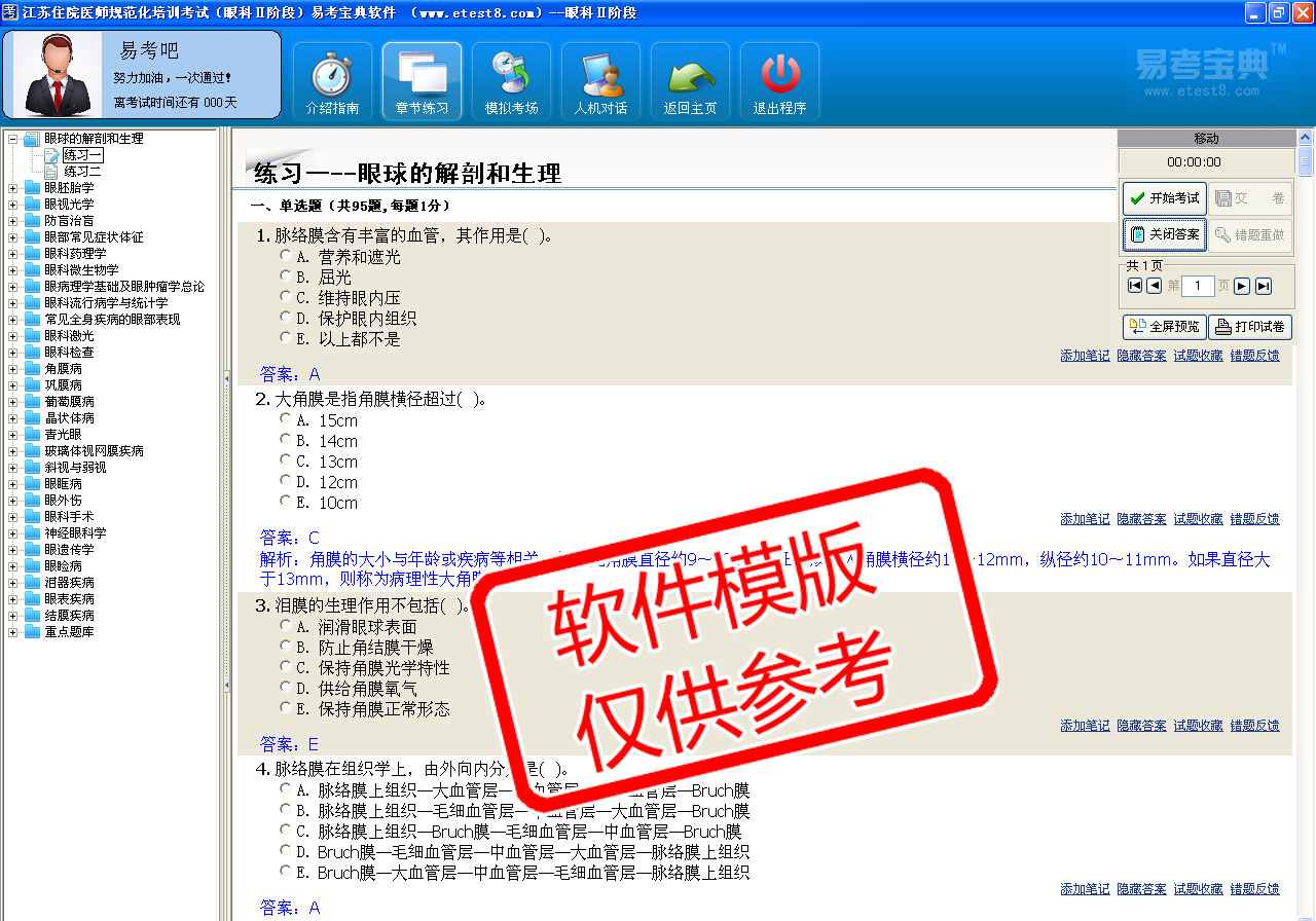 模拟试题库共有2710道试题,可以任意组成21套模拟试题。题库内容主要有:玻璃体视网膜疾病、常见全身疾病的眼部表现、防盲治盲、角膜病和巩膜病、结膜病、晶状体病、泪器病、葡萄膜病、青光眼、神经眼科学、斜视与弱视、眼表疾病、眼病理学基础及眼肿瘤、眼部常见症状与体征、眼睑病、眼科激光、眼科检查法、眼科流行病学与统计学、眼科手术、眼科微生物、眼科药理学、眼眶病、眼胚胎发育、眼球的解剖和生理、眼视光学、眼外伤、眼遗传学