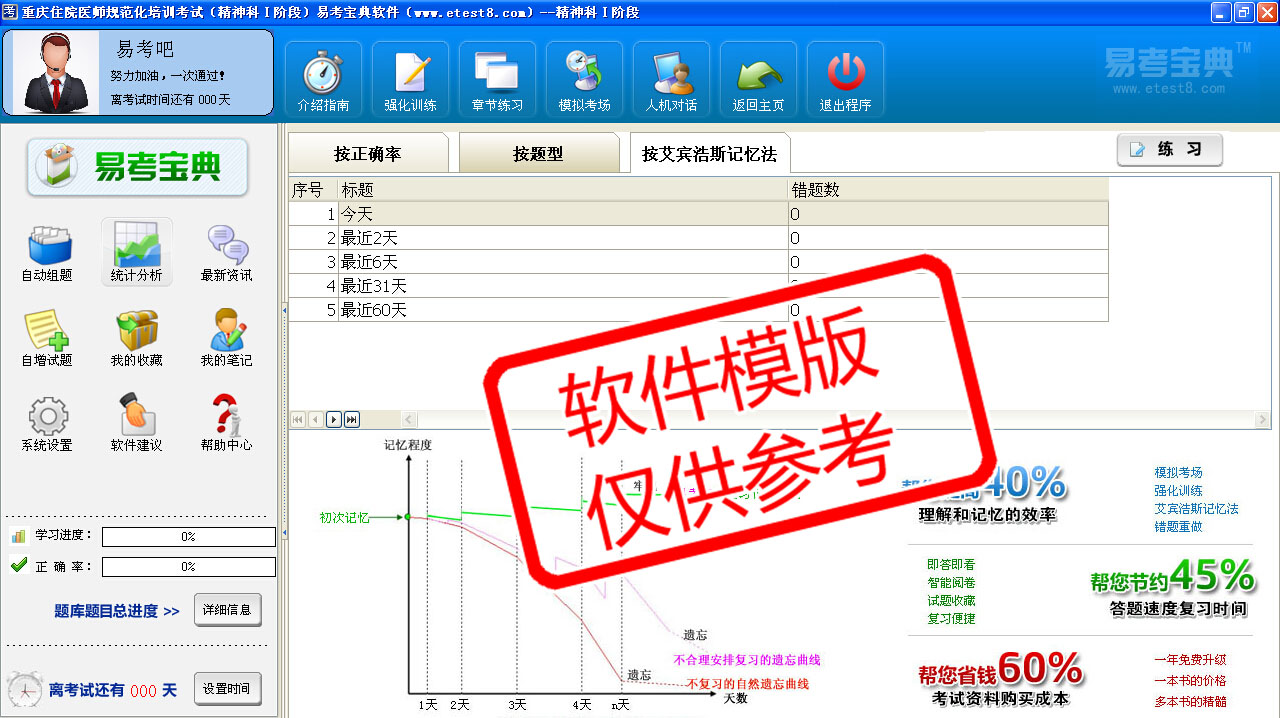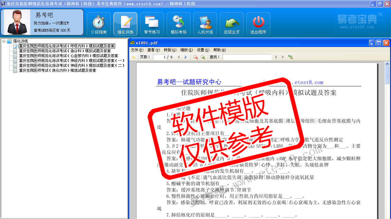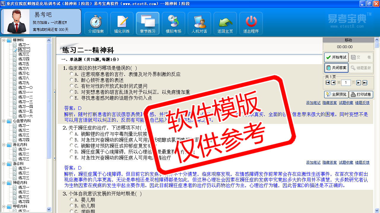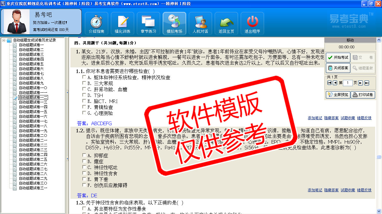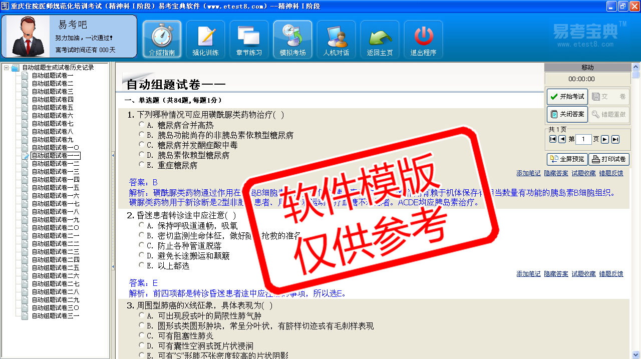 模拟试题库共有3030道试题,可以任意组成27套模拟试题。题库内容有:精神科、神经内科、急诊科、心血管内科、消化内科、呼吸内科、内分泌科、血液内科