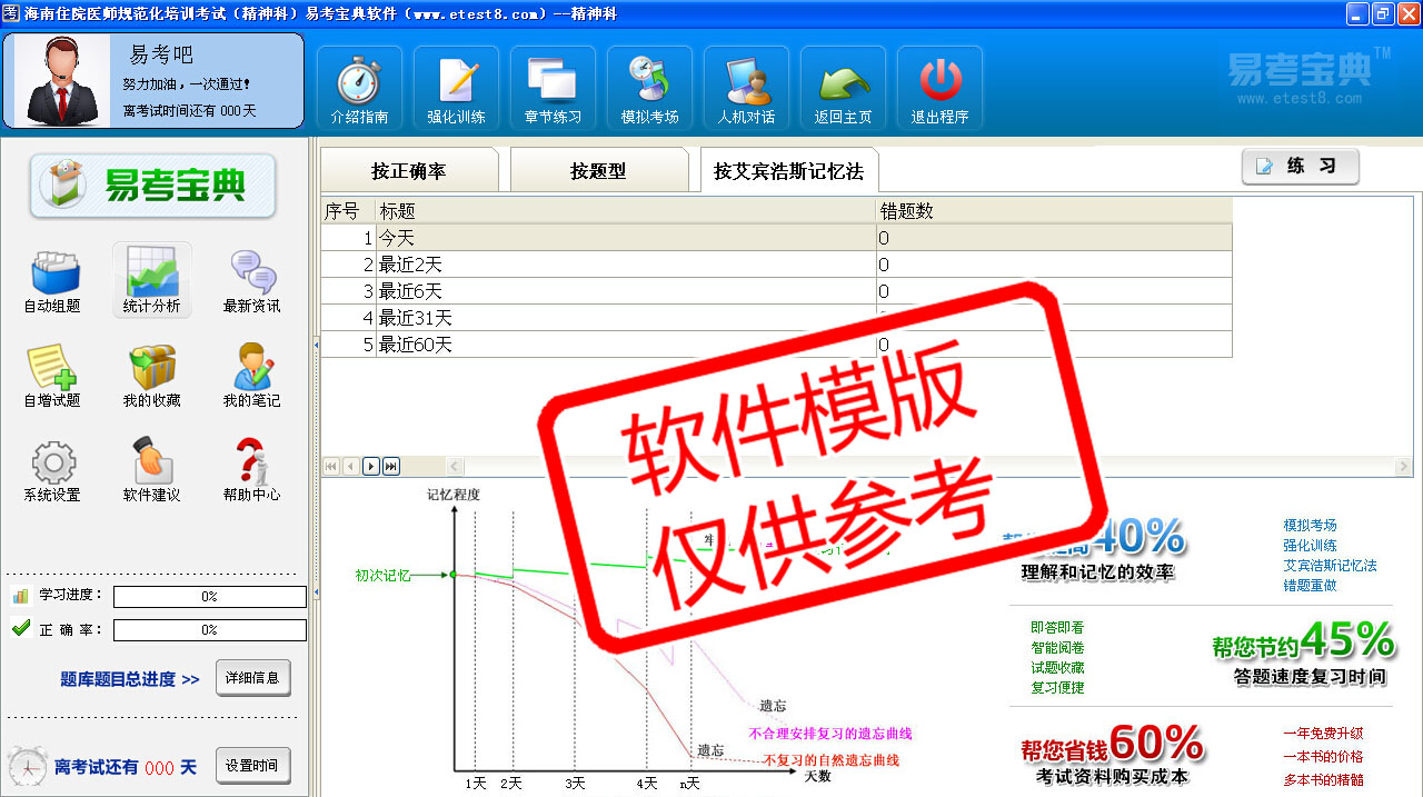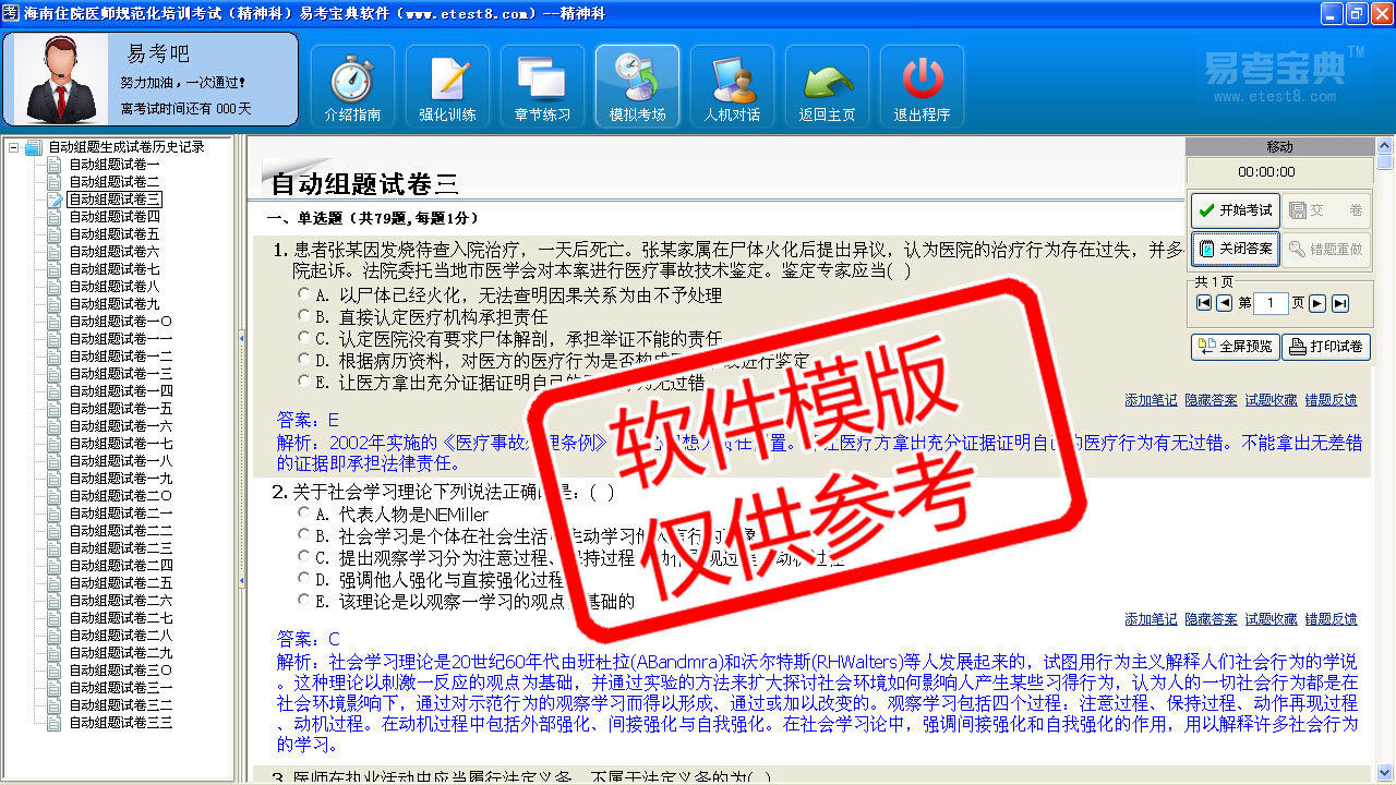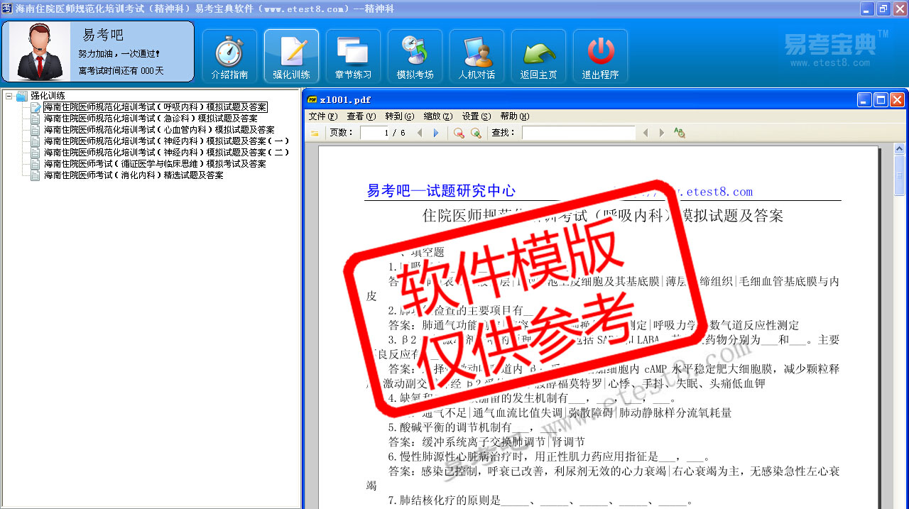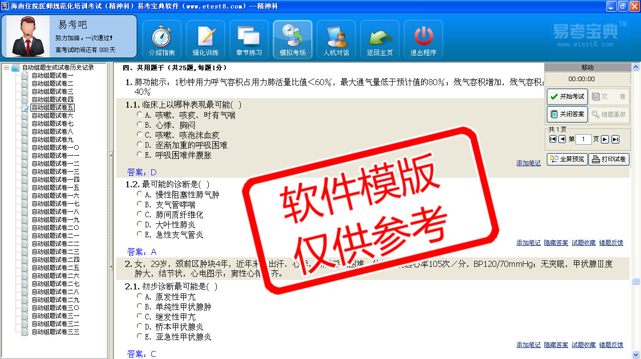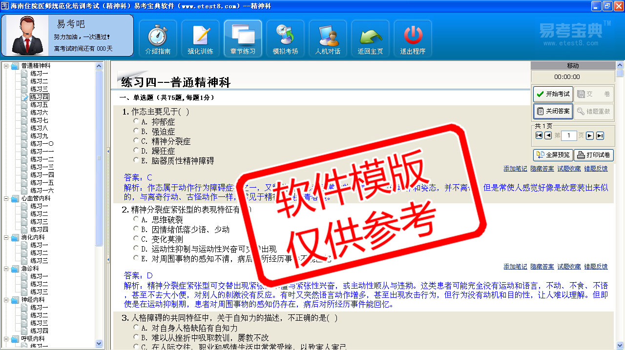 模拟试题库共有3370道试题,可以任意组成29套模拟试题。题库内容有:普通精神科、心血管内科、消化内科、急诊科、神经内科、呼吸内科、内分泌科、卫生法律法规、循证医学与临床思维、传染病防治