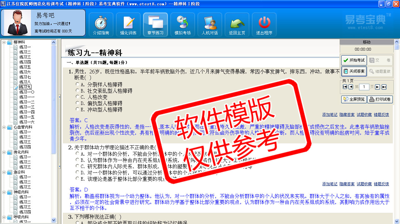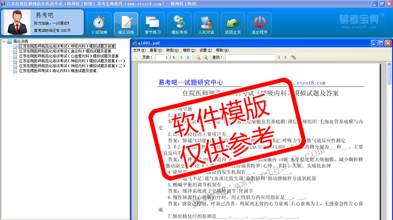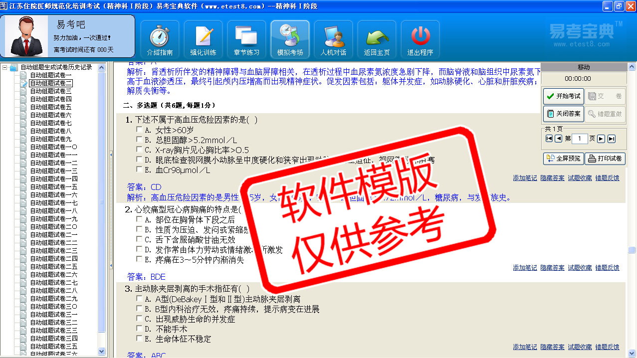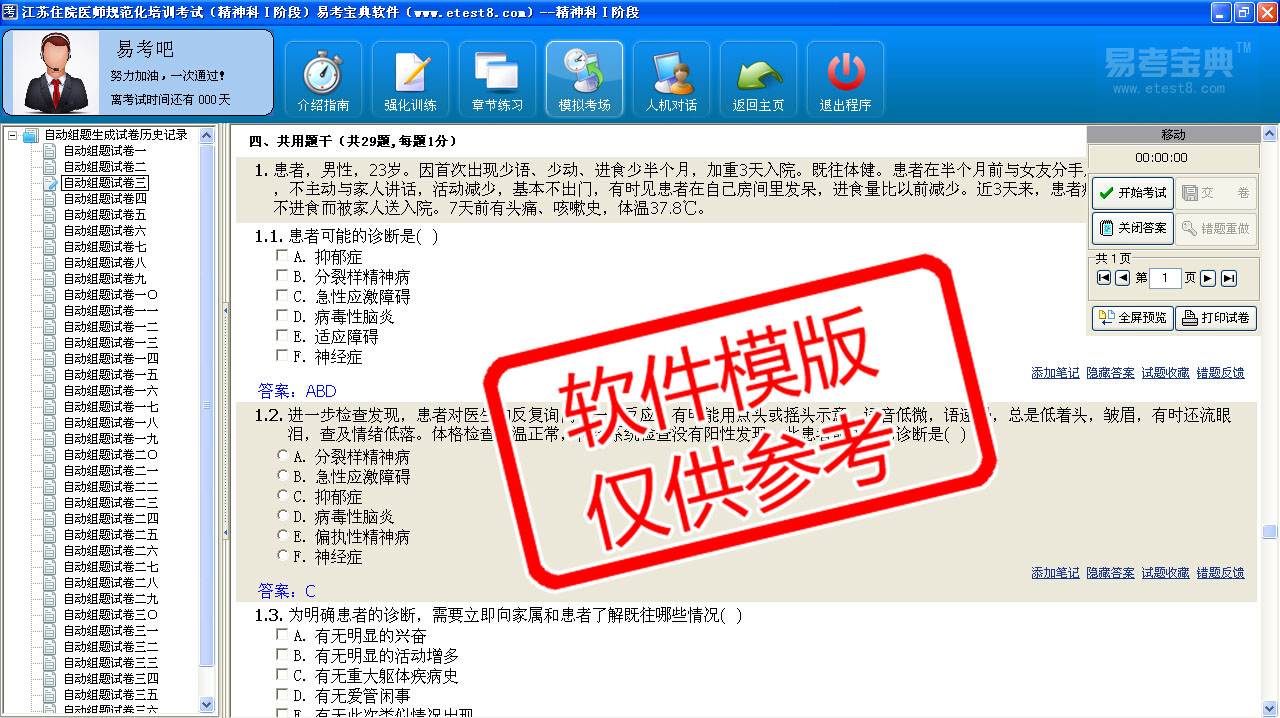 模拟试题库共有3320道试题,可以任意组成27套模拟试题。题库内容有:精神科、神经内科、急诊科、心血管内科、消化内科、呼吸内科、内分泌科、血液科、肾脏内科