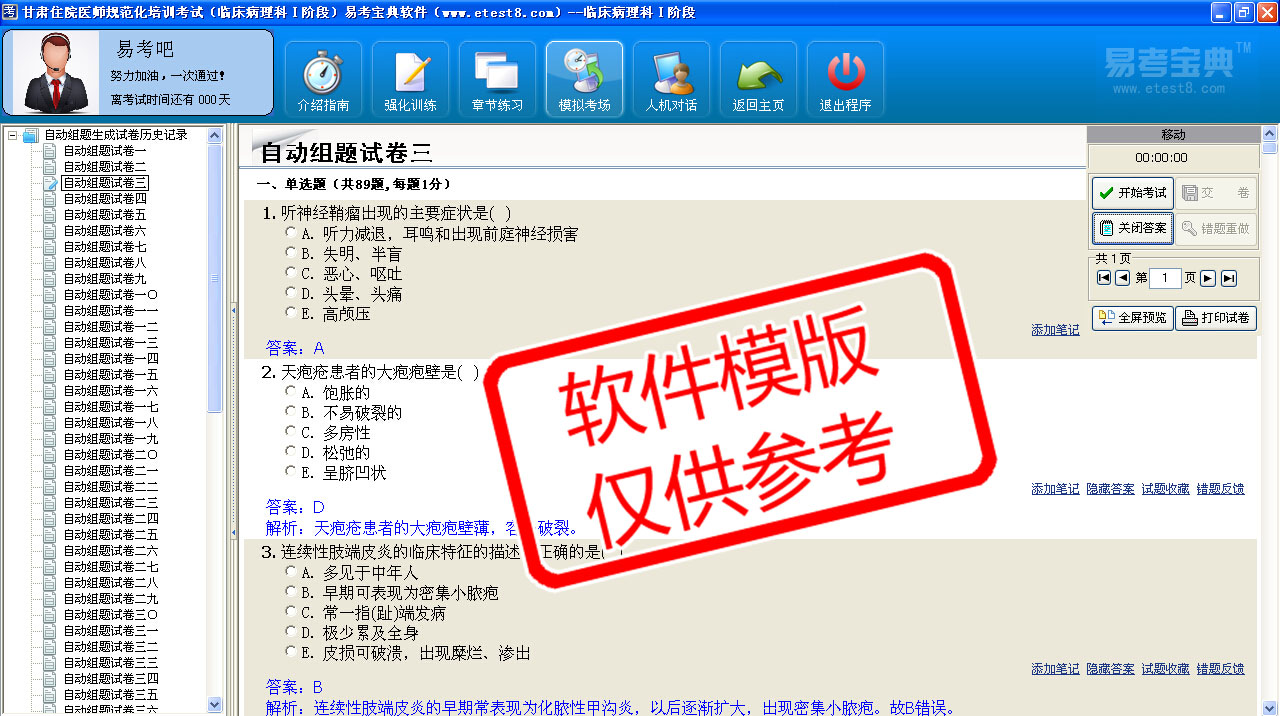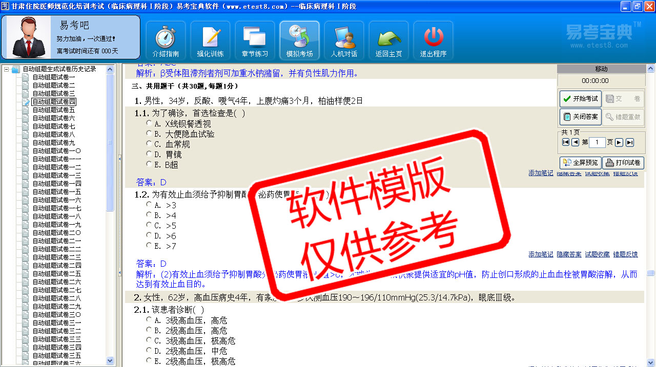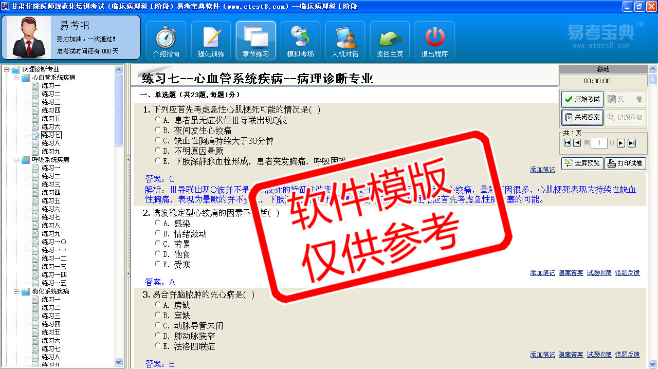 模拟试题库共有8060道试题,可以任意组成65套模拟试题。题库内容有:1.病理诊断专业(心血管系统疾病、呼吸系统疾病、消化系统疾病、淋巴造血系统疾病、男性生殖系统及泌尿系统疾病、女性生殖系统及乳腺疾病、内分泌系统疾病、神经系统疾病、皮肤及软组织疾病、骨关节系统疾病);2.病理技术专业(病理切片室及尸检室、电镜室及分子病理室、特殊染色及免疫组化室)3.细胞病理学;4.医学影像;5.公共科目(卫生法律法规、循证医学与临床思维、传染病防治)等