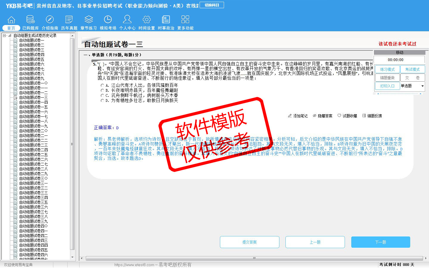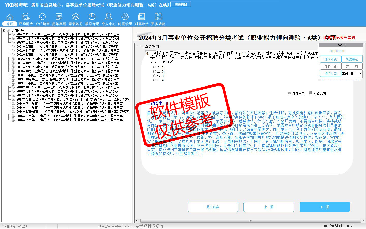 模拟试题库共有4682道试题,可以任意组成模拟考场试卷练习46套,历届真题有13套,另有各章节的练习试题多套,以及多条考试介绍和考试指南(辅导资料)。
