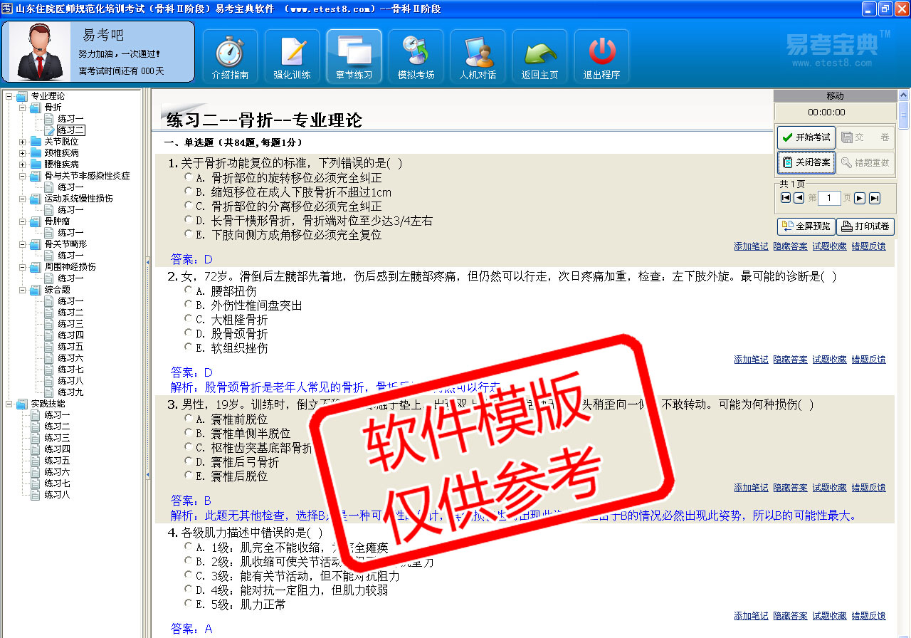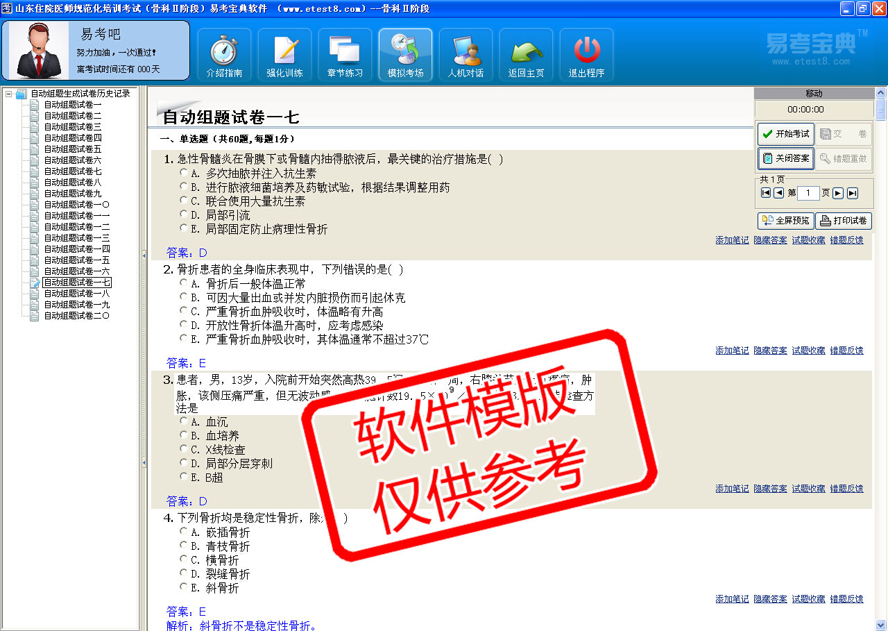模拟试题库共有1215道试题,可以任意组成12套模拟试题。题库内容有:骨折、关节脱位、颈椎疾病、腰椎疾病、骨与关节感染性炎症、骨与关节非感染性炎症、运动系统慢性损伤、骨肿瘤、骨关节畸形、周围神经损伤等。