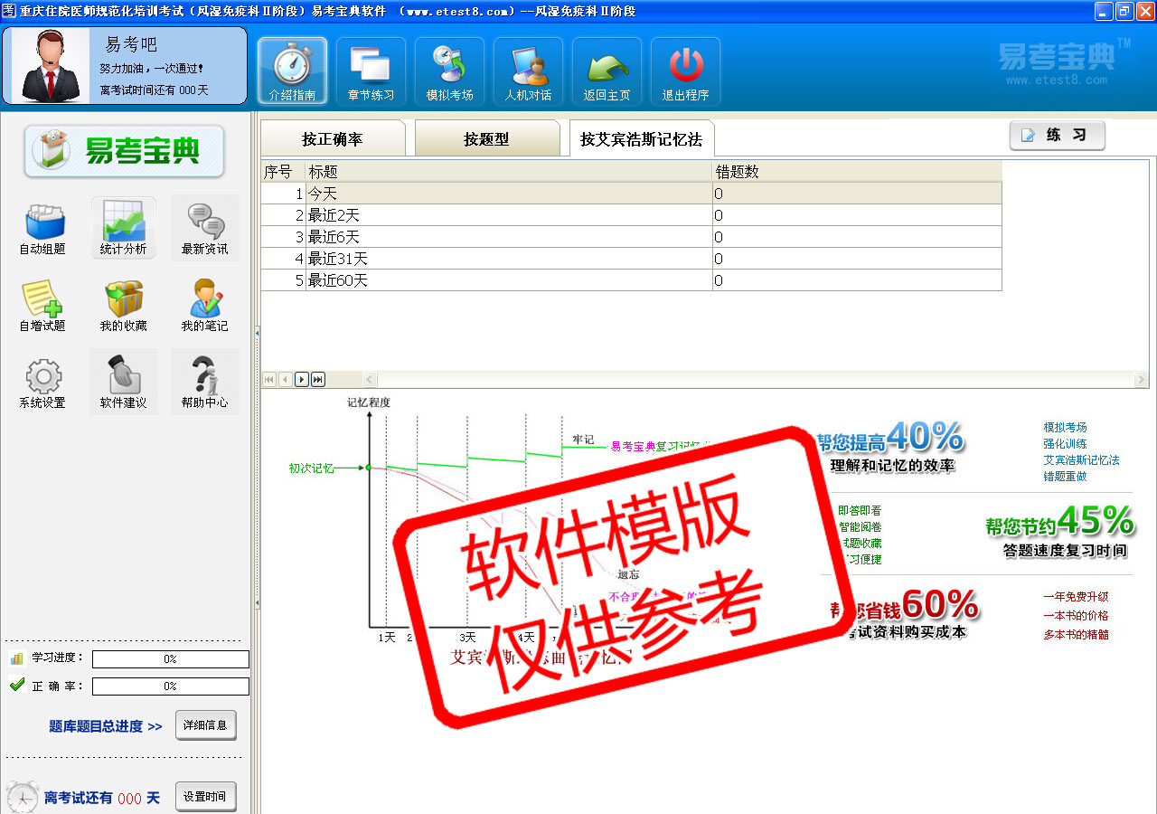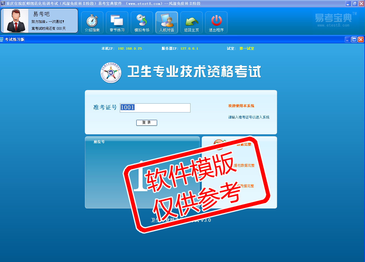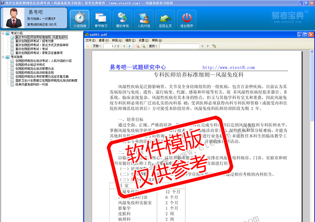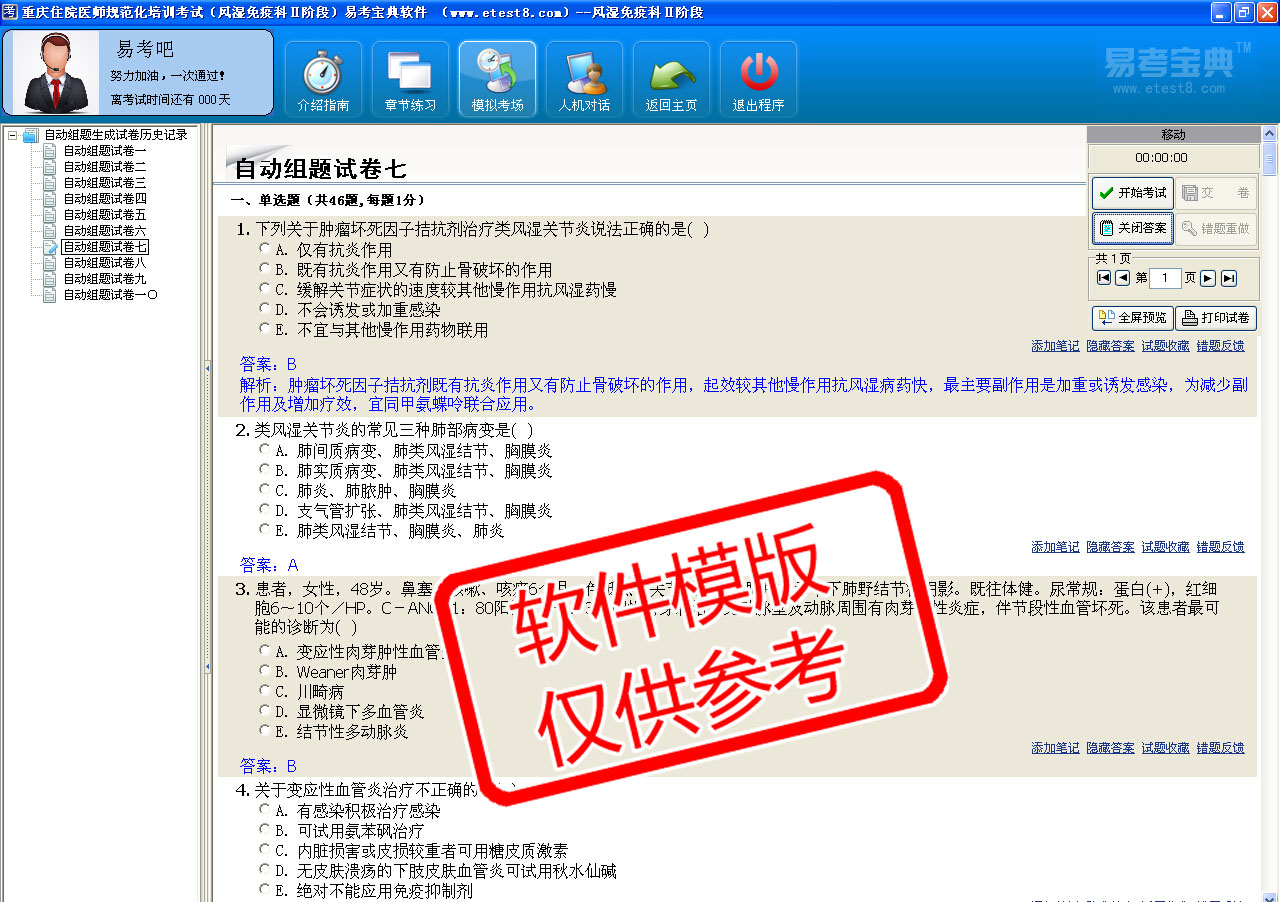 模拟试题库共有730道试题,可以任意组成7套模拟试题。题库内容主要有:干燥综合征、炎性肌病和系统性硬化症、痛风、类风湿性关节炎、系统性红斑狼疮、系统性血管炎、脊柱关节病、骨关节炎等。
