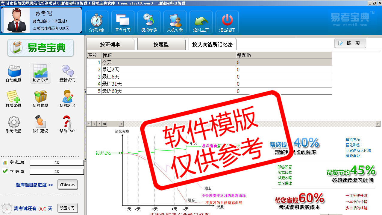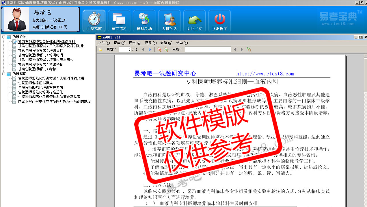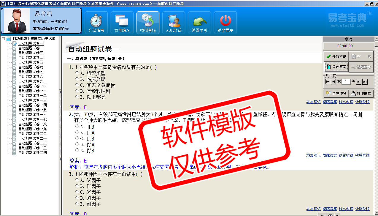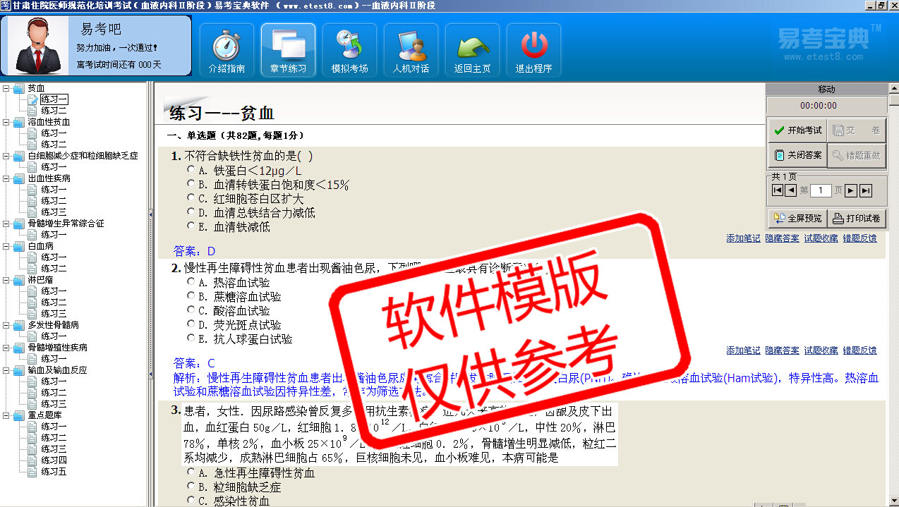 模拟试题库共有2400道试题,可以任意组成24套模拟试题。题库内容主要有:出血性疾病、多发性骨骼病、淋巴瘤、溶血性贫血、白细胞减少症和粒细胞缺少症、骨髓增生异常综合征、白血病、贫血、输血及输血反应、骨髓增殖性疾病等。