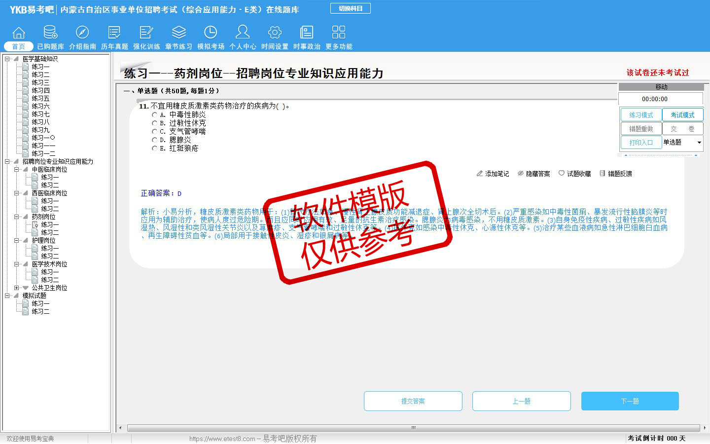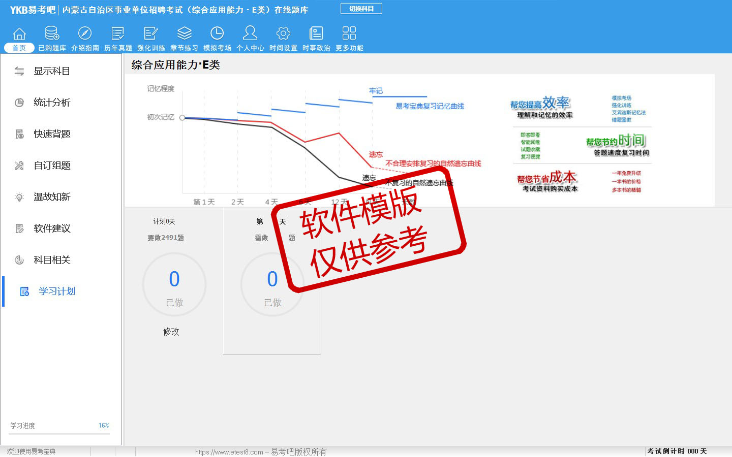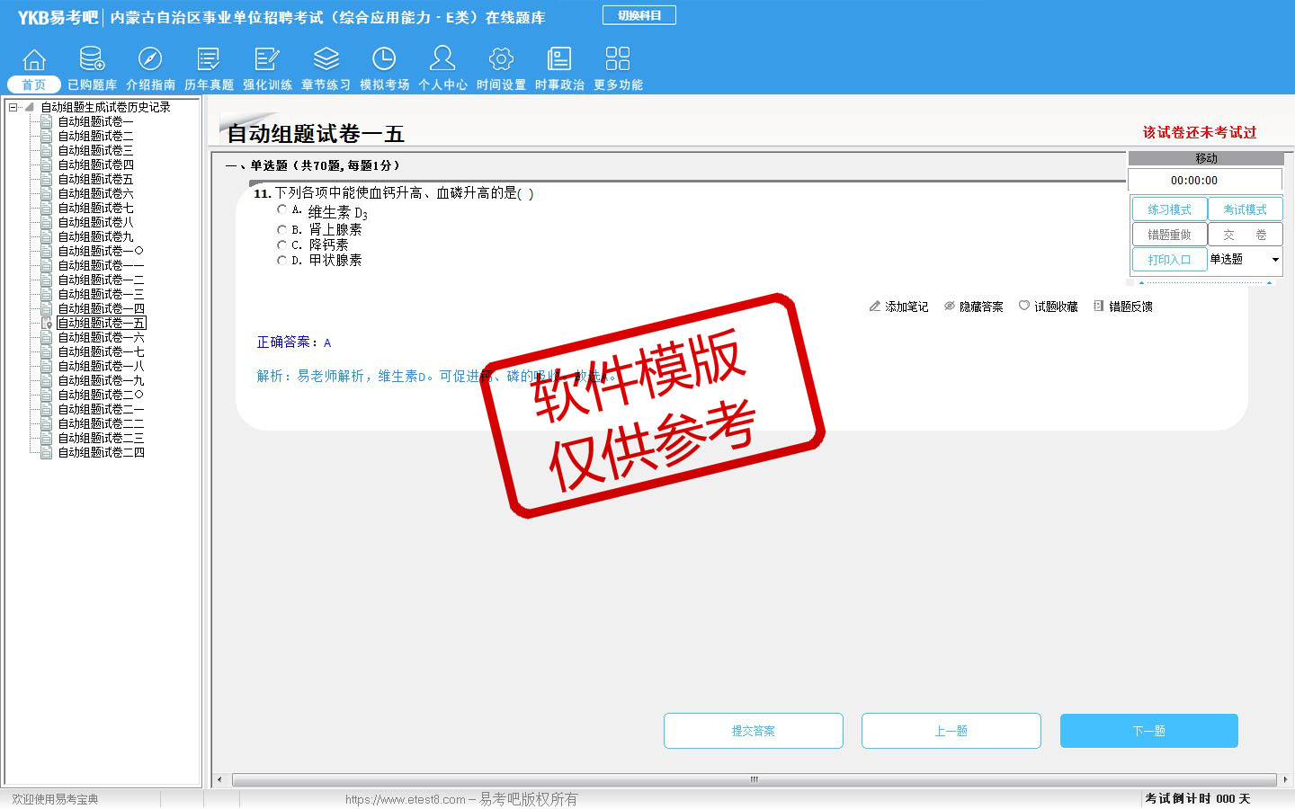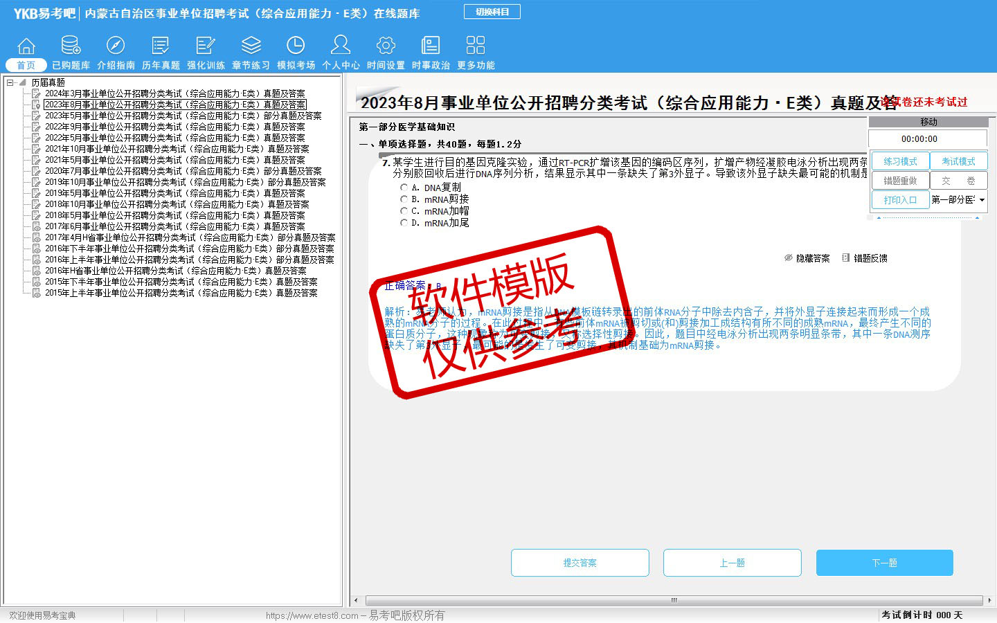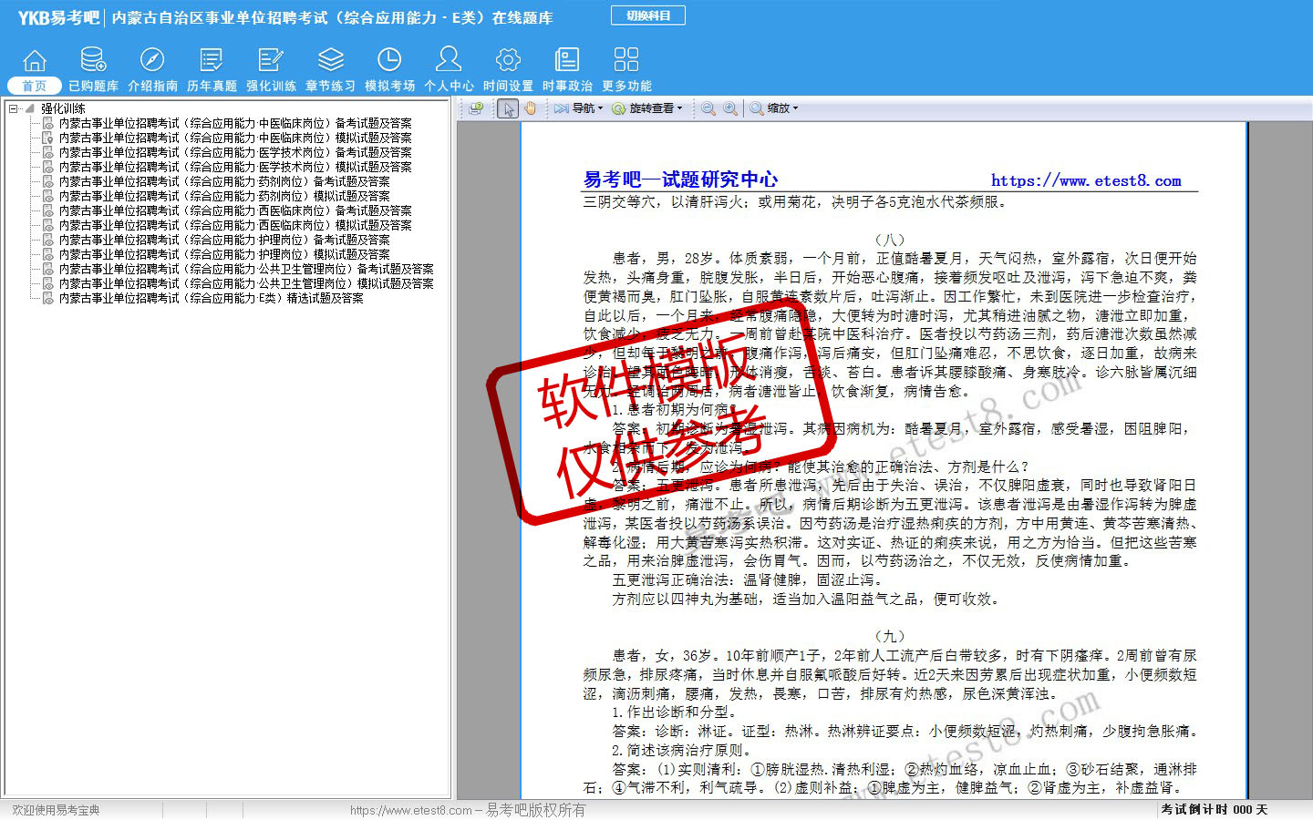 题量内容: 模拟试题库共有3023道试题,可以任意组成模拟考场试卷练习30套,历届真题有21套,另有各章节的练习试题多套,以及多条考试介绍和考试指南(辅导资料)。
