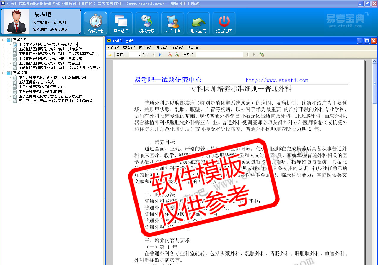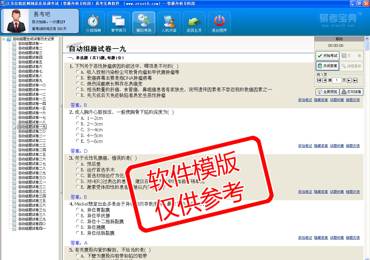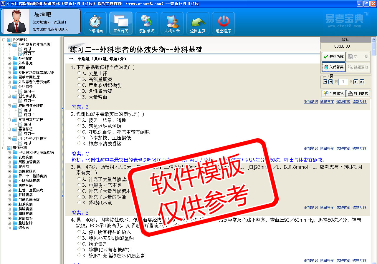 题量内容:模拟试题库共有3280道试题,可以任意组成32套模拟试题。题库内容主要有:【外科基础】外科患者的体液失衡、外科输血、外科休克、麻醉、多器官功能障碍综合征、围手术期处理、外科患者的营养支持、外科感染、创伤和战伤、肿瘤与体表肿物、复苏与重症监护、器官移植、现代外科诊疗技术;【普通外科】甲状腺和甲状旁腺疾病、乳房疾病、周围血管疾病、腹外疝、急性腹膜炎、胃、十二指肠疾病、小肠结肠疾病、阑尾疾病、肛管、直肠疾病、肝脏疾病、门静脉高压症、胆系疾病、胰腺疾病、脾脏疾病、腹部损伤、腹腔脓肿等。