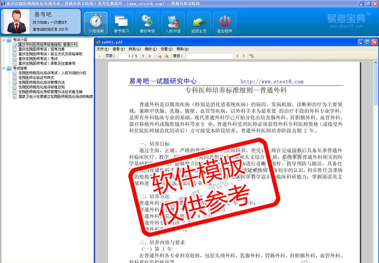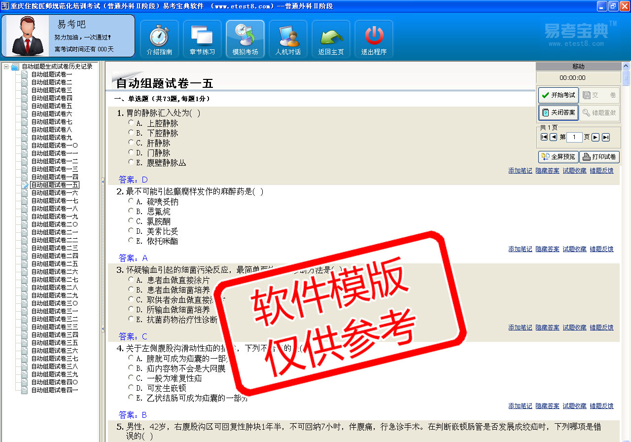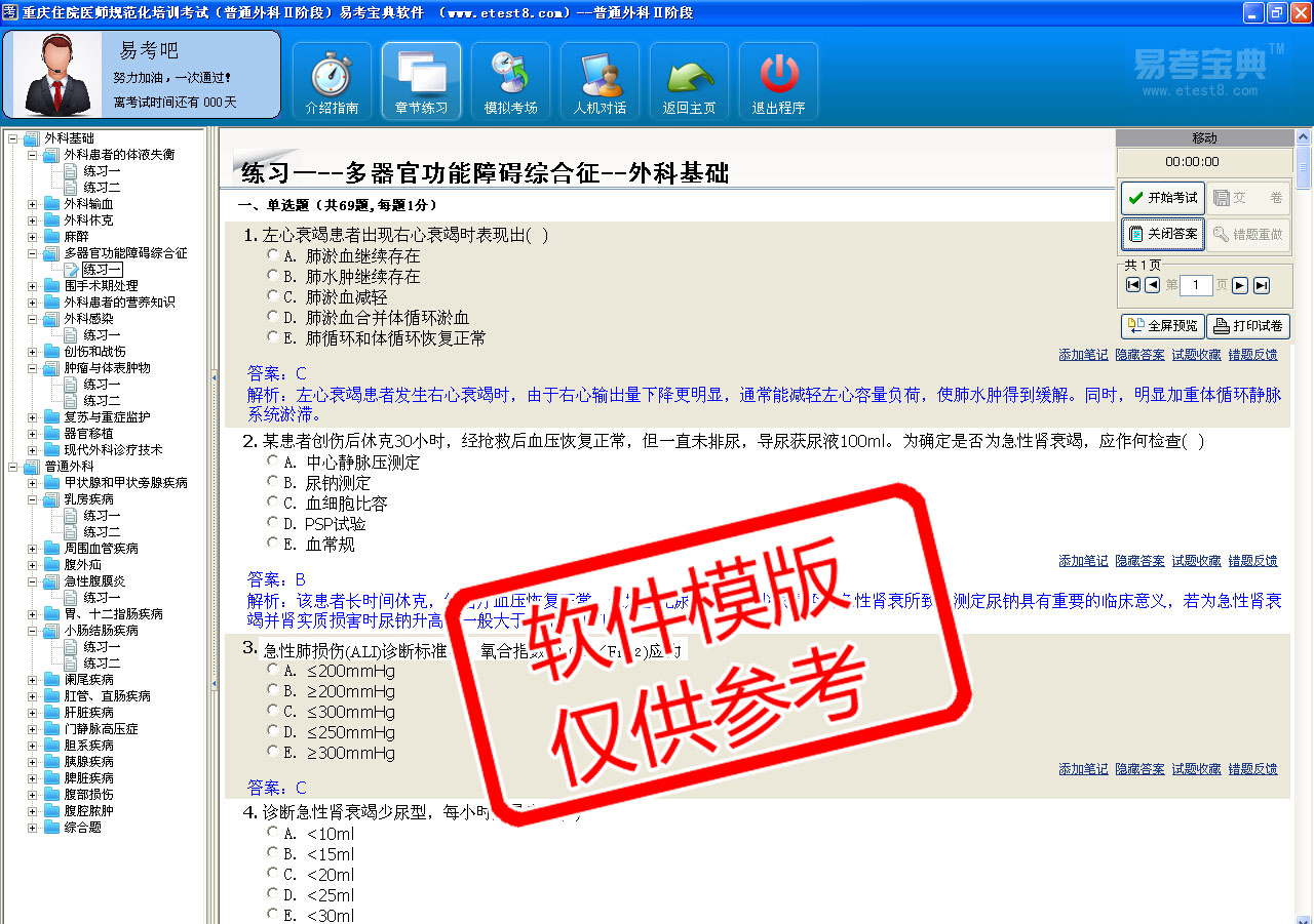 题量内容:模拟试题库共有3280道试题,可以任意组成32套模拟试题。题库内容主要有:【外科基础】外科患者的体液失衡、外科输血、外科休克、麻醉、多器官功能障碍综合征、围手术期处理、外科患者的营养支持、外科感染、创伤和战伤、肿瘤与体表肿物、复苏与重症监护、器官移植、现代外科诊疗技术;【普通外科】甲状腺和甲状旁腺疾病、乳房疾病、周围血管疾病、腹外疝、急性腹膜炎、胃、十二指肠疾病、小肠结肠疾病、阑尾疾病、肛管、直肠疾病、肝脏疾病、门静脉高压症、胆系疾病、胰腺疾病、脾脏疾病、腹部损伤、腹腔脓肿等。