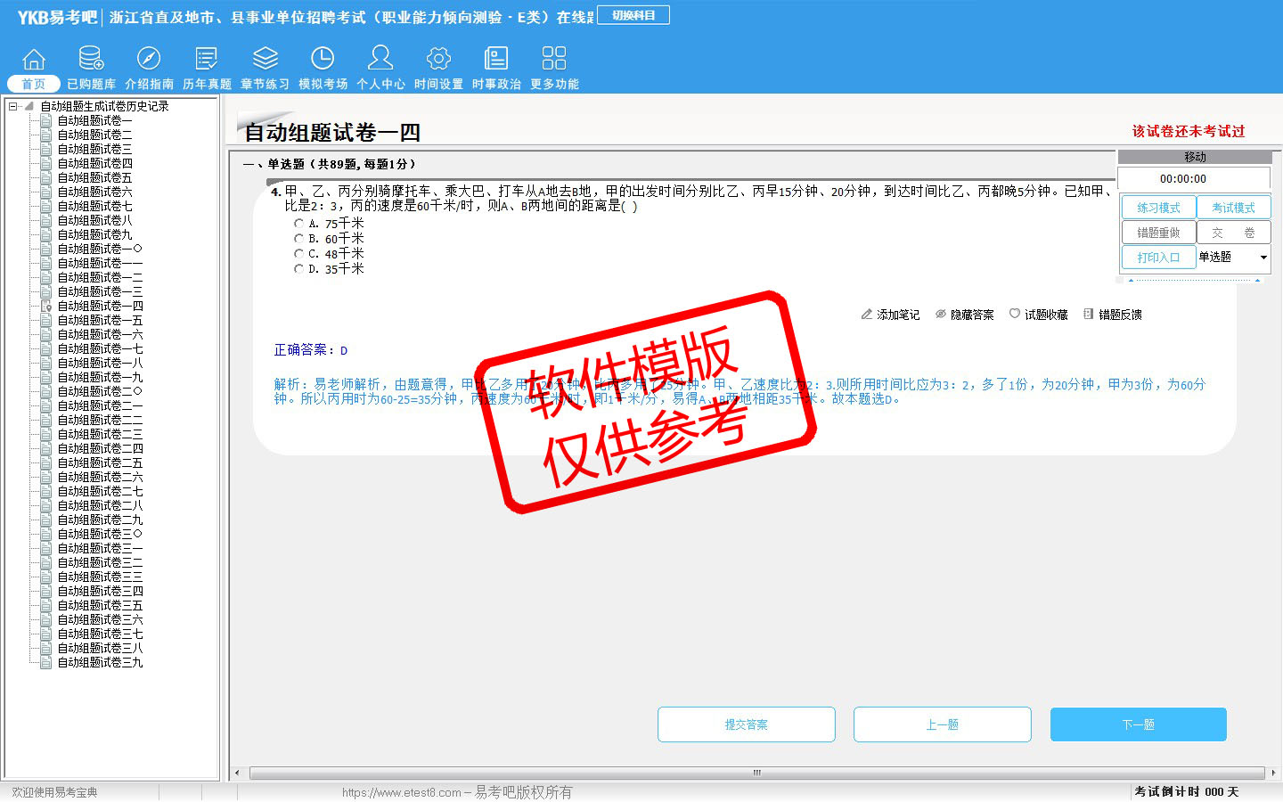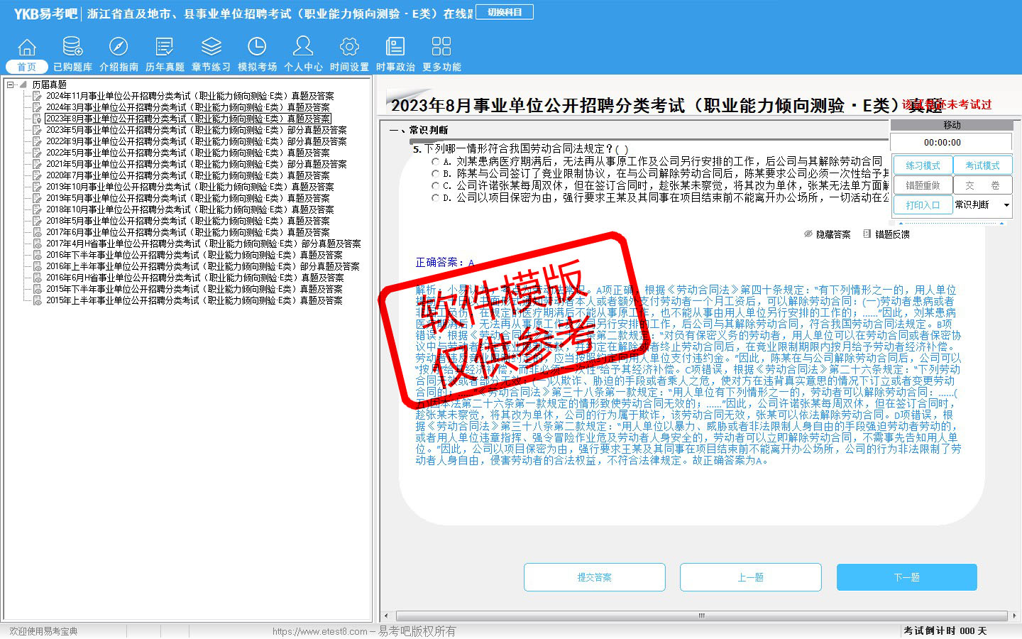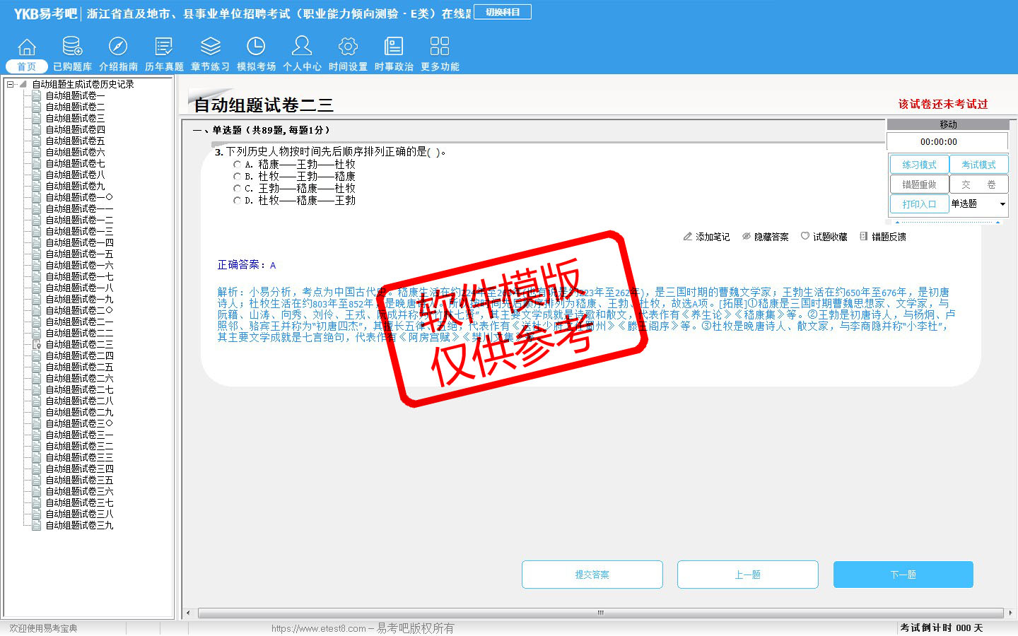 题量内容: 模拟试题库共有3899道试题,可以任意组成模拟考场试卷练习38套,历届真题有10套,另有各章节的练习试题多套,以及多条考试介绍和考试指南(辅导资料)。