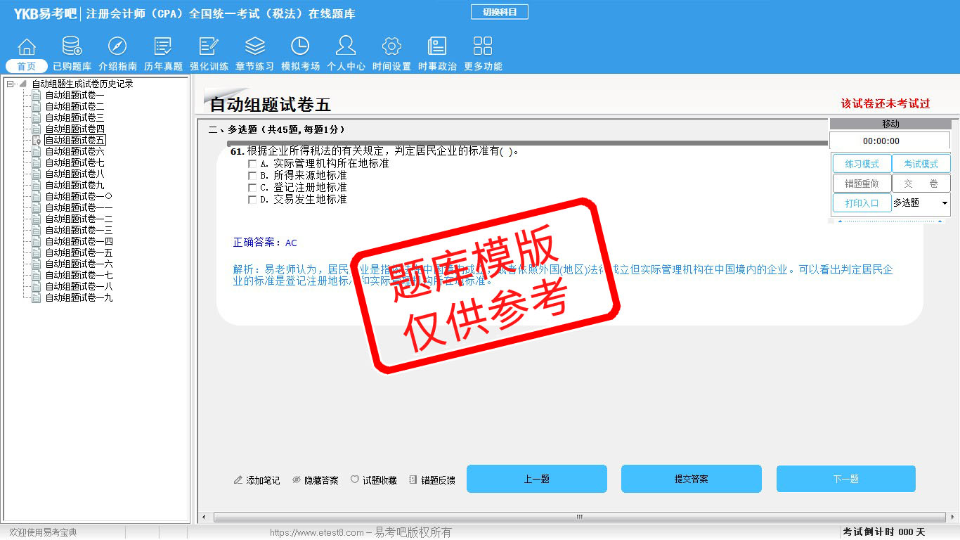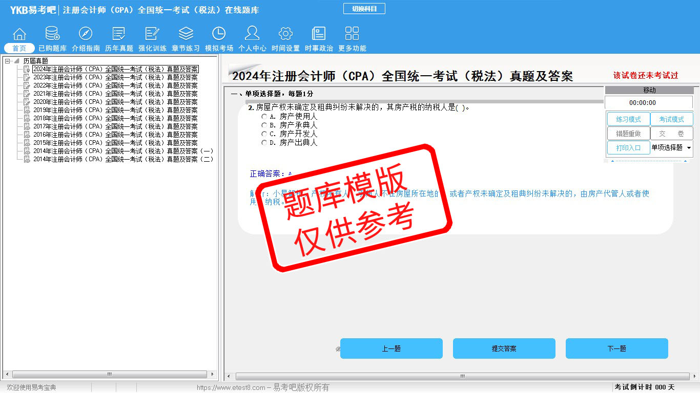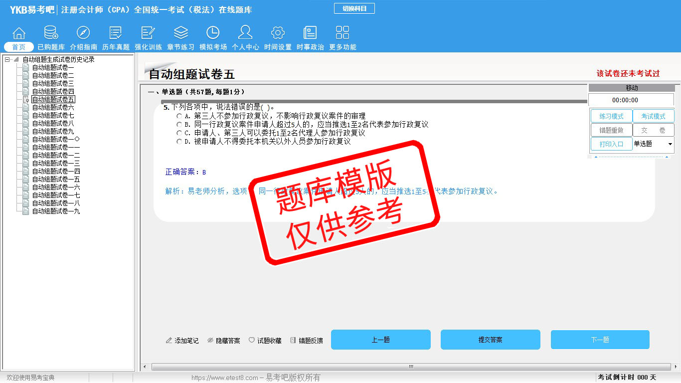 题量内容: 模拟试题库共有1921道试题,可以任意组成模拟考场试卷练习19套,强化训练有11套,历届真题有12套,另有各章节的练习试题多套,以及多条考试介绍和考试指南(辅导资料)。