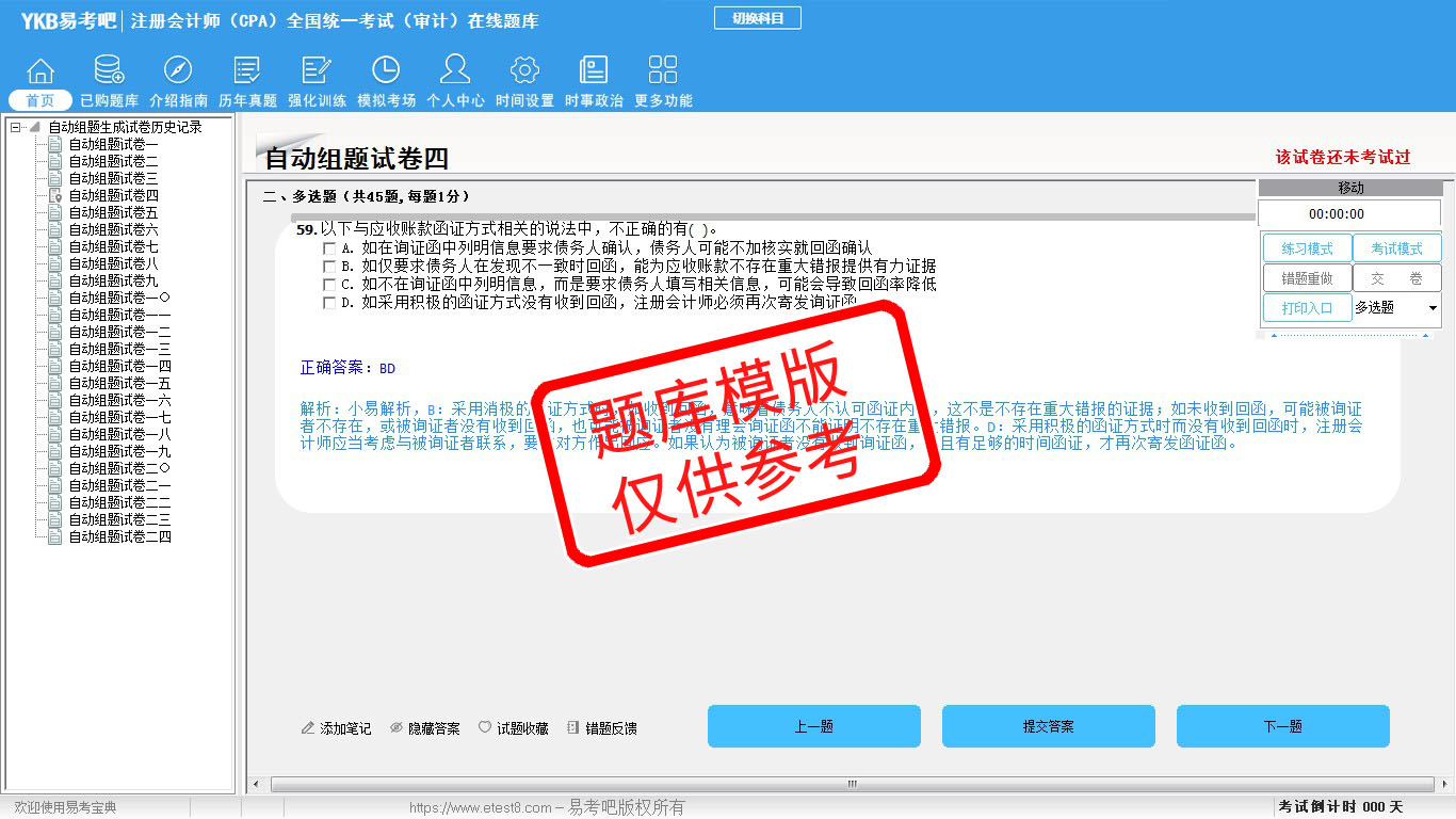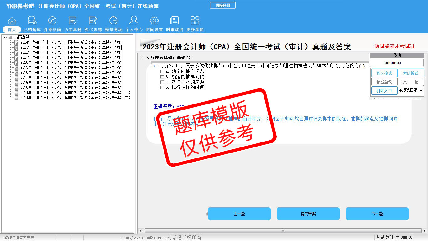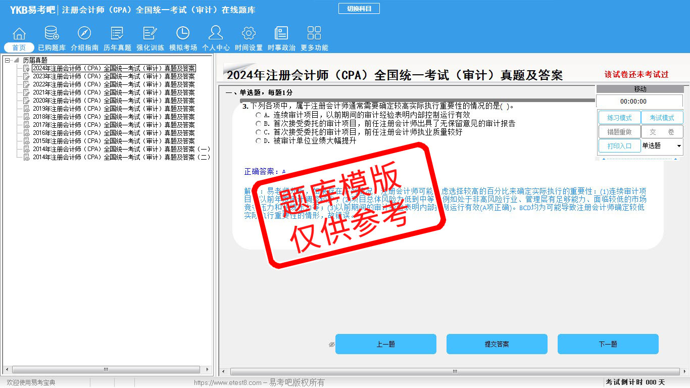 题量内容: 模拟试题库共有2403道试题,可以任意组成模拟考场试卷练习24套,强化训练有13套,历届真题有12套,以及多条考试介绍和考试指南(辅导资料)。