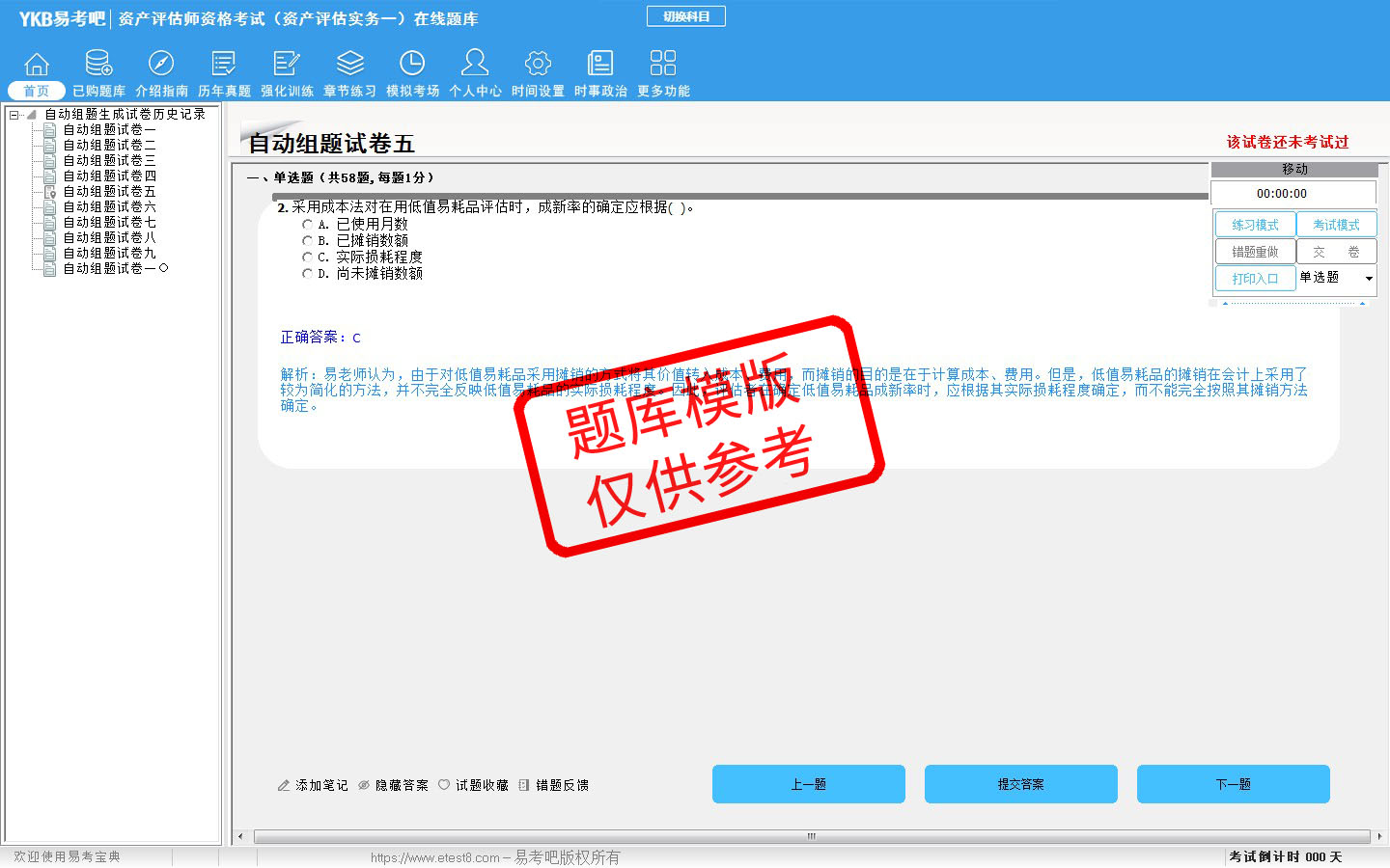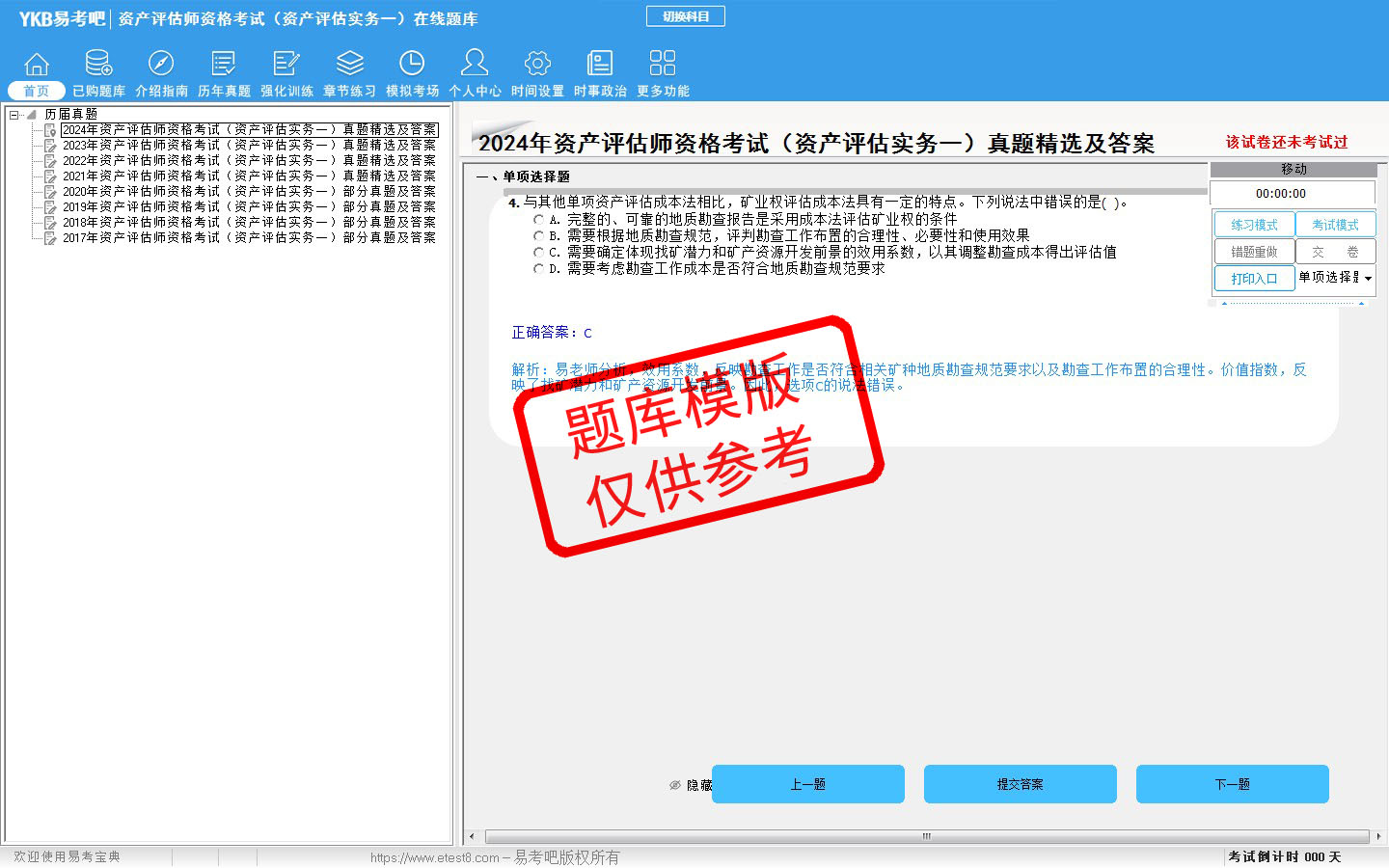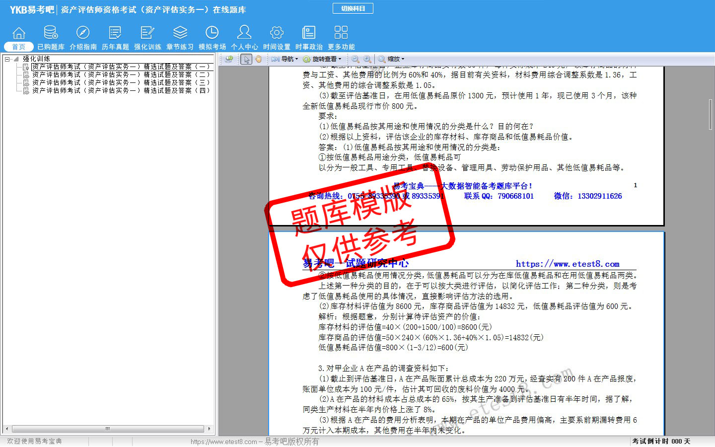 题量内容:模拟试题库共有1022道试题,可以任意组成模拟考场试卷练习10套,强化训练有4套,历届真题有8套,另有各章节的练习试题多套,以及多条考试介绍和考试指南(辅导资料)。