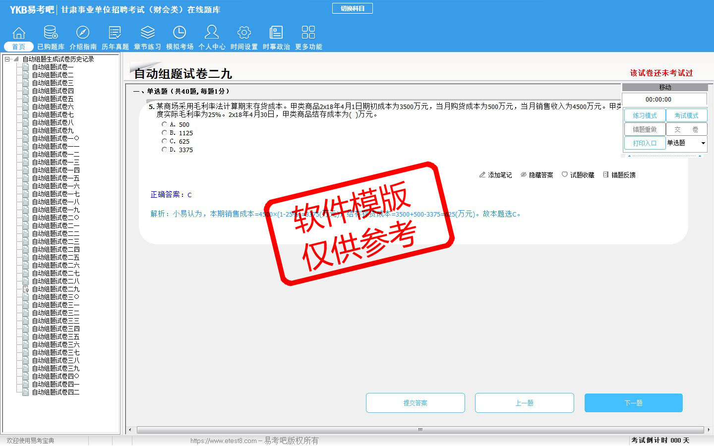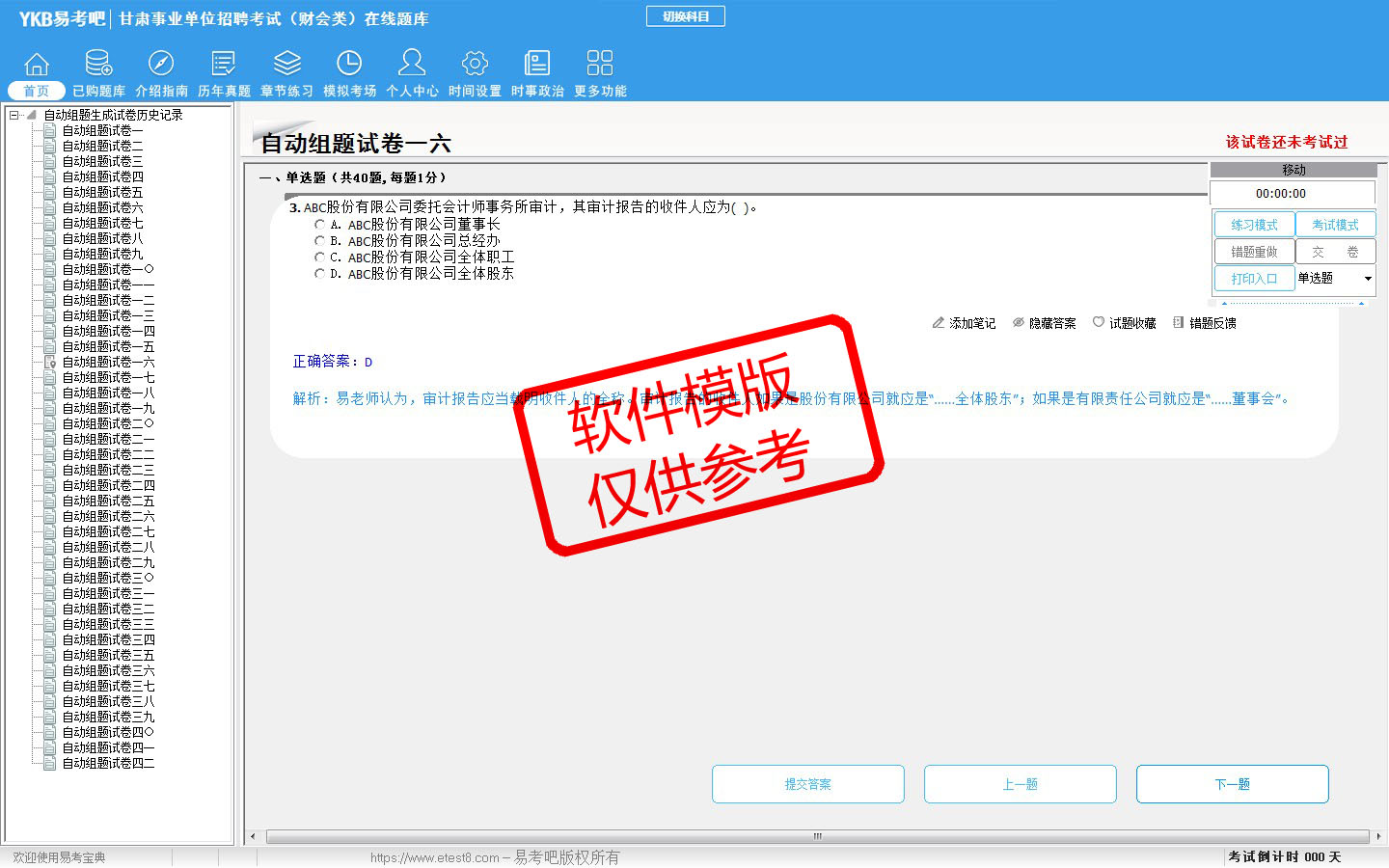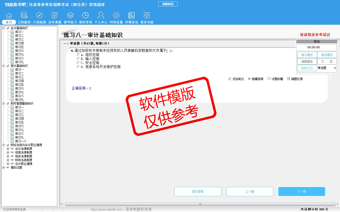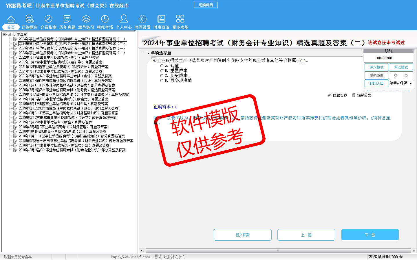 题量内容: 模拟试题库共有4211道试题,可以任意组成模拟考场试卷练习42套,历届真题有6套,另有各章节的练习试题多套,以及多条考试介绍和考试指南(辅导资料)。