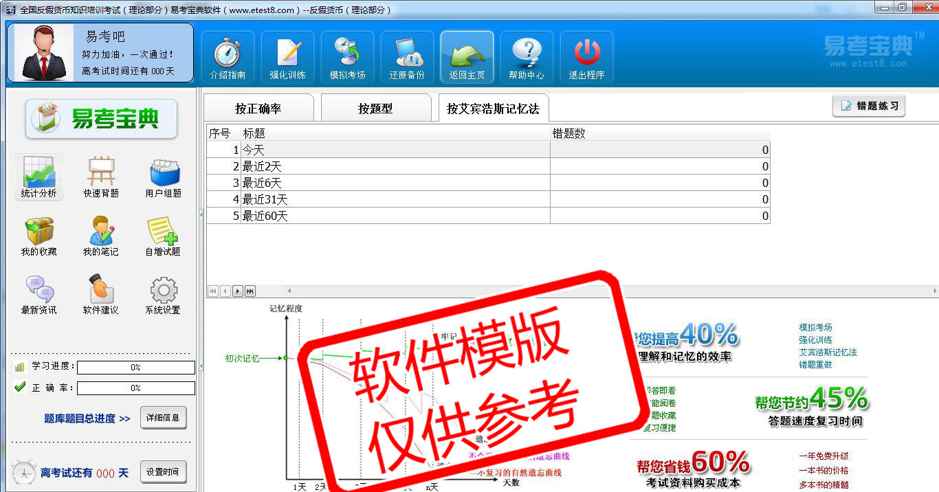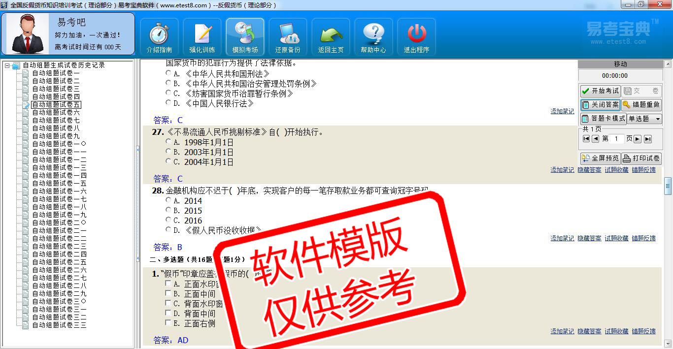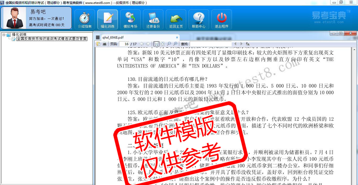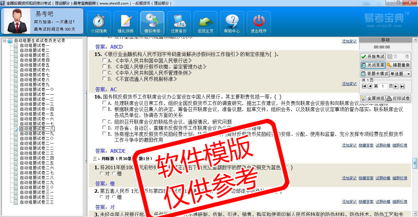 题量内容: 模拟试题库共有2385道试题,可以任意组成模拟考场试卷练习33套,强化训练有1套,以及多条考试介绍和考试指南(辅导资料)。