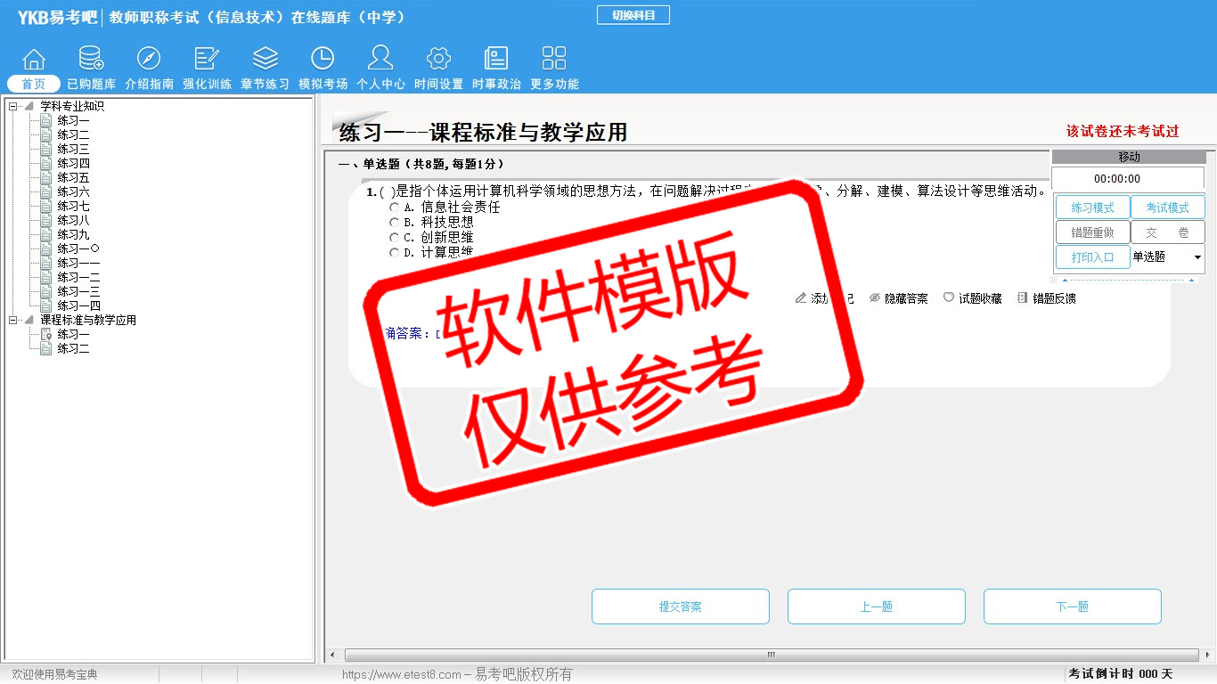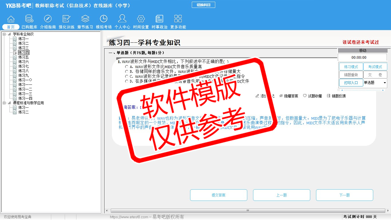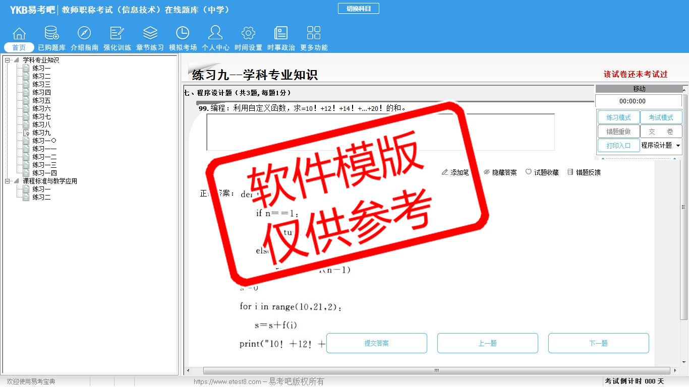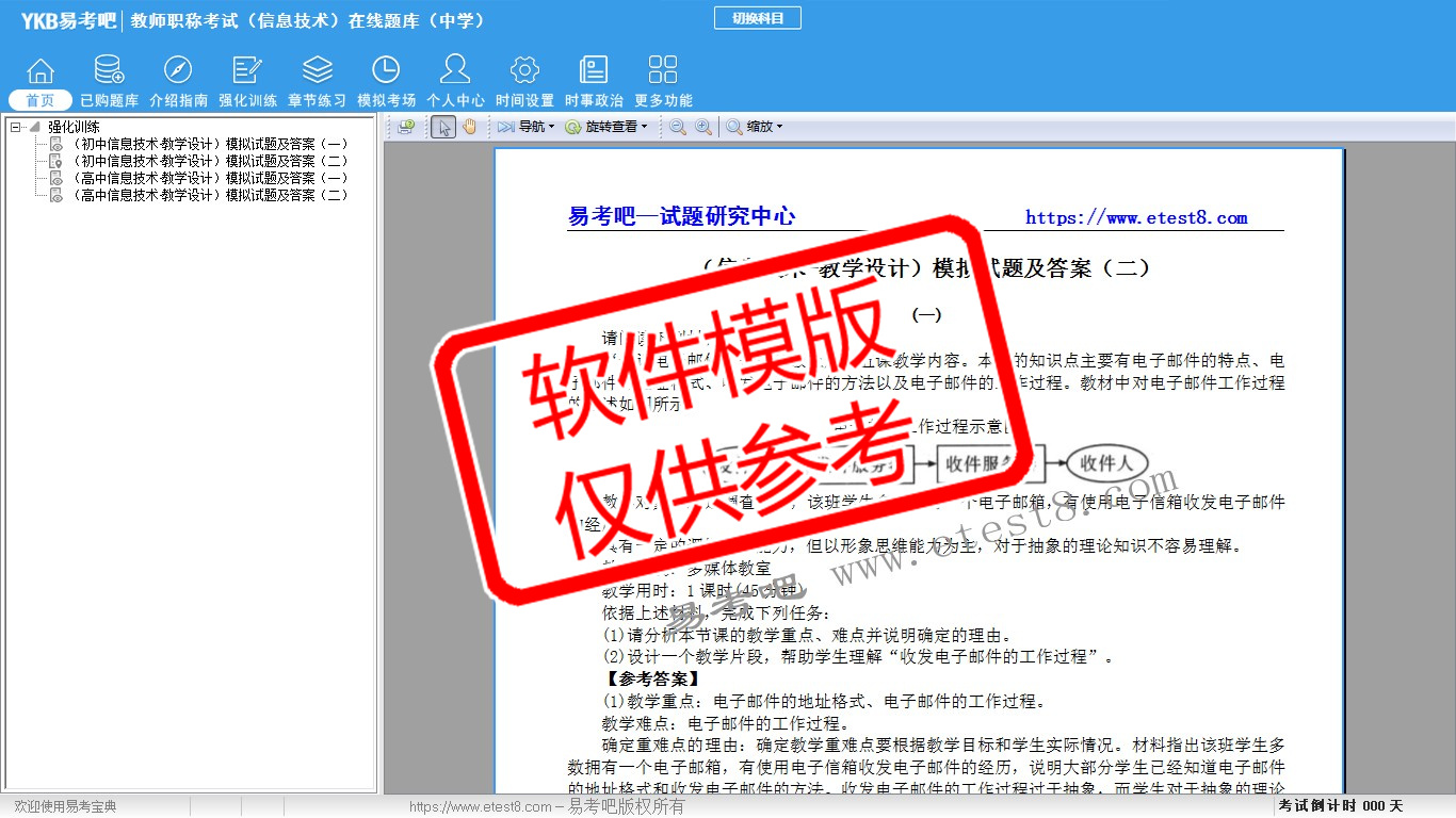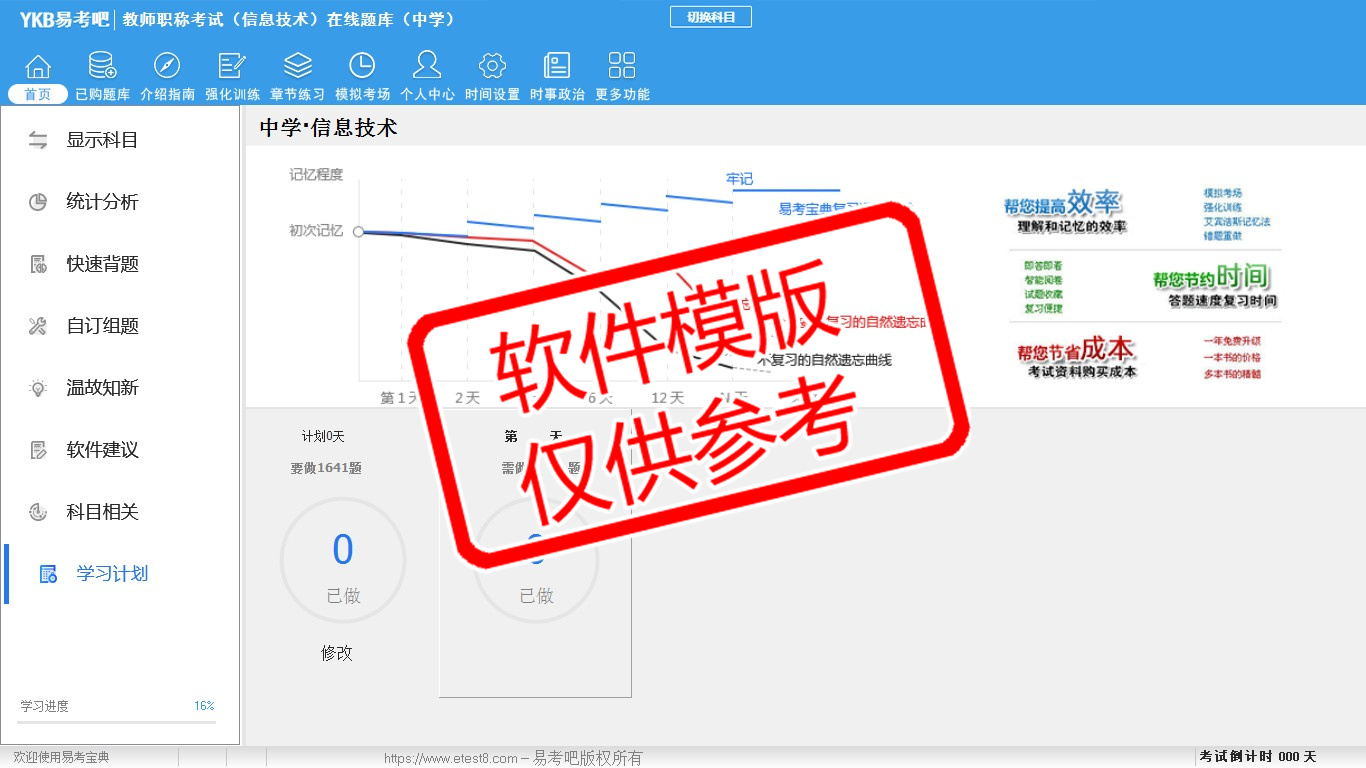 题量内容: 模拟试题库共有1641道试题,可以任意组成模拟考场试卷练习16套,强化训练有4套,另有各章节的练习试题多套,以及多条考试介绍和考试指南(辅导资料)。
