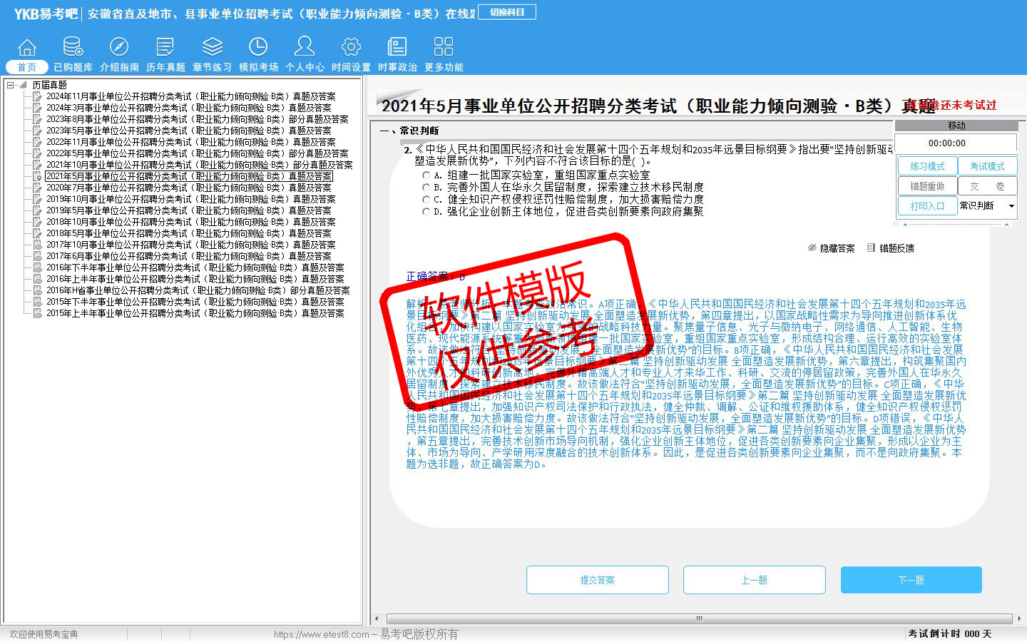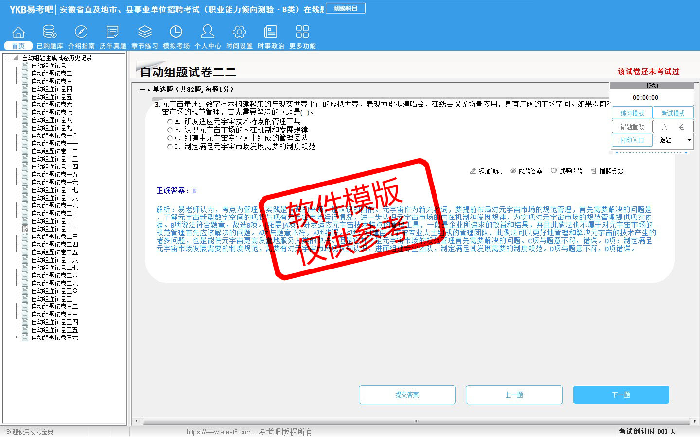 题量内容: 模拟试题库共有3636道试题,可以任意组成模拟考场试卷练习36套,历届真题有11套,另有各章节的练习试题多套,以及多条考试介绍和考试指南(辅导资料)。