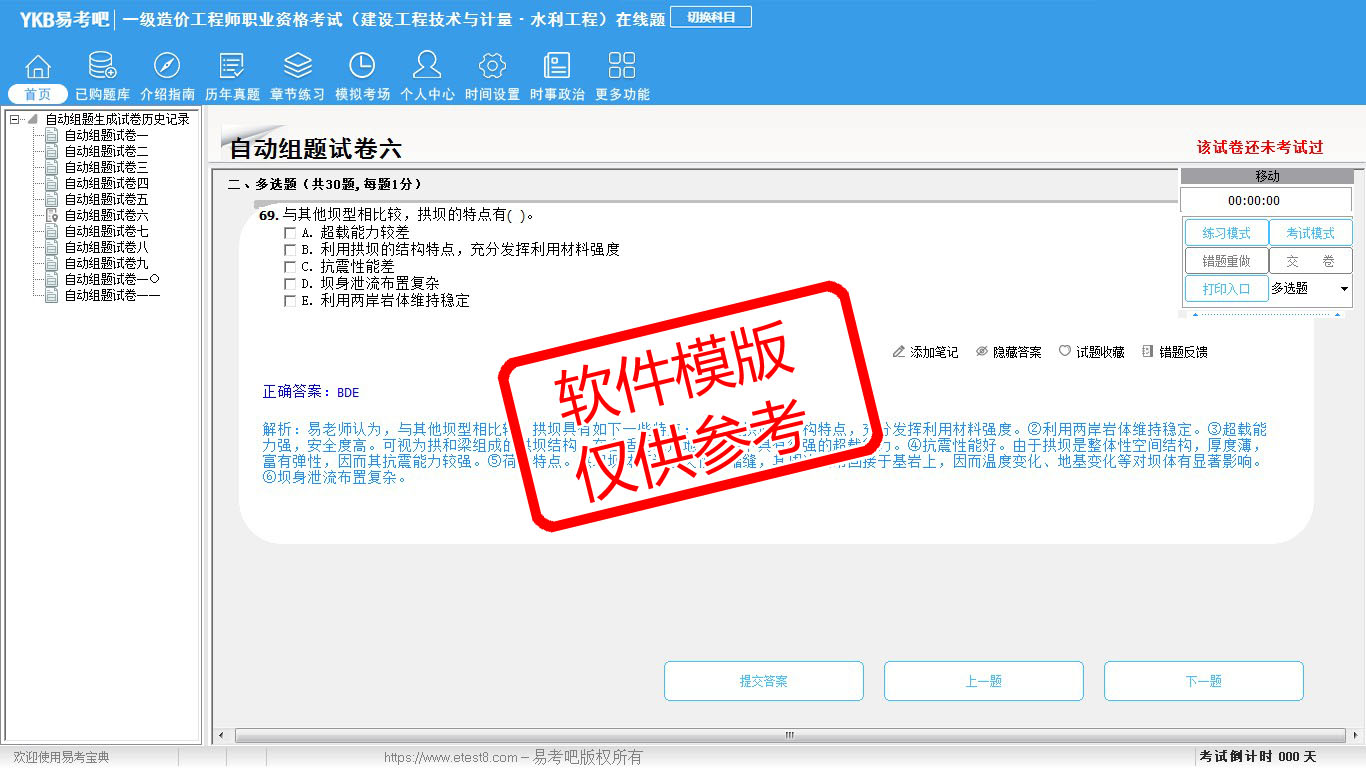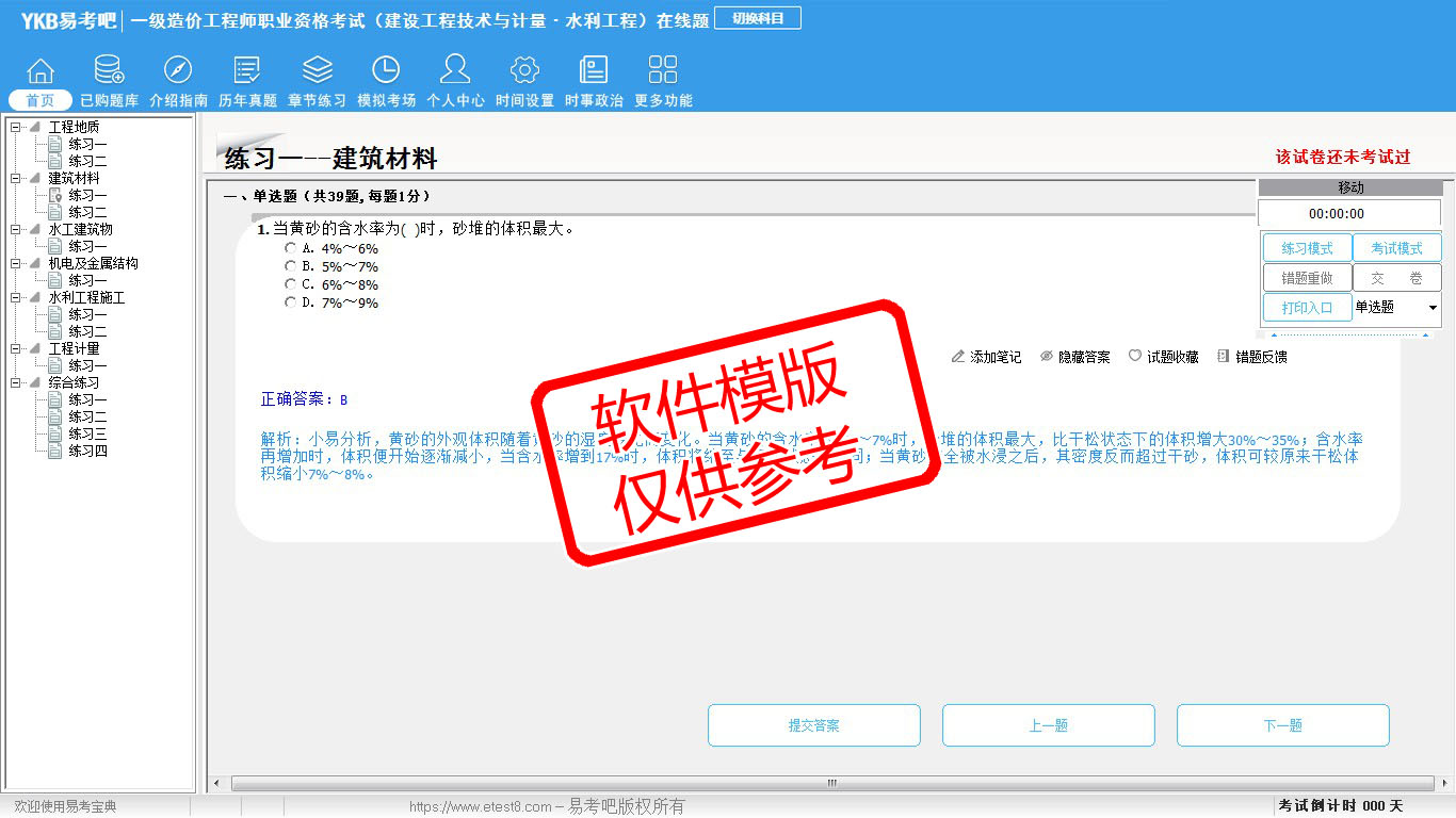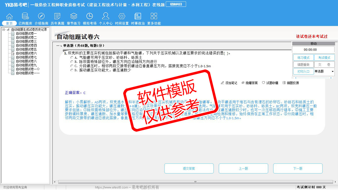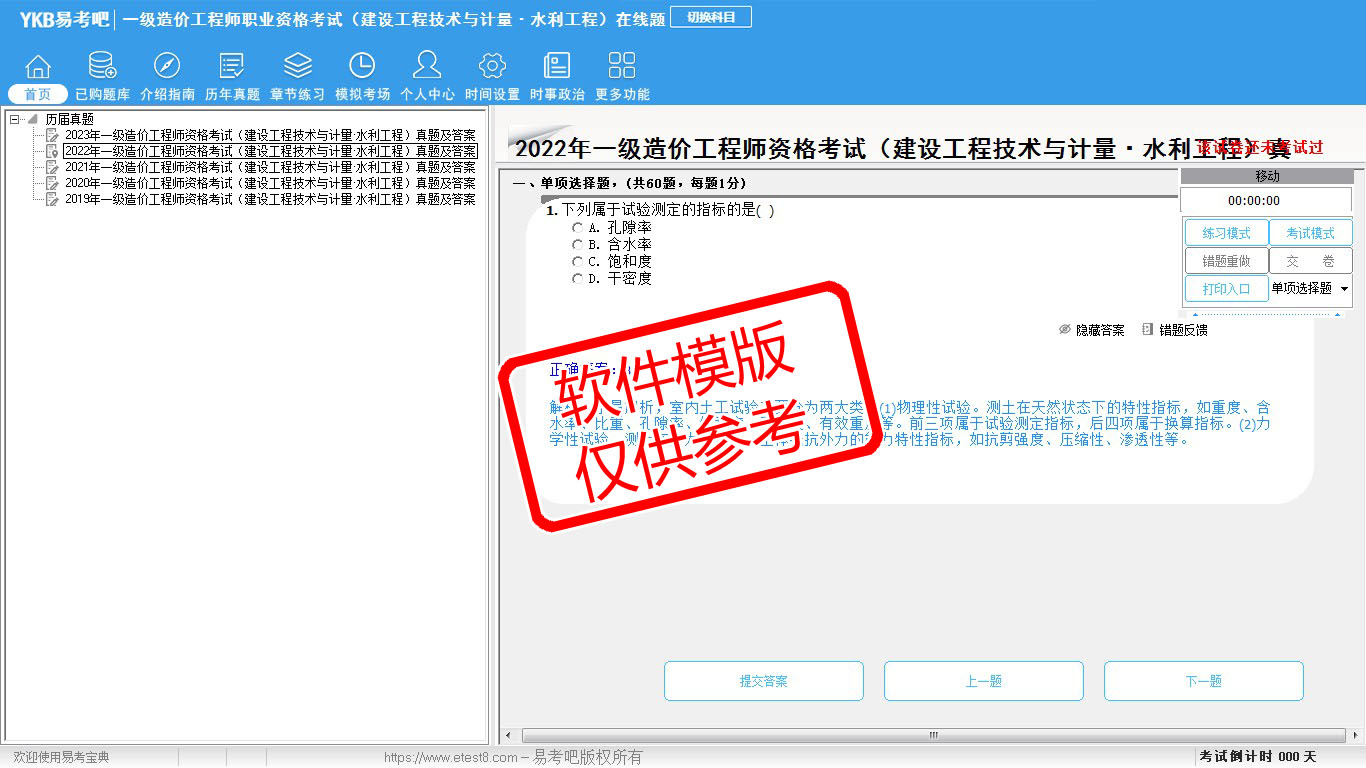 题量内容: 模拟试题库共有1109道试题,可以任意组成模拟考场试卷练习11套,历届真题有5套,另有各章节的练习试题多套,以及多条考试介绍和考试指南(辅导资料)。