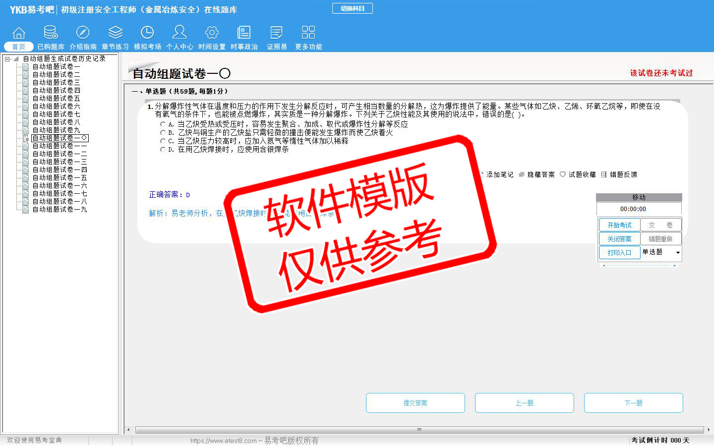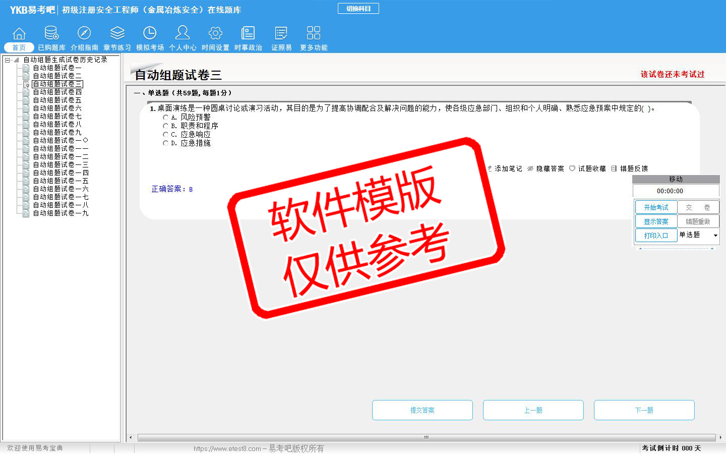 题量内容: 模拟试题库共有1931道试题,可以任意组成模拟考场试卷练习19套,另有各章节的练习试题多套,以及多条考试介绍和考试指南(辅导资料)。