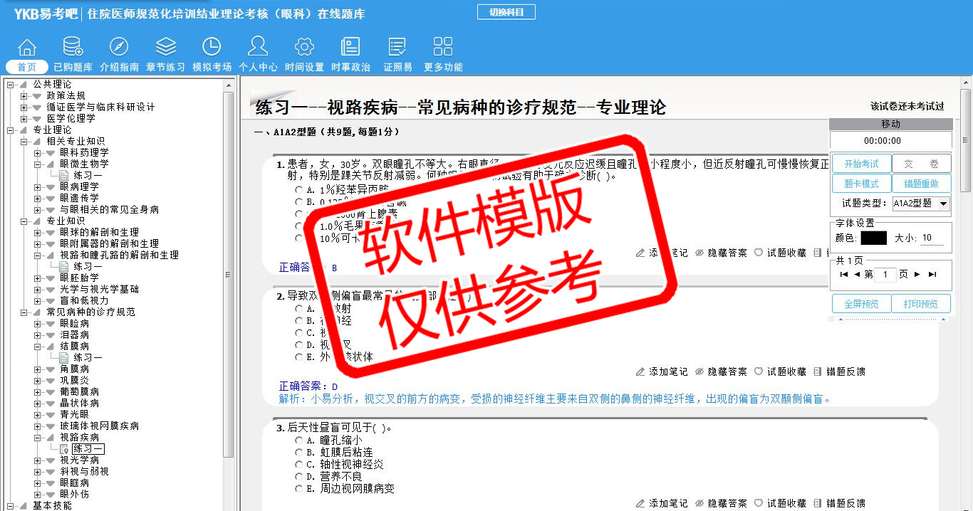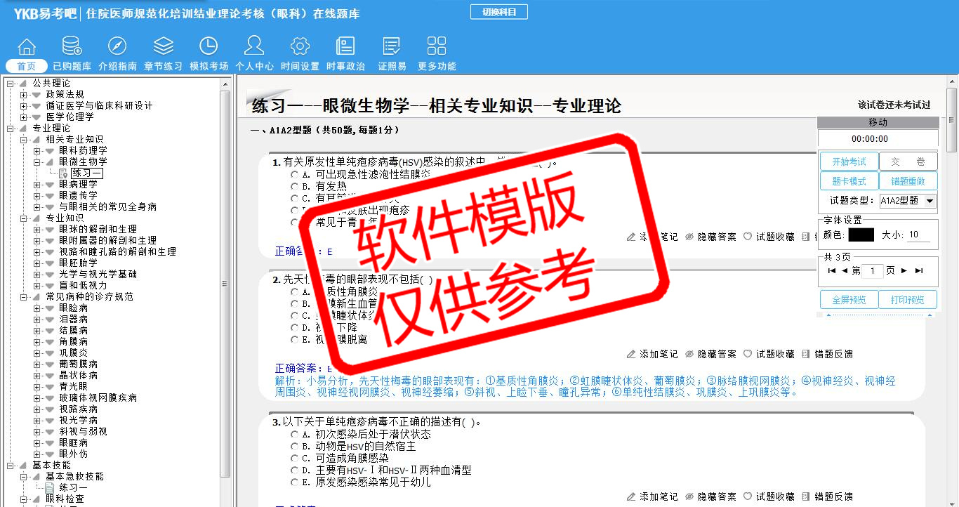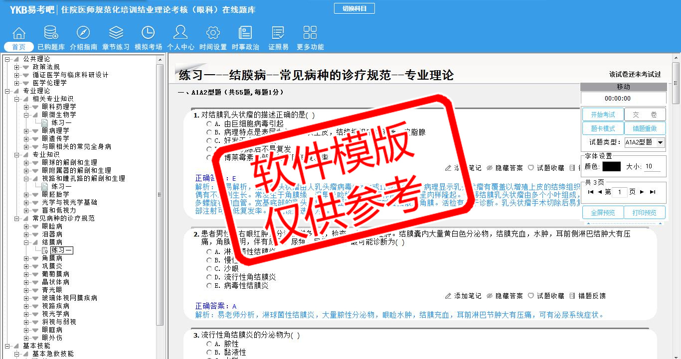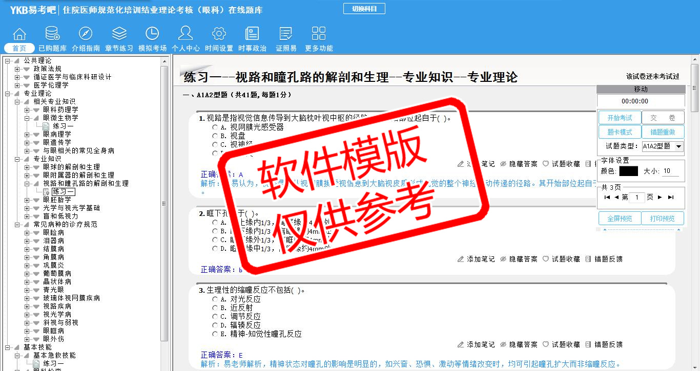 2026年住院医师规范化培训结业理论考核(眼科)易考宝典软件(手机/网页版)是《易考宝典》考试系列软件之一,是专门为参加“住院医师职业资格考试”的朋友量身定做的自我测试系统,是个人、培训学校进行考试前训练、备考冲刺的提分技巧考试平台,题型丰富,图文并茂,内容全面,题库设计符合考试新大纲,海量试题。软件包括了富有价值的模拟考场,有计时打分等功能,就像亲身体会考试一样。