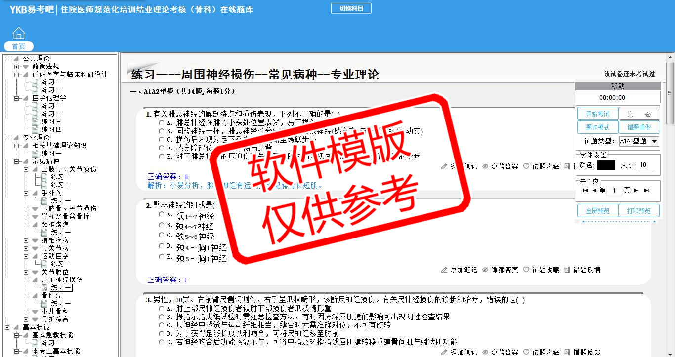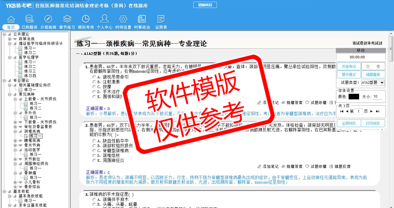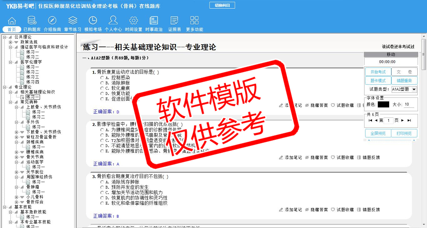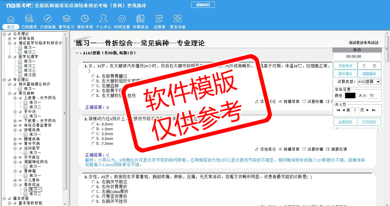 2026年住院医师规范化培训结业理论考核(骨科)易考宝典软件(手机/网页版)是《易考宝典》考试系列软件之一,是专门为参加“住院医师职业资格考试”的朋友量身定做的自我测试系统,是个人、培训学校进行考试前训练、备考冲刺的提分技巧考试平台,题型丰富,图文并茂,内容全面,题库设计符合考试新大纲,海量试题。软件包括了富有价值的模拟考场,有计时打分等功能,就像亲身体会考试一样。