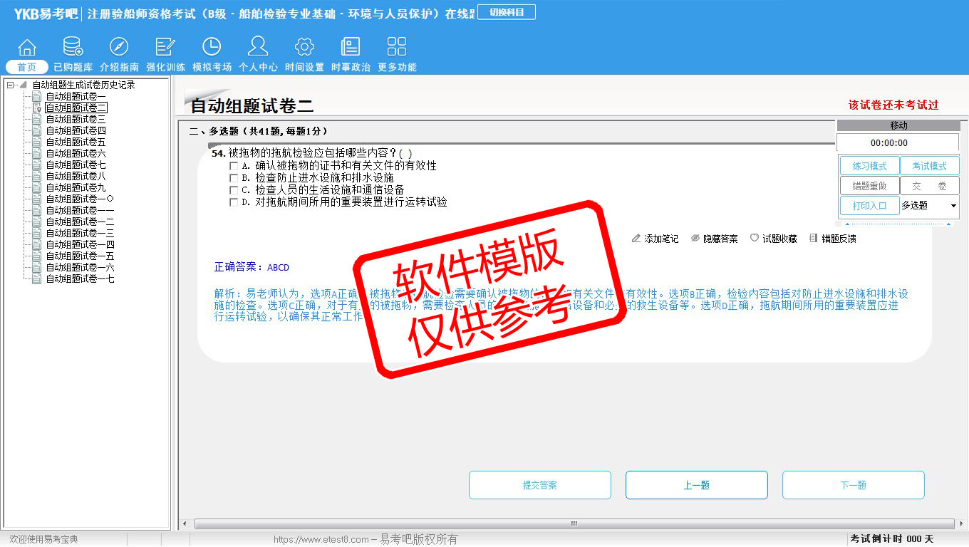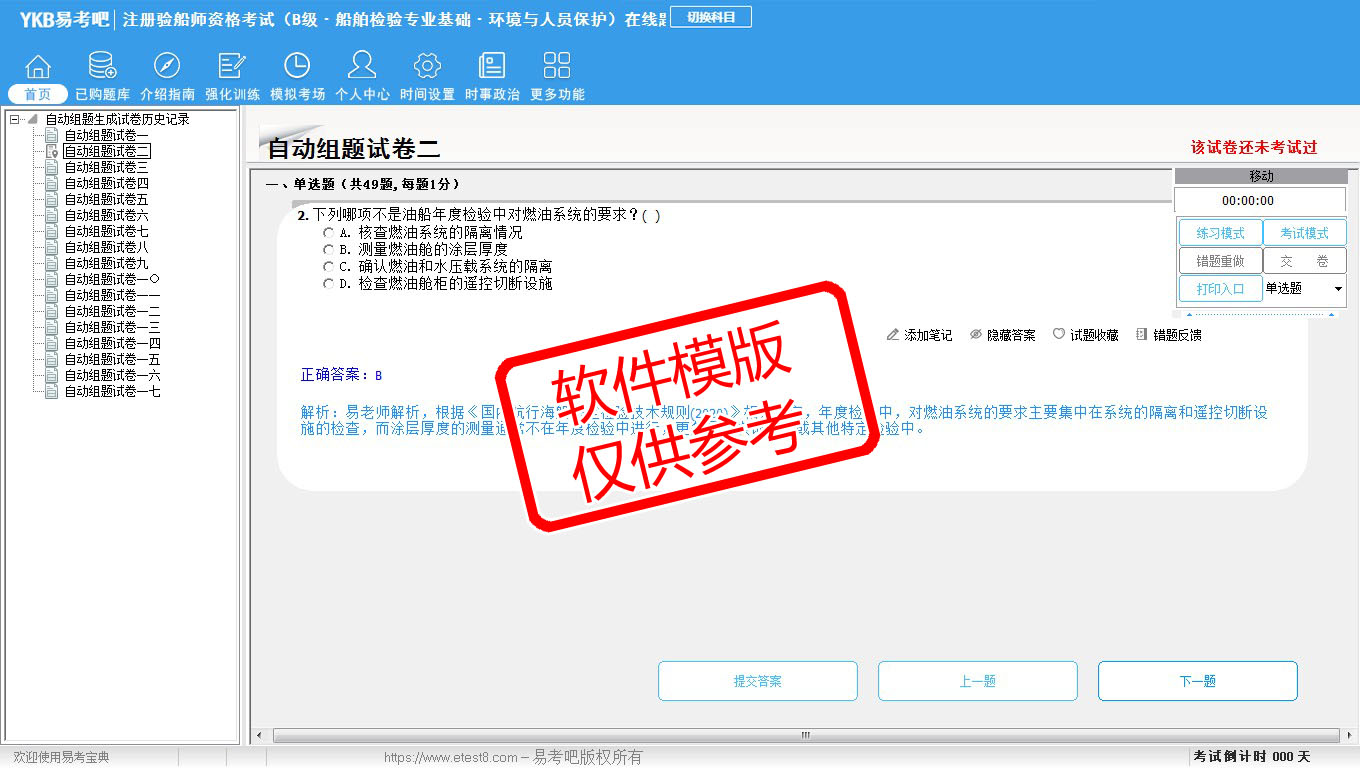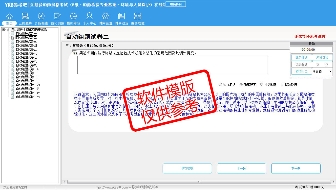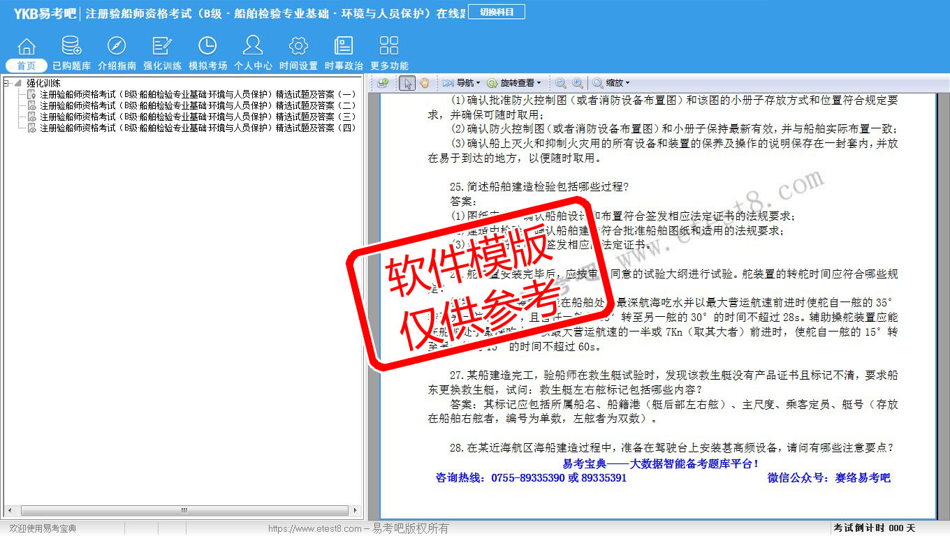2026年注册验船师资格考试(B级·船舶检验专业基础·环境与人员保护)易考宝典软件(手机/网页版)是《易考宝典》考试系列软件之一,是专门为参加“注册验船师职业资格考试”的朋友量身定做的自我测试系统,是个人、培训学校进行考试前训练、备考冲刺的提分技巧考试平台,题型丰富,图文并茂,内容全面,题库设计符合考试新大纲,海量试题。软件包括了富有价值的模拟考场,有计时打分等功能,就像亲身体会考试一样。