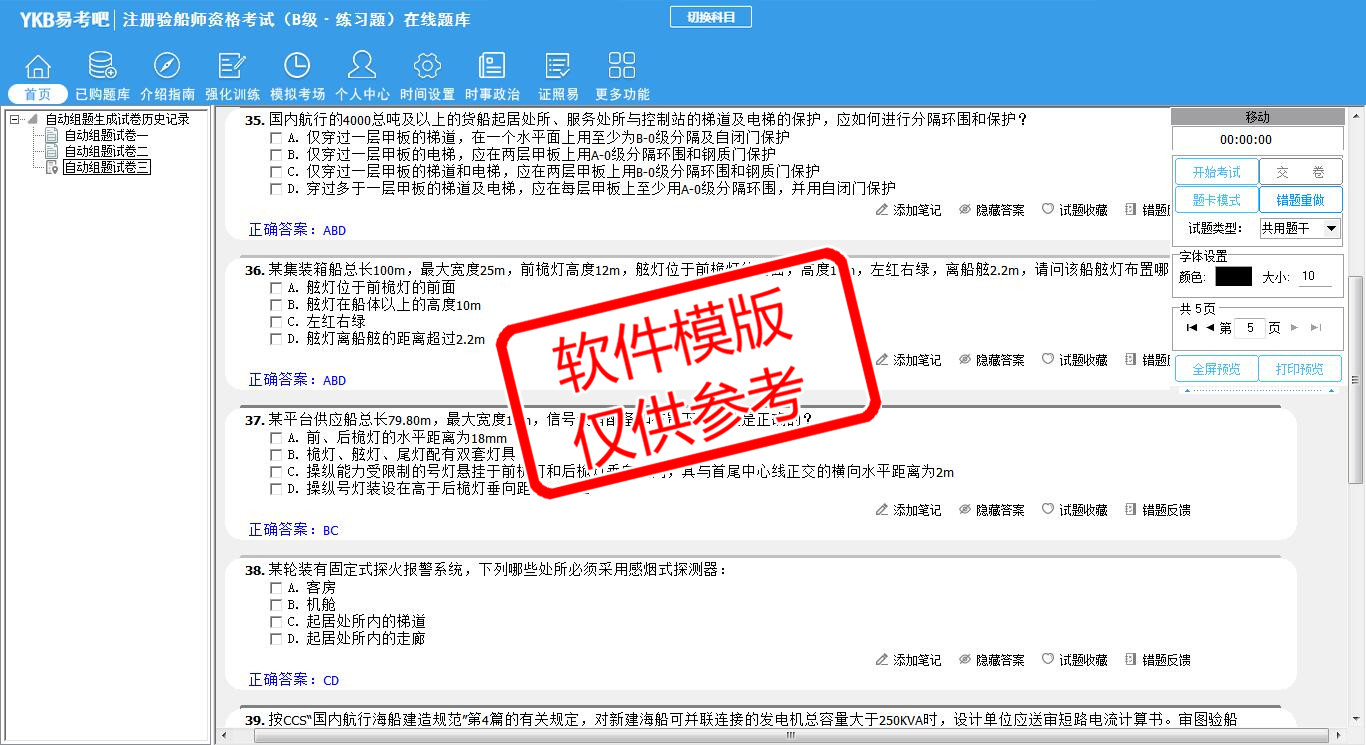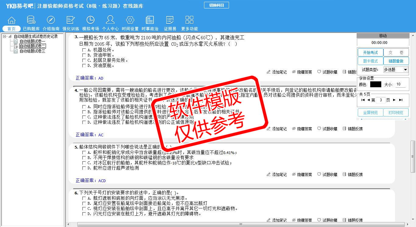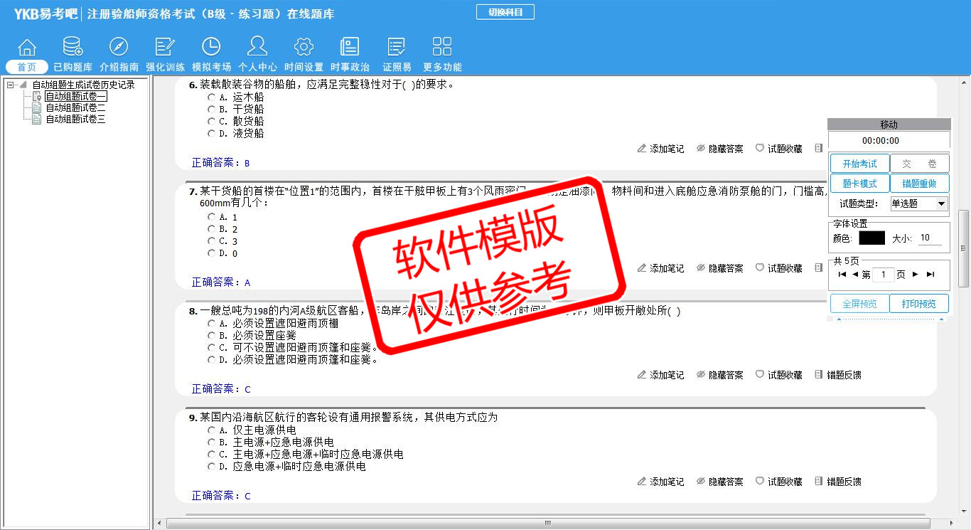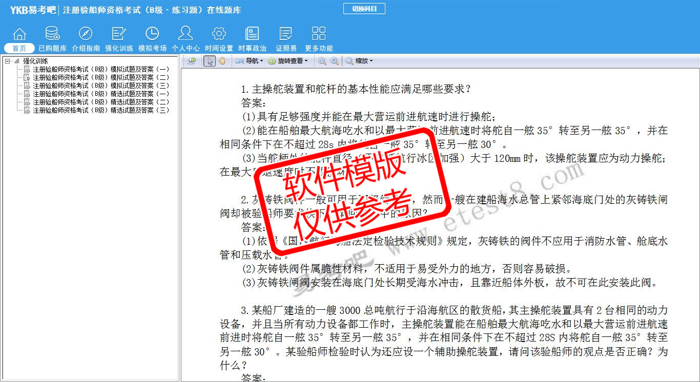 2026年注册验船师资格考试(B级·练习题)易考宝典软件(手机/网页版)是《易考宝典》考试系列软件之一,是专门为参加“注册验船师职业资格考试”的朋友量身定做的自我测试系统,是个人、培训学校进行考试前训练、备考冲刺的提分技巧考试平台,题型丰富,图文并茂,内容全面,题库设计符合考试新大纲,海量试题。软件包括了富有价值的模拟考场,有计时打分等功能,就像亲身体会考试一样。