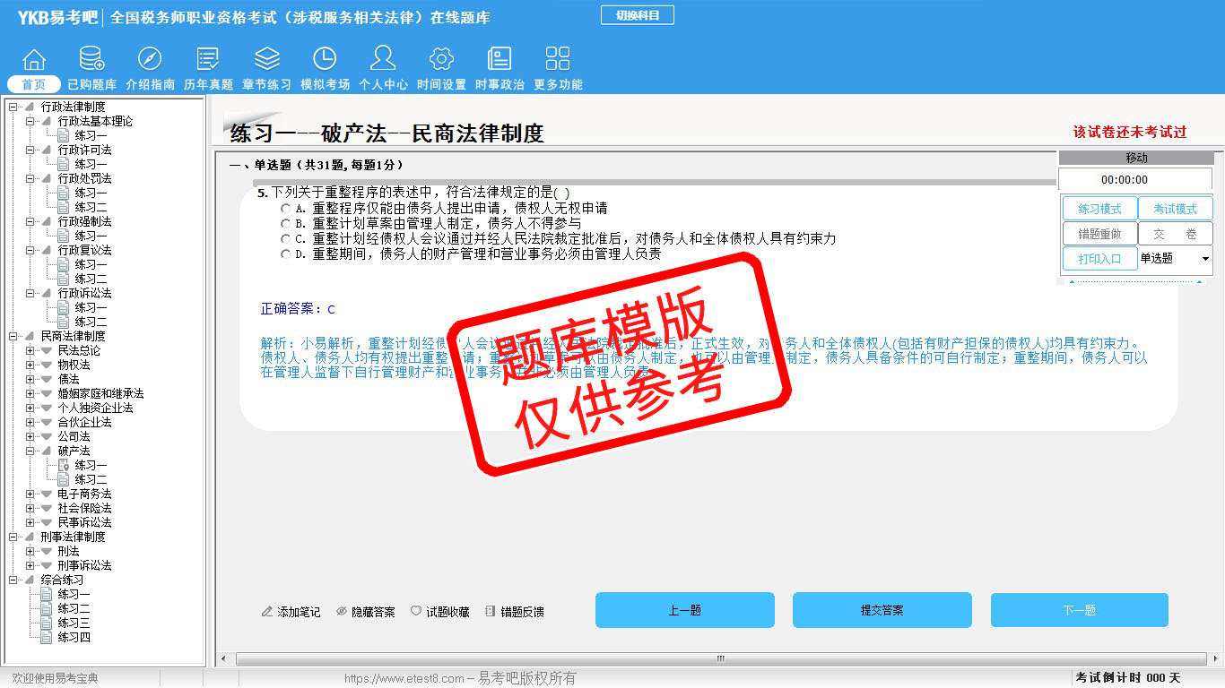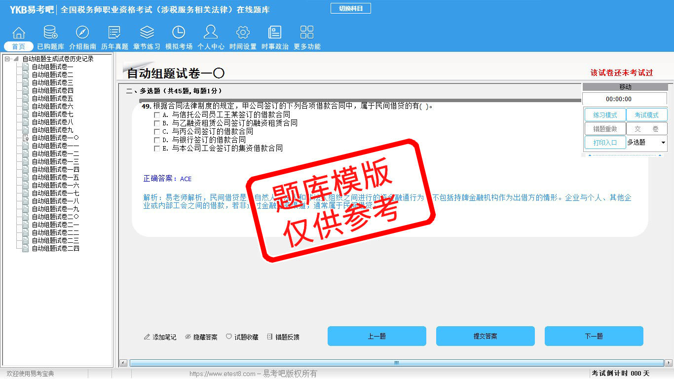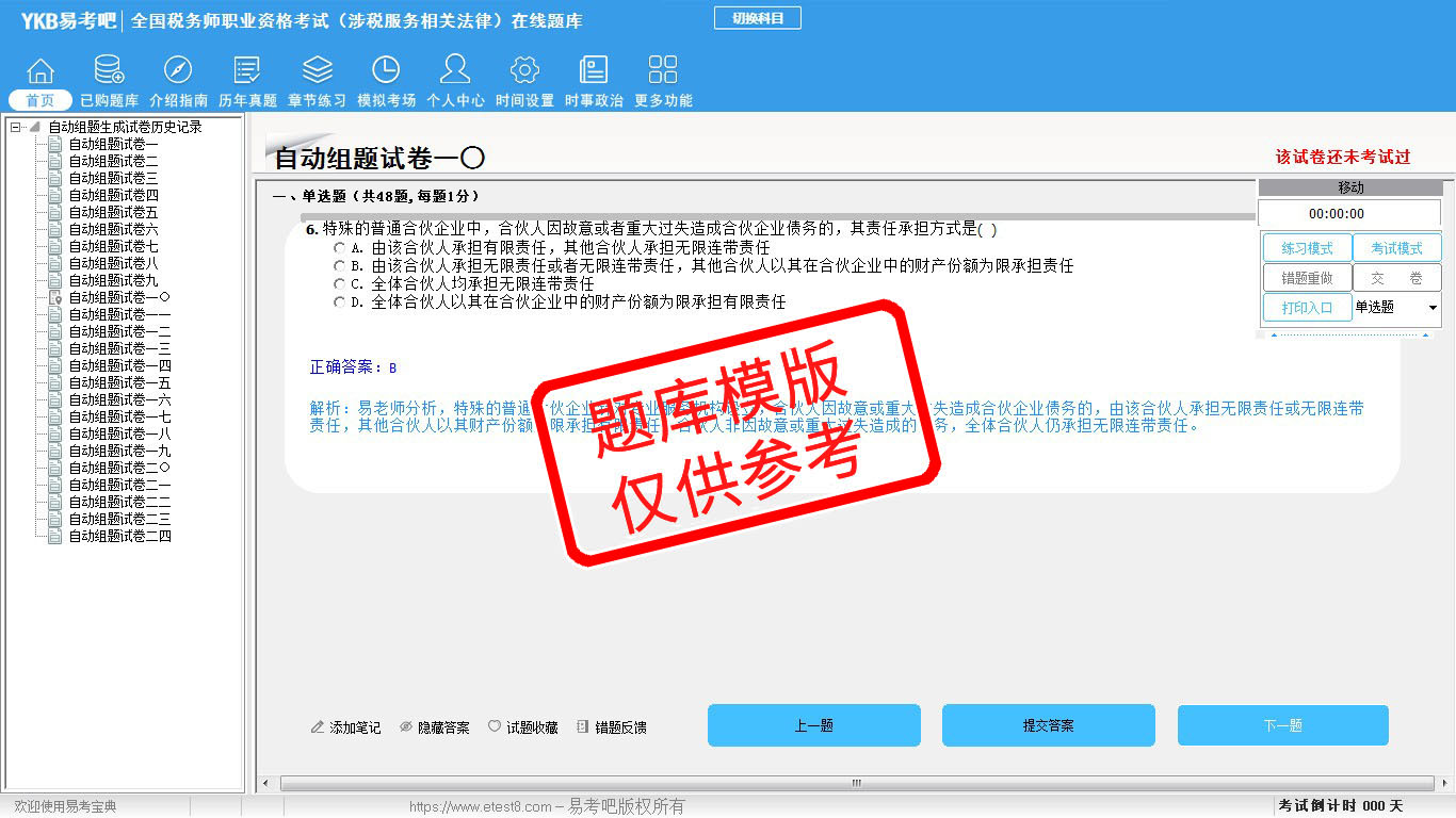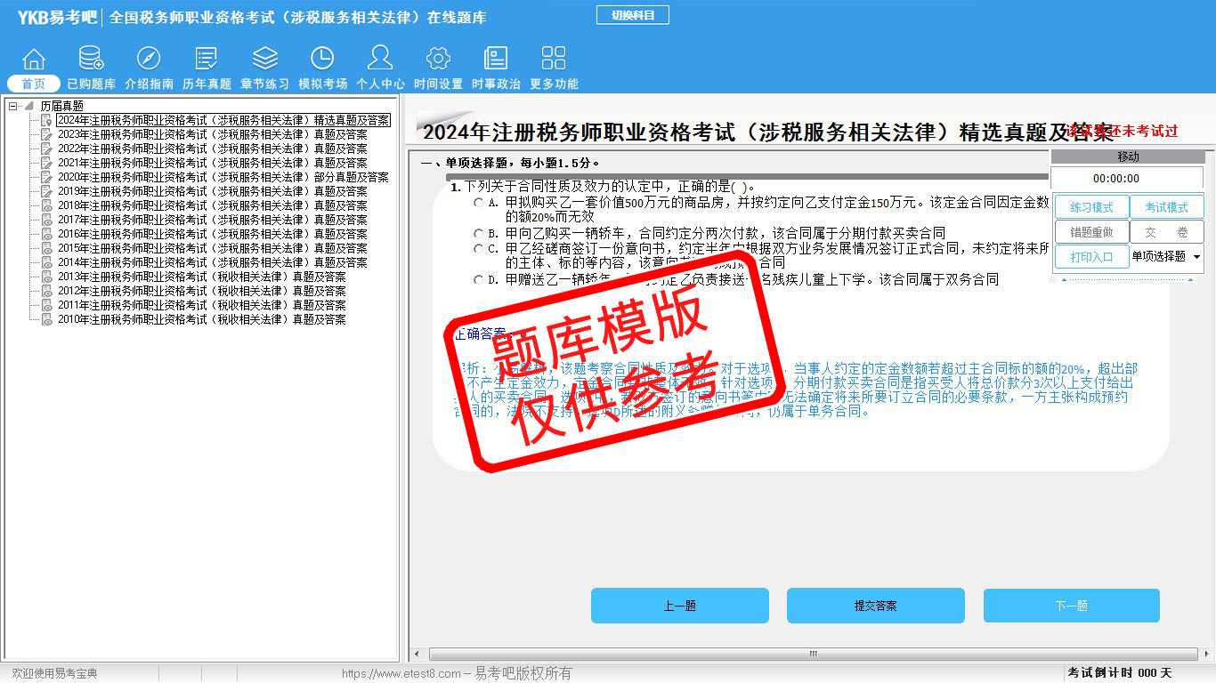 2026年全国税务师职业资格考试易考宝典软件(含5科)(手机/网页版)是《易考宝典》考试系列软件之一,是专门为参加“税务师职业资格考试”的朋友量身定做的自我测试系统,是个人、培训学校进行考试前训练、备考冲刺的提分技巧考试平台,题型丰富,图文并茂,内容全面,题库设计符合考试新大纲,海量试题。软件包括了富有价值的模拟考场,有计时打分等功能,就像亲身体会考试一样。