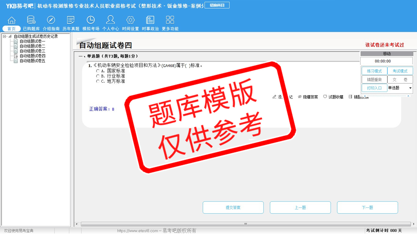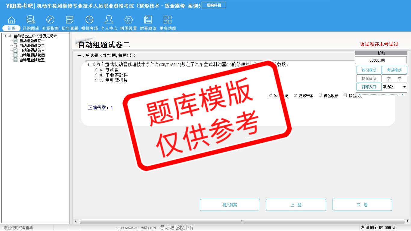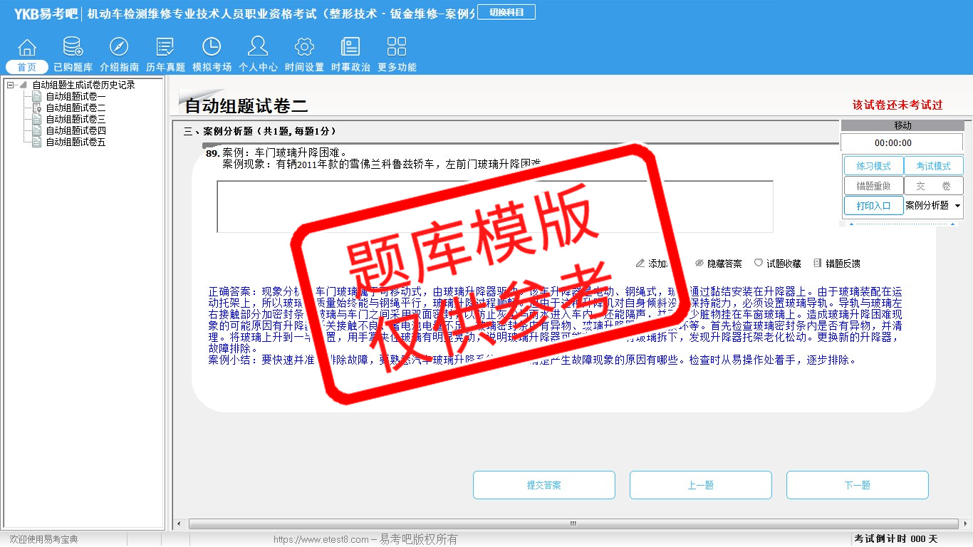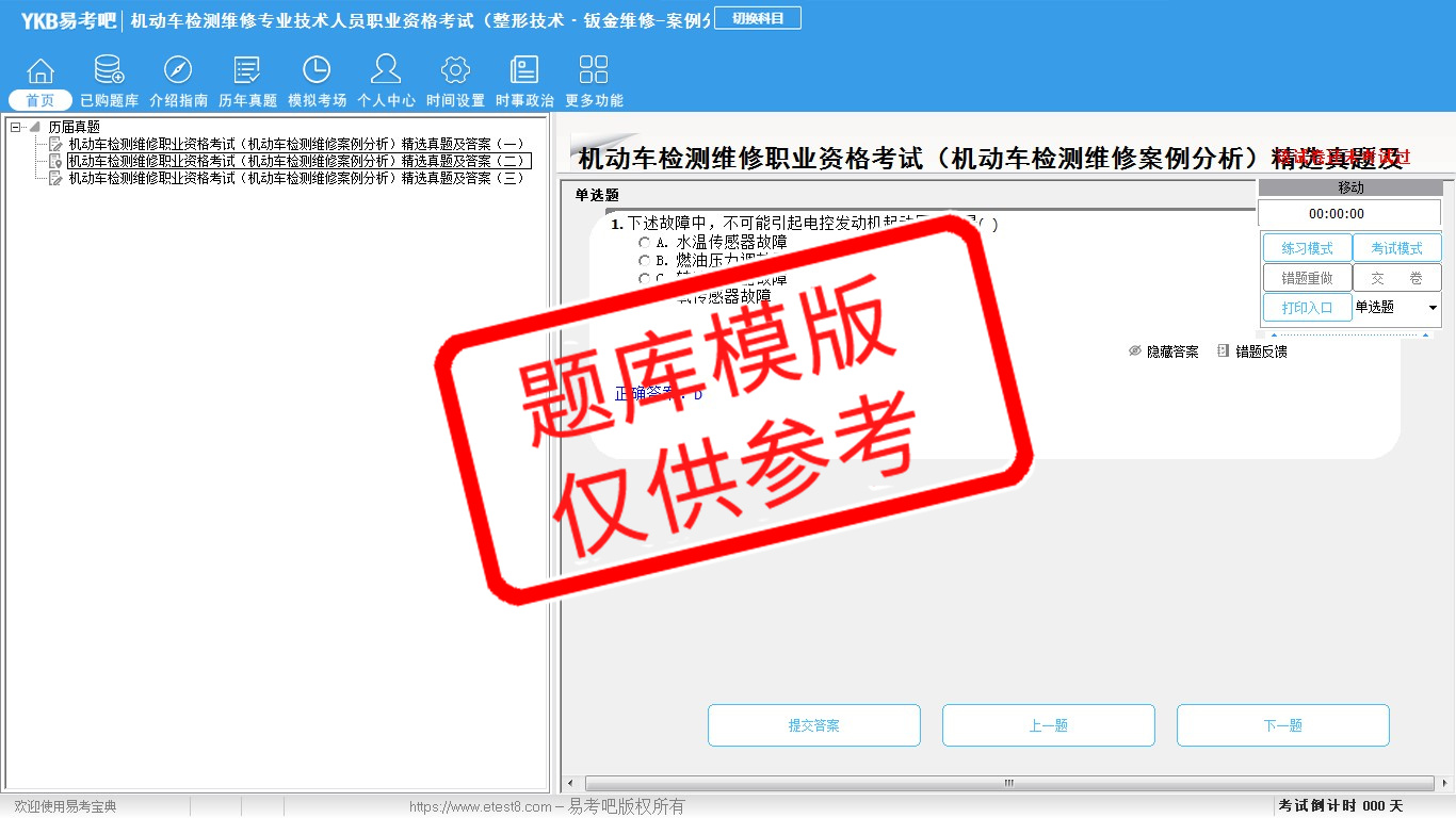 2026年机动车检测维修专业技术人员职业资格考试(整形技术·钣金维修-案例分析)易考宝典软件(维修工程师)(手机/网页版)是《易考宝典》考试系列软件之一,是专门为参加“机动车检测维修职业资格考试”的朋友量身定做的自我测试系统,是个人、培训学校进行考试前训练、备考冲刺的提分技巧考试平台,题型丰富,图文并茂,内容全面,题库设计符合考试新大纲,海量试题。软件包括了富有价值的模拟考场,有计时打分等功能,就像亲身体会考试一样。