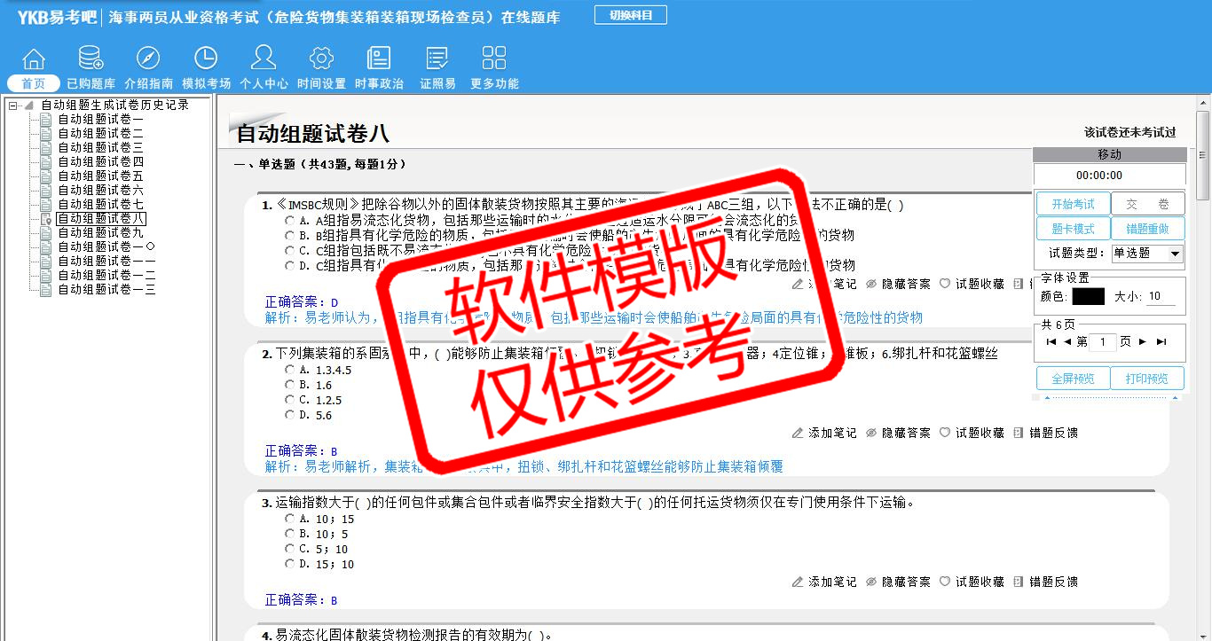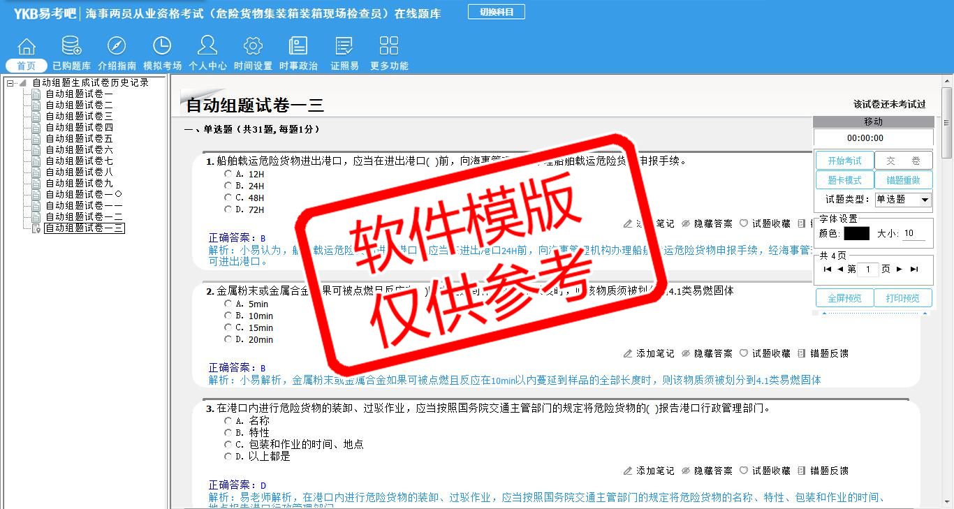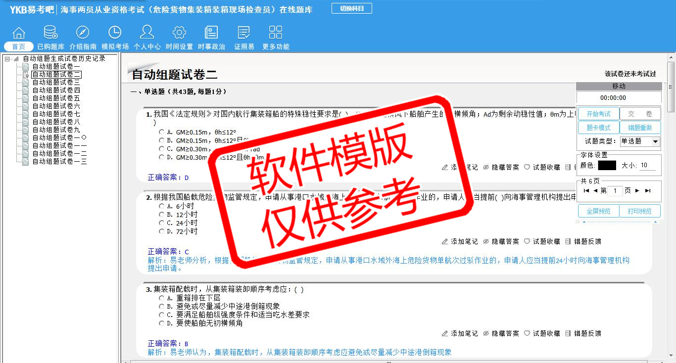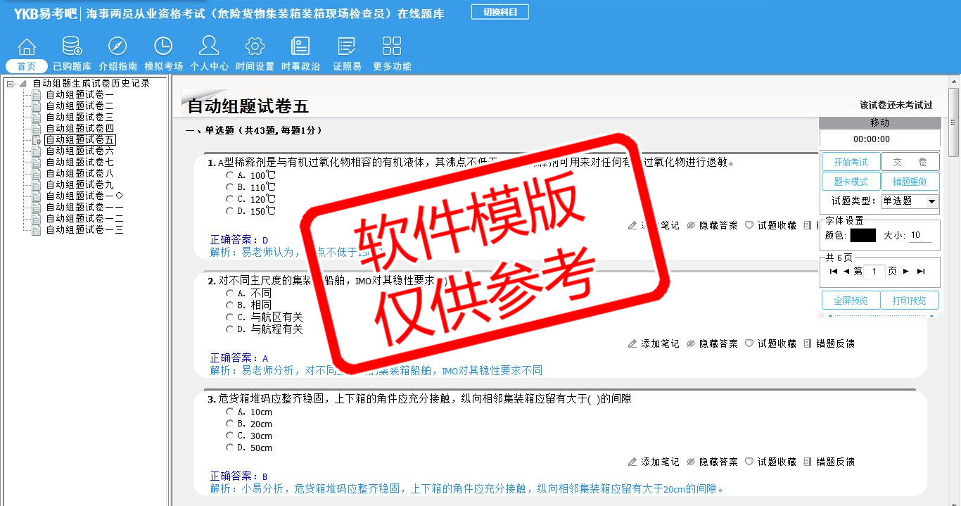 2026年海事两员从业资格考试(危险货物集装箱装箱现场检查员)易考宝典软件(手机/网页版)是《易考宝典》考试系列软件之一,是专门为参加“内河船员职业资格考试”的朋友量身定做的自我测试系统,是个人、培训学校进行考试前训练、备考冲刺的提分技巧考试平台,题型丰富,图文并茂,内容全面,题库设计符合考试新大纲,海量试题。软件包括了富有价值的模拟考场,有计时打分等功能,就像亲身体会考试一样。
