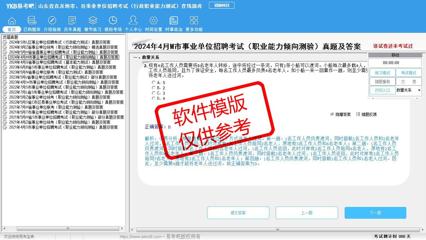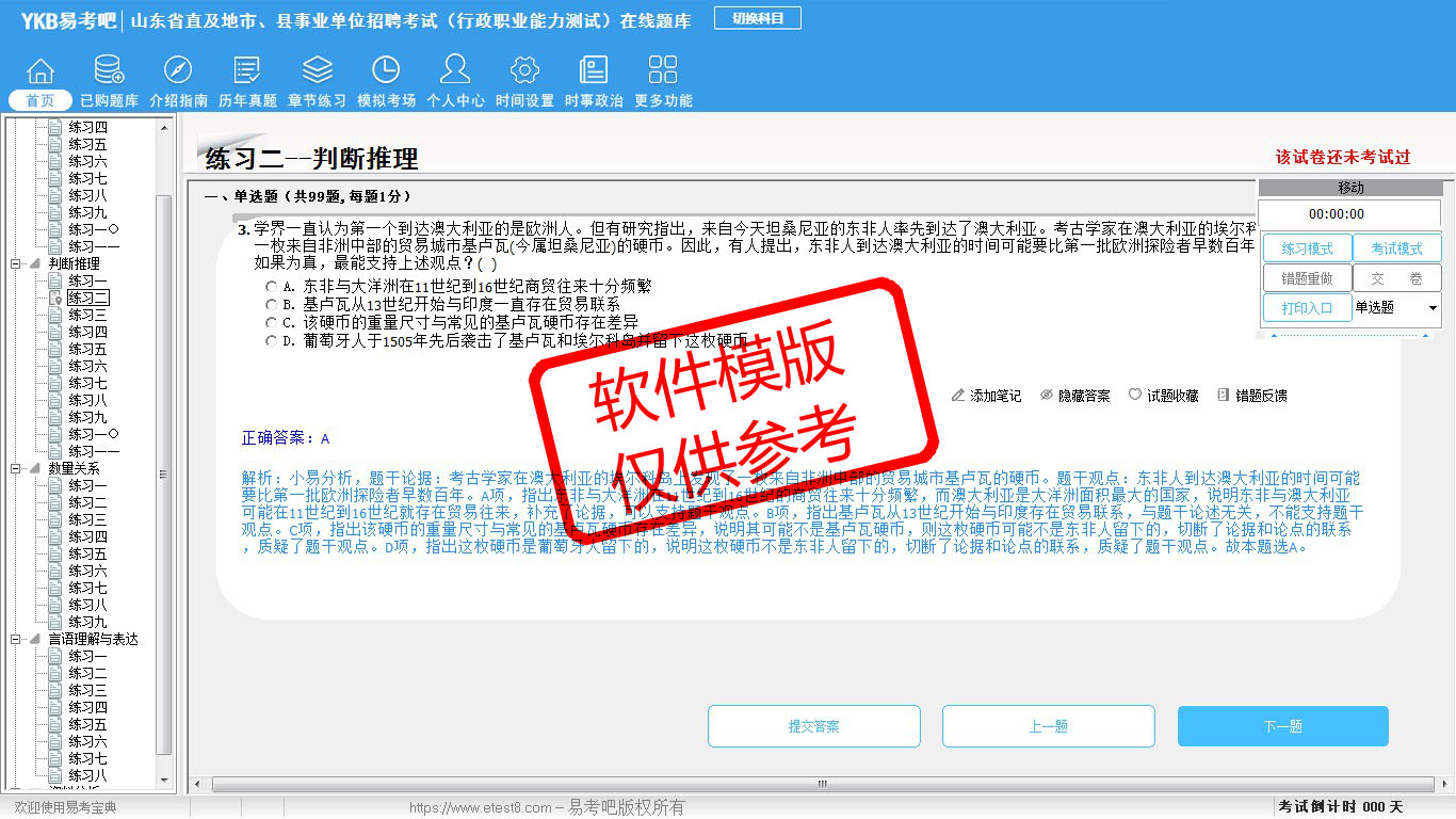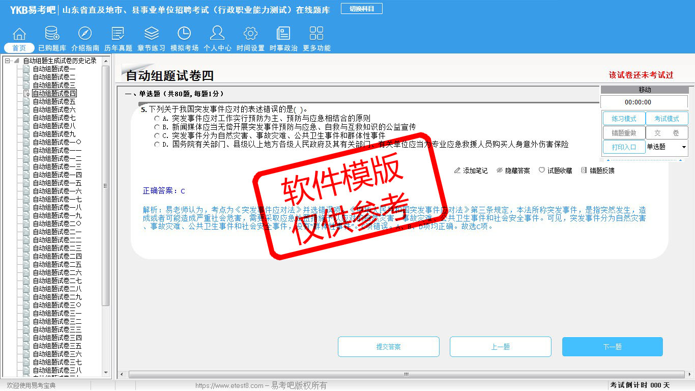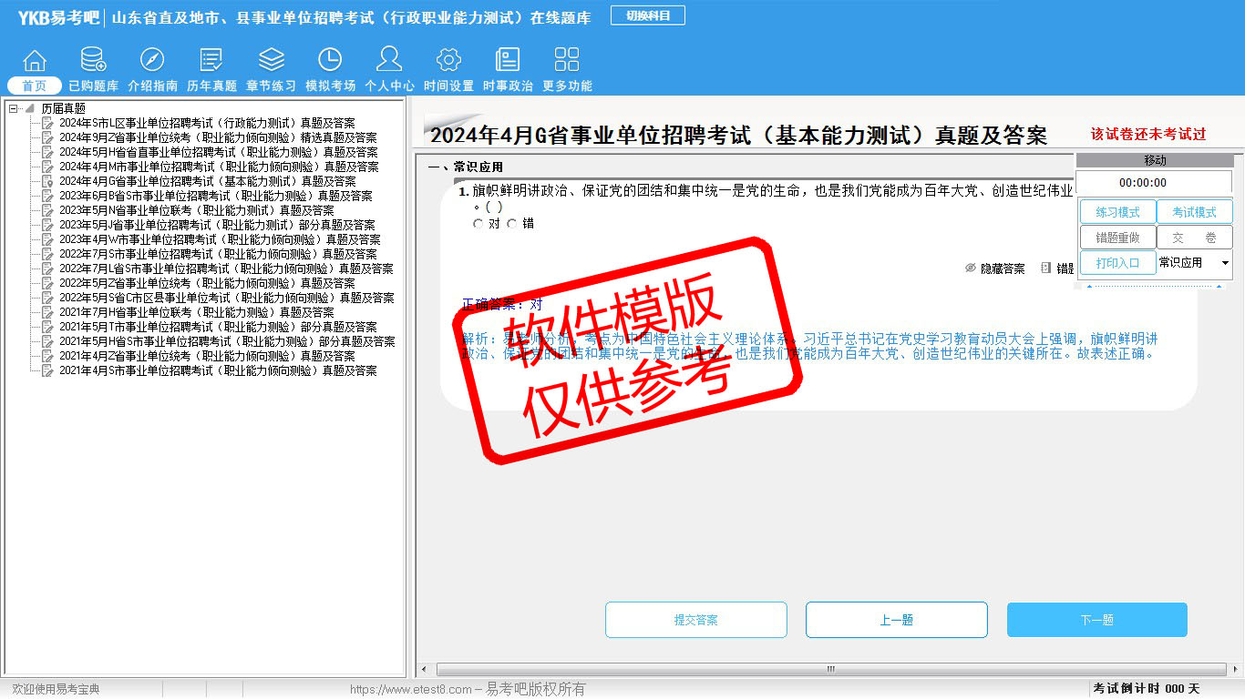 2026年山东事业单位招聘考试(公共基础知识+综合素质能力测试)易考宝典软件(手机/网页版)是《易考宝典》考试系列软件之一,是专门为参加“事业单位职业资格考试”的朋友量身定做的自我测试系统,是个人、培训学校进行考试前训练、备考冲刺的提分技巧考试平台,题型丰富,图文并茂,内容全面,题库设计符合考试新大纲,海量试题。软件包括了富有价值的模拟考场,有计时打分等功能,就像亲身体会考试一样。