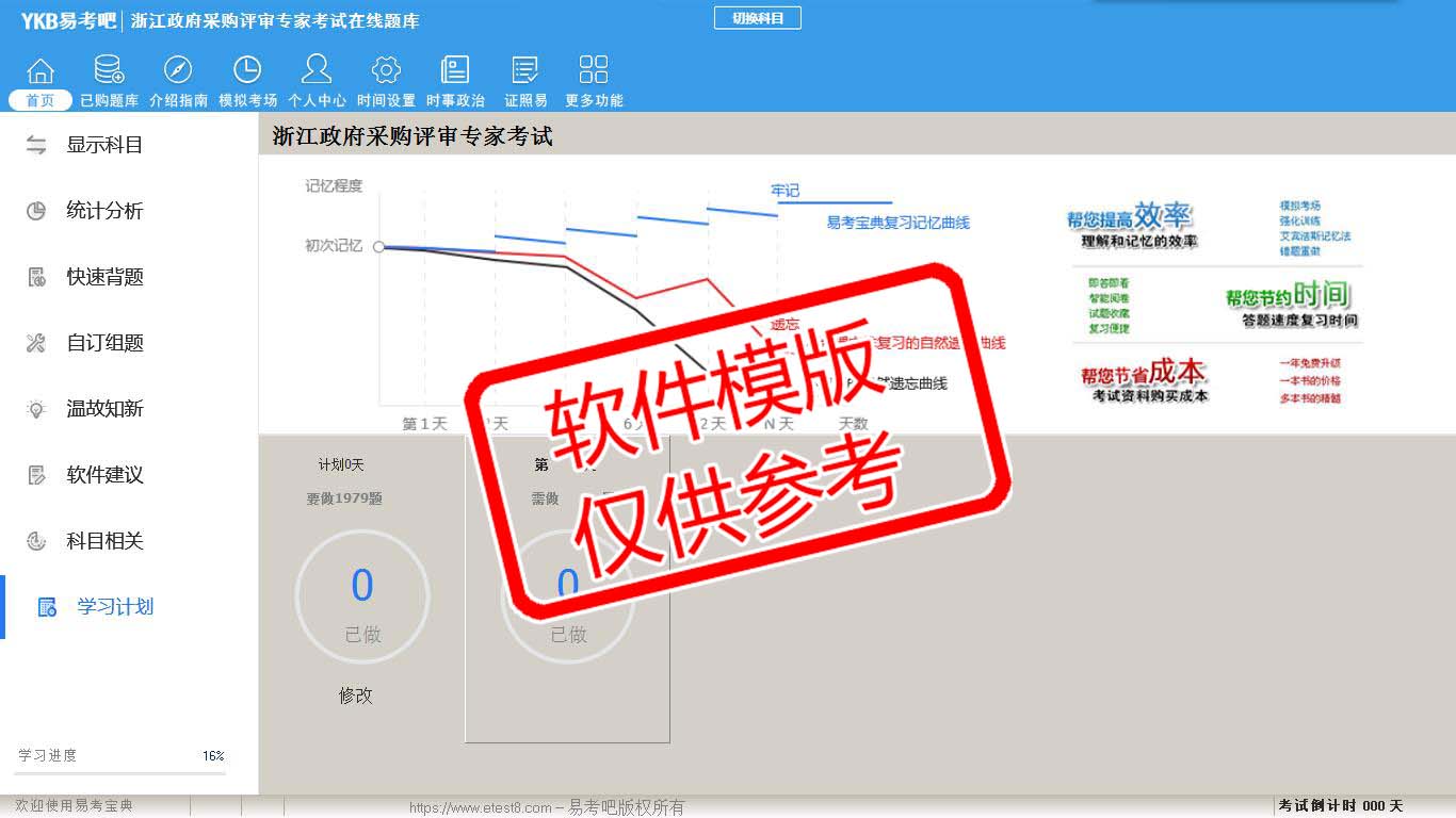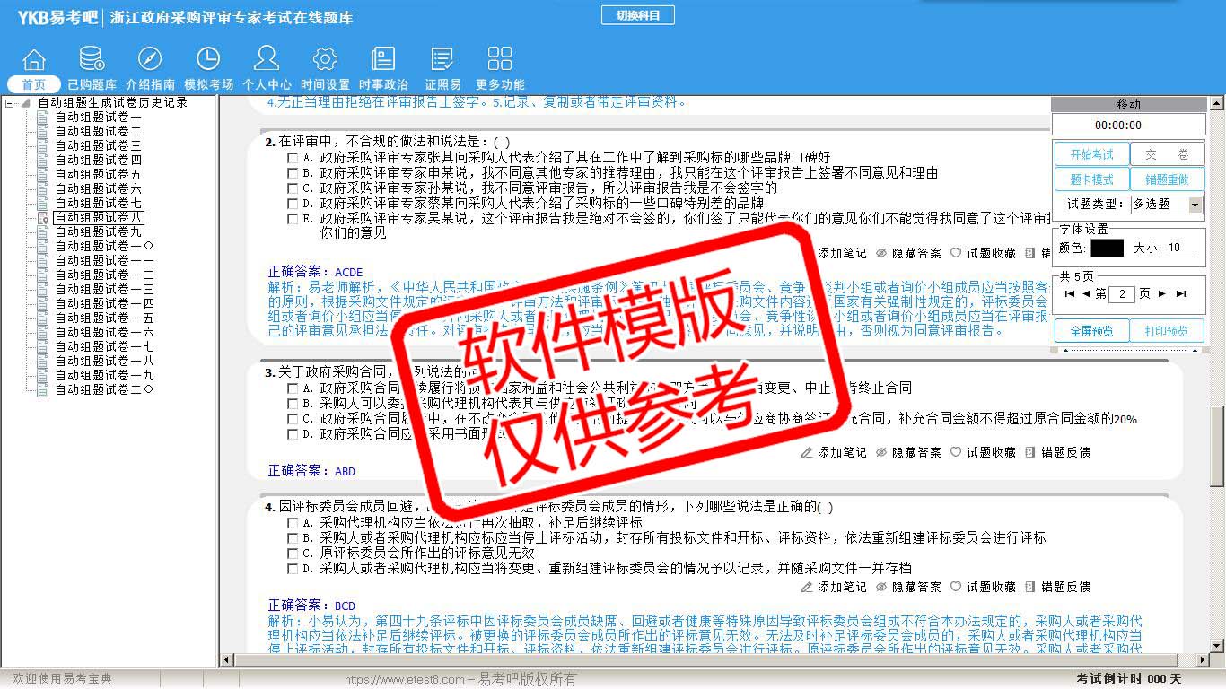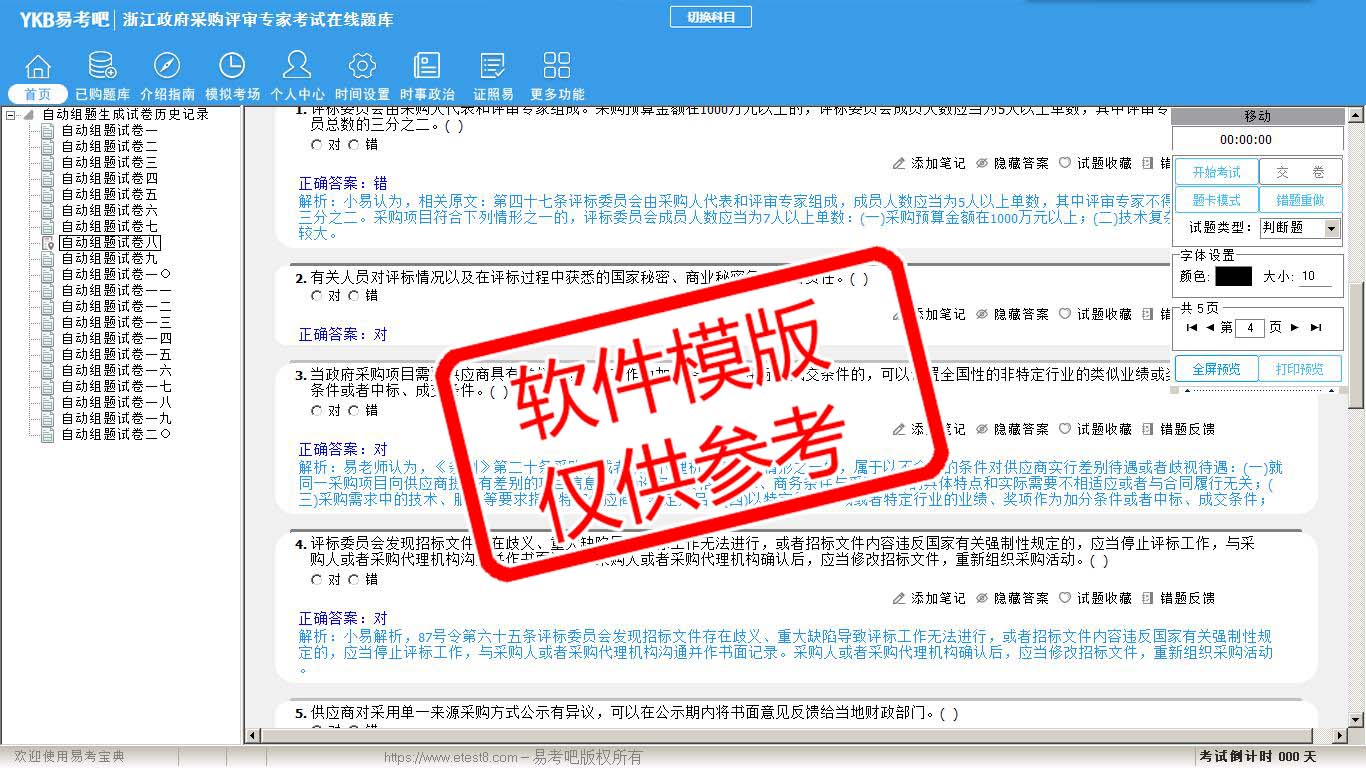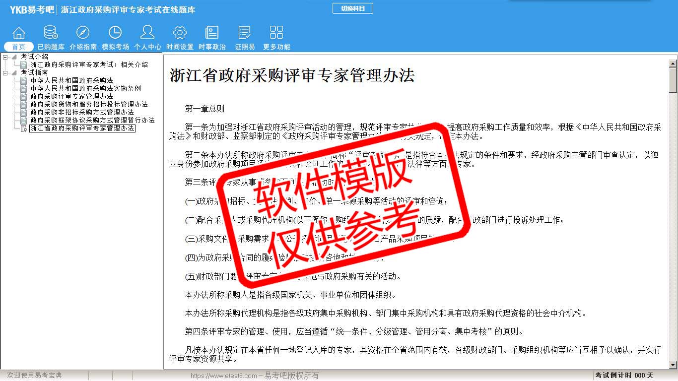 2026年浙江省政府采购评审专家考试易考宝典软件(手机/网页版)是《易考宝典》考试系列软件之一,是专门为参加“评标评审专家职业资格考试”的朋友量身定做的自我测试系统,是个人、培训学校进行考试前训练、备考冲刺的提分技巧考试平台,题型丰富,图文并茂,内容全面,题库设计符合考试新大纲,海量试题。软件包括了富有价值的模拟考场,有计时打分等功能,就像亲身体会考试一样。