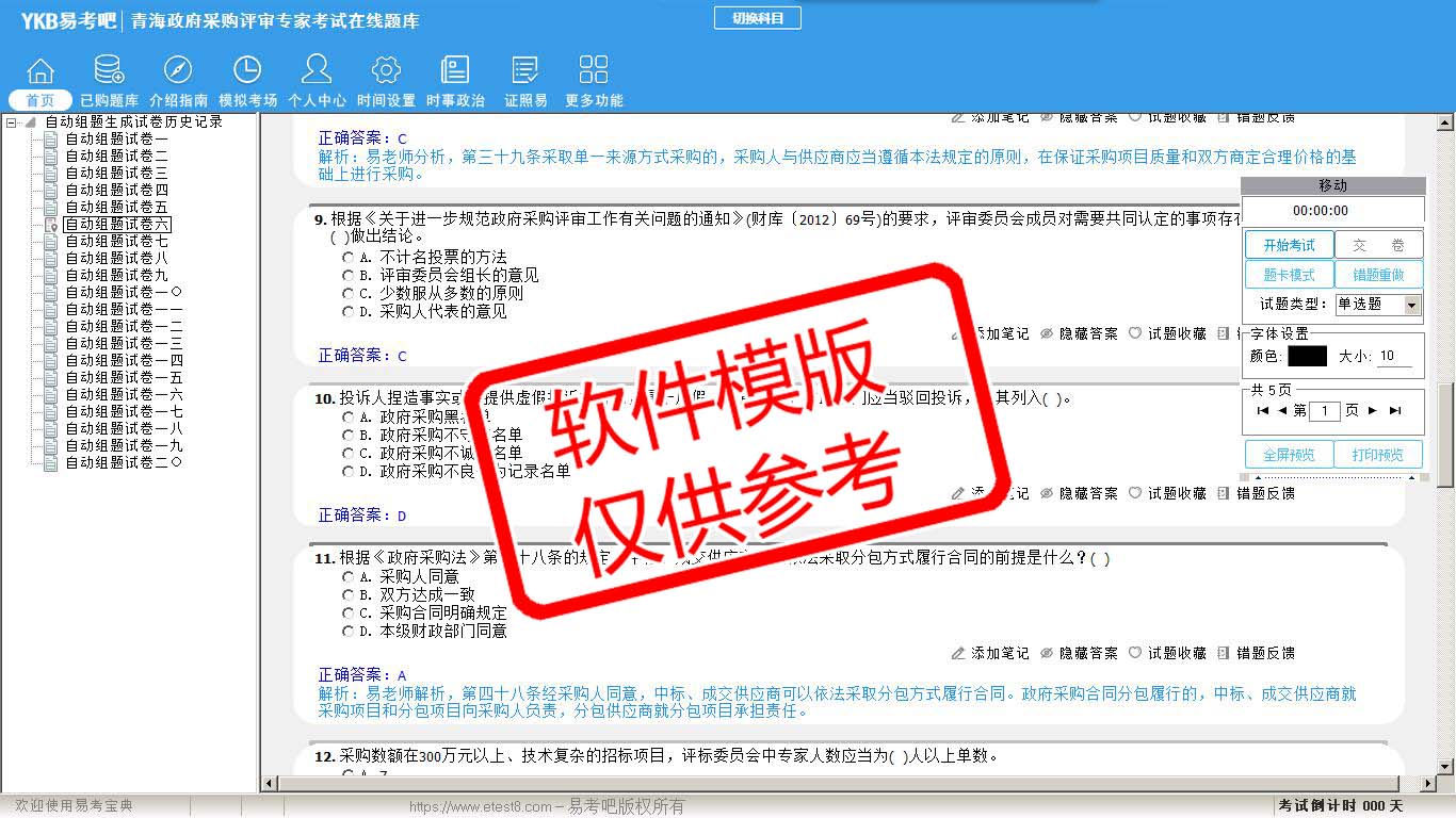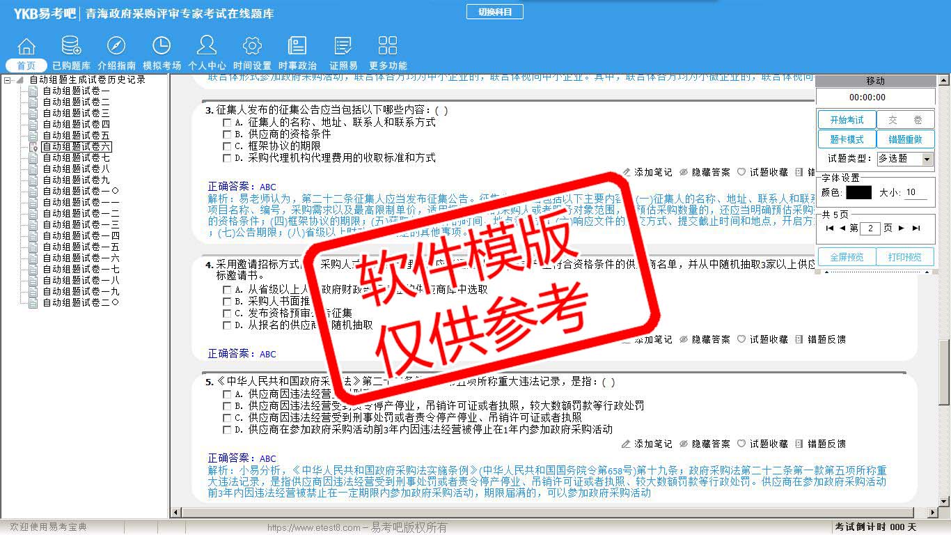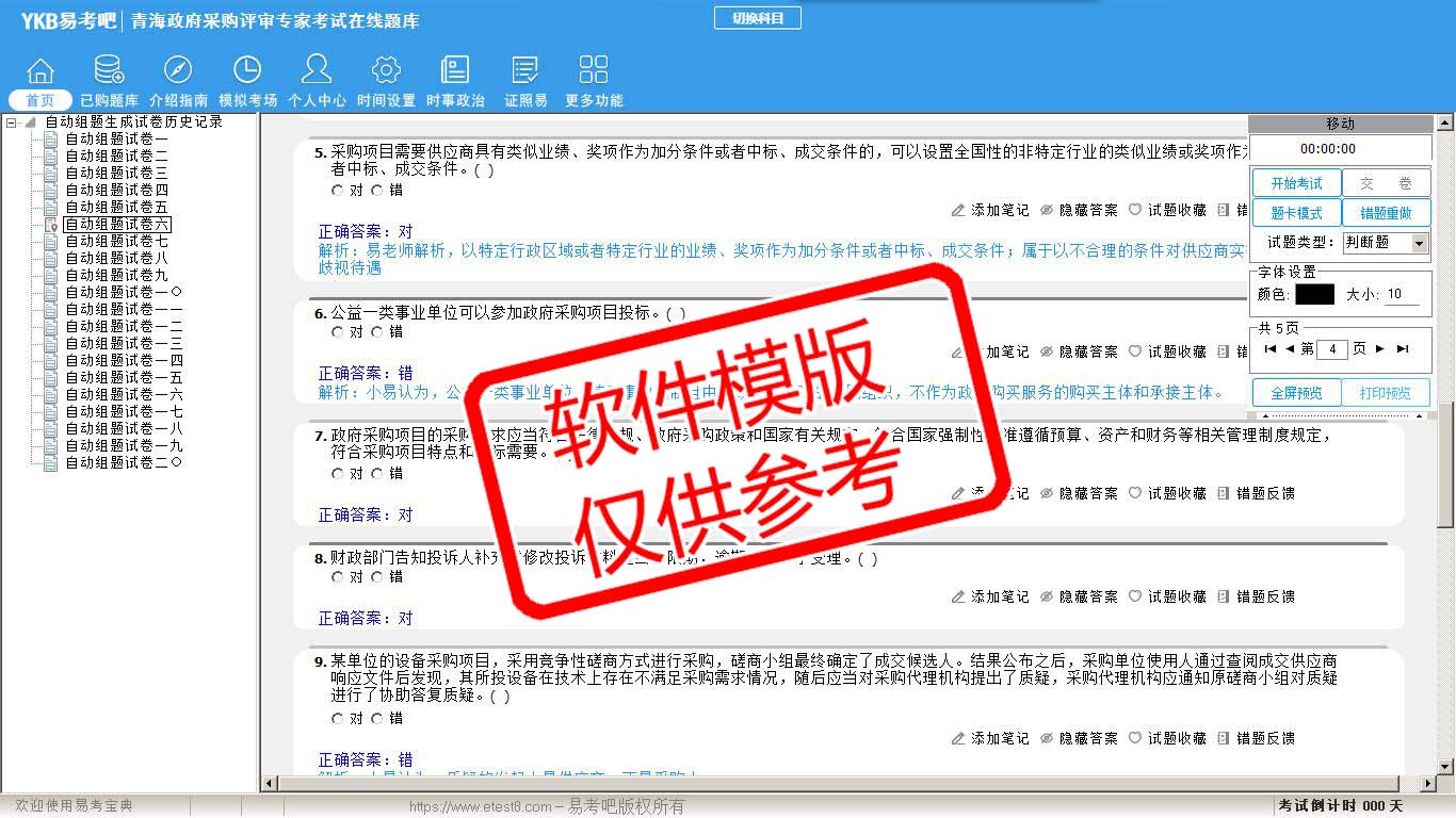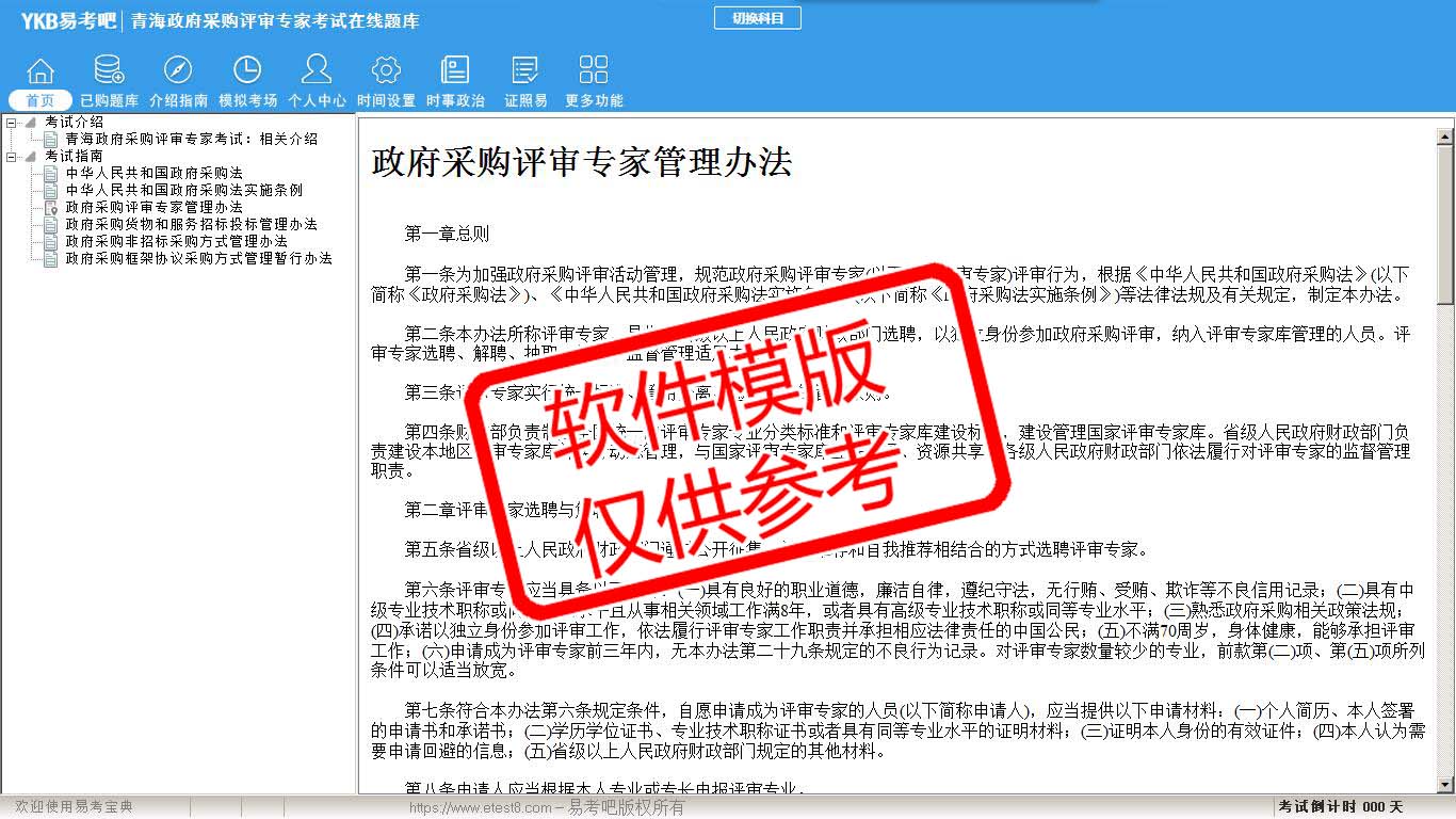 2026年青海省政府采购评审专家考试易考宝典软件(手机/网页版)是《易考宝典》考试系列软件之一,是专门为参加“评标评审专家职业资格考试”的朋友量身定做的自我测试系统,是个人、培训学校进行考试前训练、备考冲刺的提分技巧考试平台,题型丰富,图文并茂,内容全面,题库设计符合考试新大纲,海量试题。软件包括了富有价值的模拟考场,有计时打分等功能,就像亲身体会考试一样。