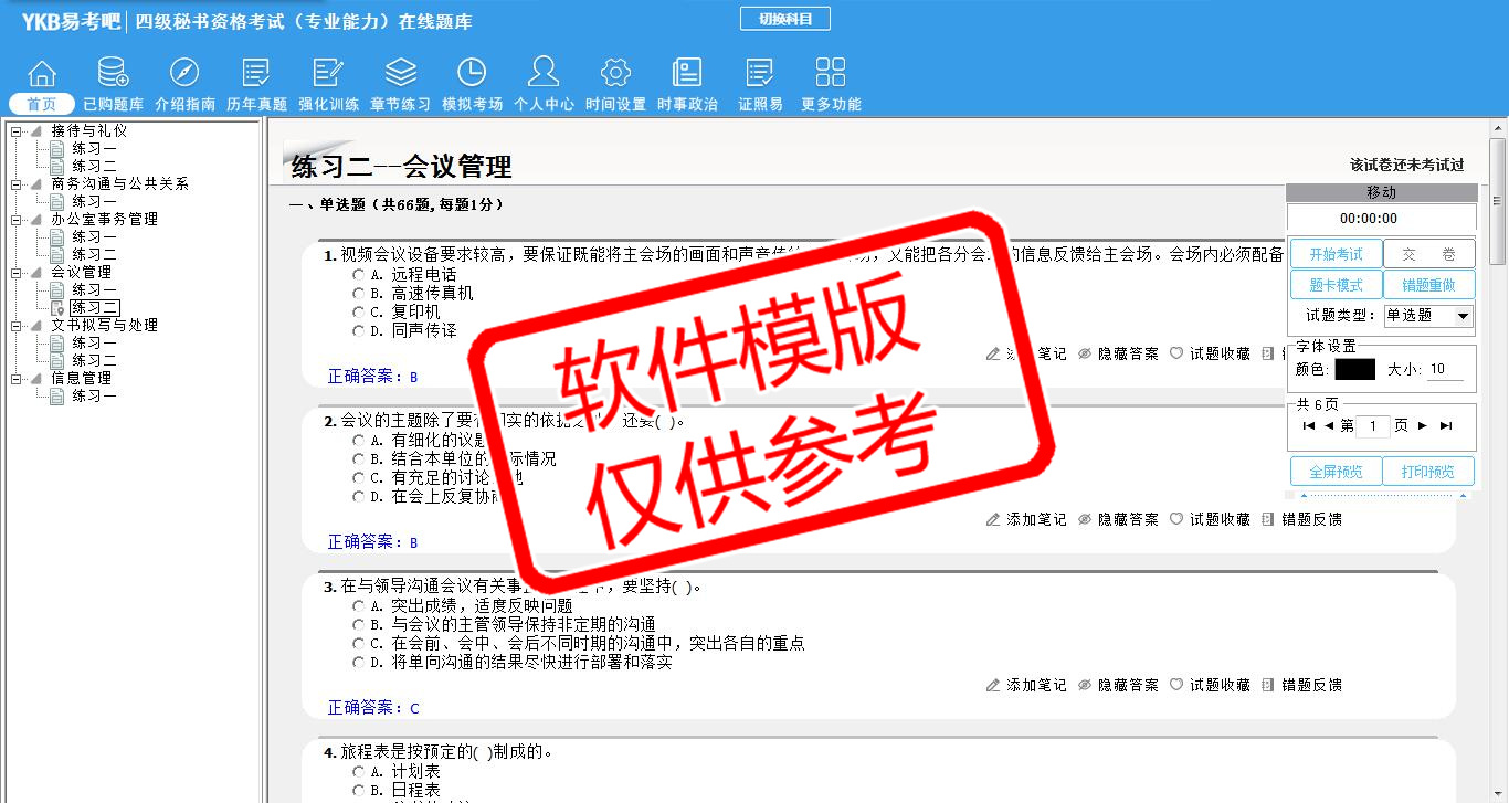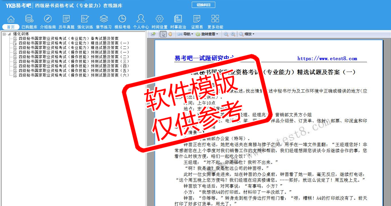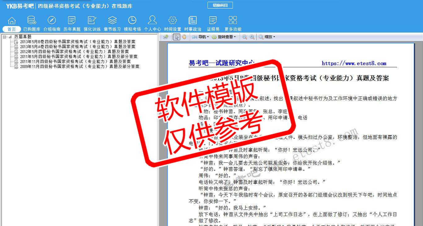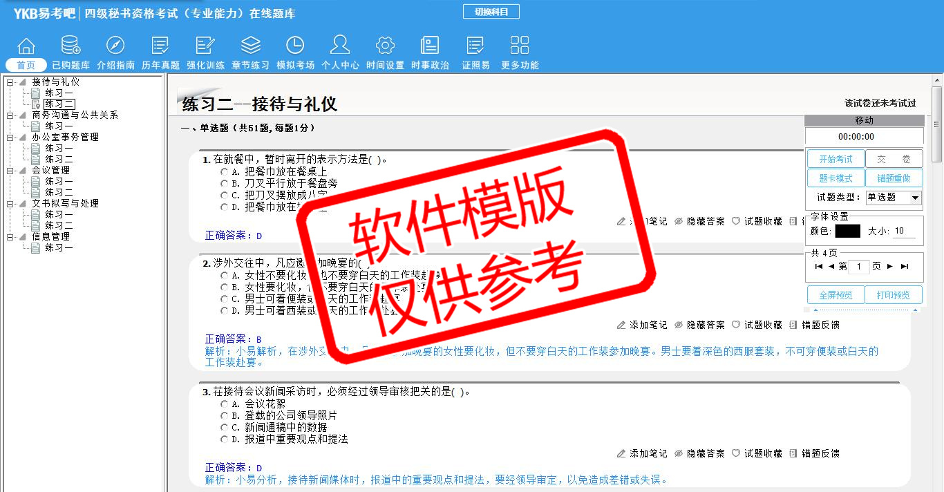 2026年四级秘书资格考试(专业能力)易考宝典软件(手机/网页版)是《易考宝典》考试系列软件之一,是专门为参加“秘书职业资格考试”的朋友量身定做的自我测试系统,是个人、培训学校进行考试前训练、备考冲刺的提分技巧考试平台,题型丰富,图文并茂,内容全面,题库设计符合考试新大纲,海量试题。软件包括了富有价值的模拟考场,有计时打分等功能,就像亲身体会考试一样。