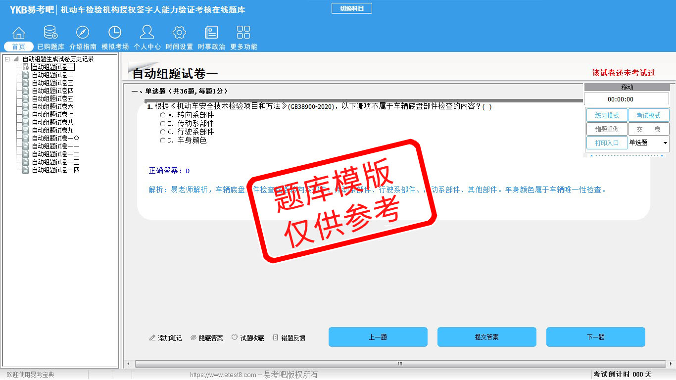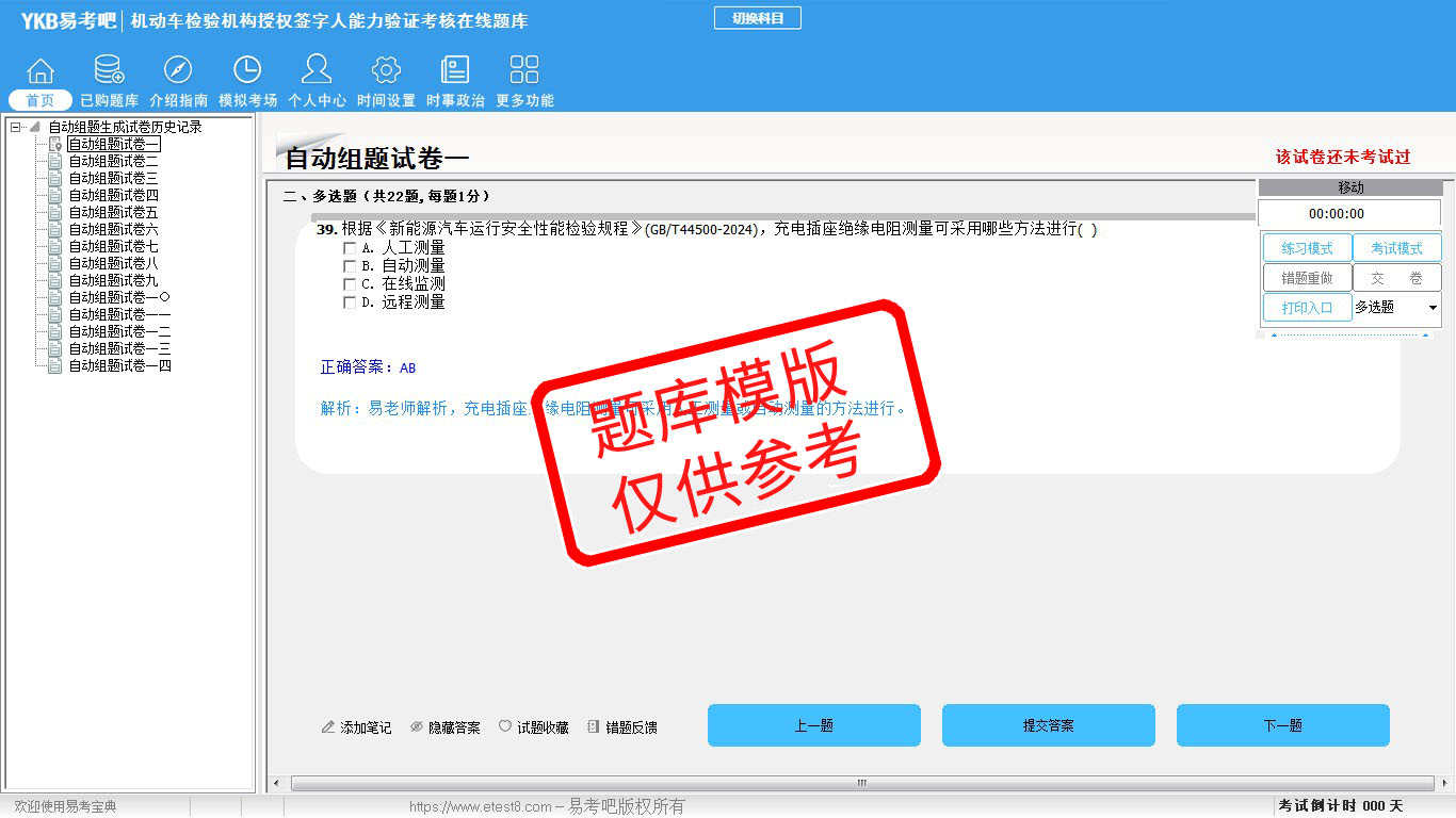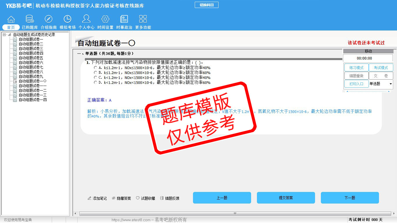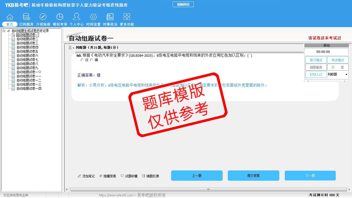 2026年机动车检验机构授权签字人能力验证考核易考宝典软件(手机/网页版)是《易考宝典》考试系列软件之一,是专门为参加“机动车检测维修职业资格考试”的朋友量身定做的自我测试系统,是个人、培训学校进行考试前训练、备考冲刺的提分技巧考试平台,题型丰富,图文并茂,内容全面,题库设计符合考试新大纲,海量试题。软件包括了富有价值的模拟考场,有计时打分等功能,就像亲身体会考试一样。