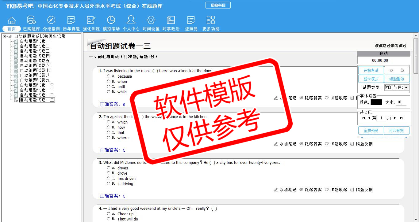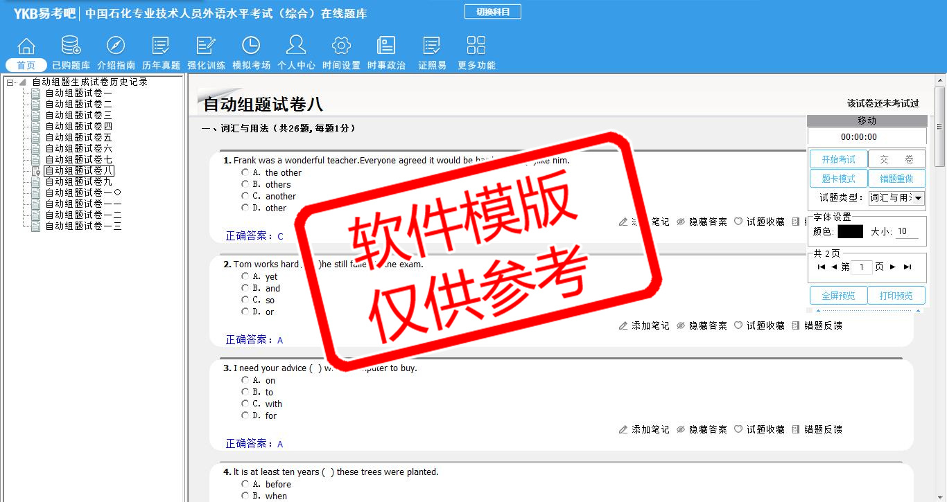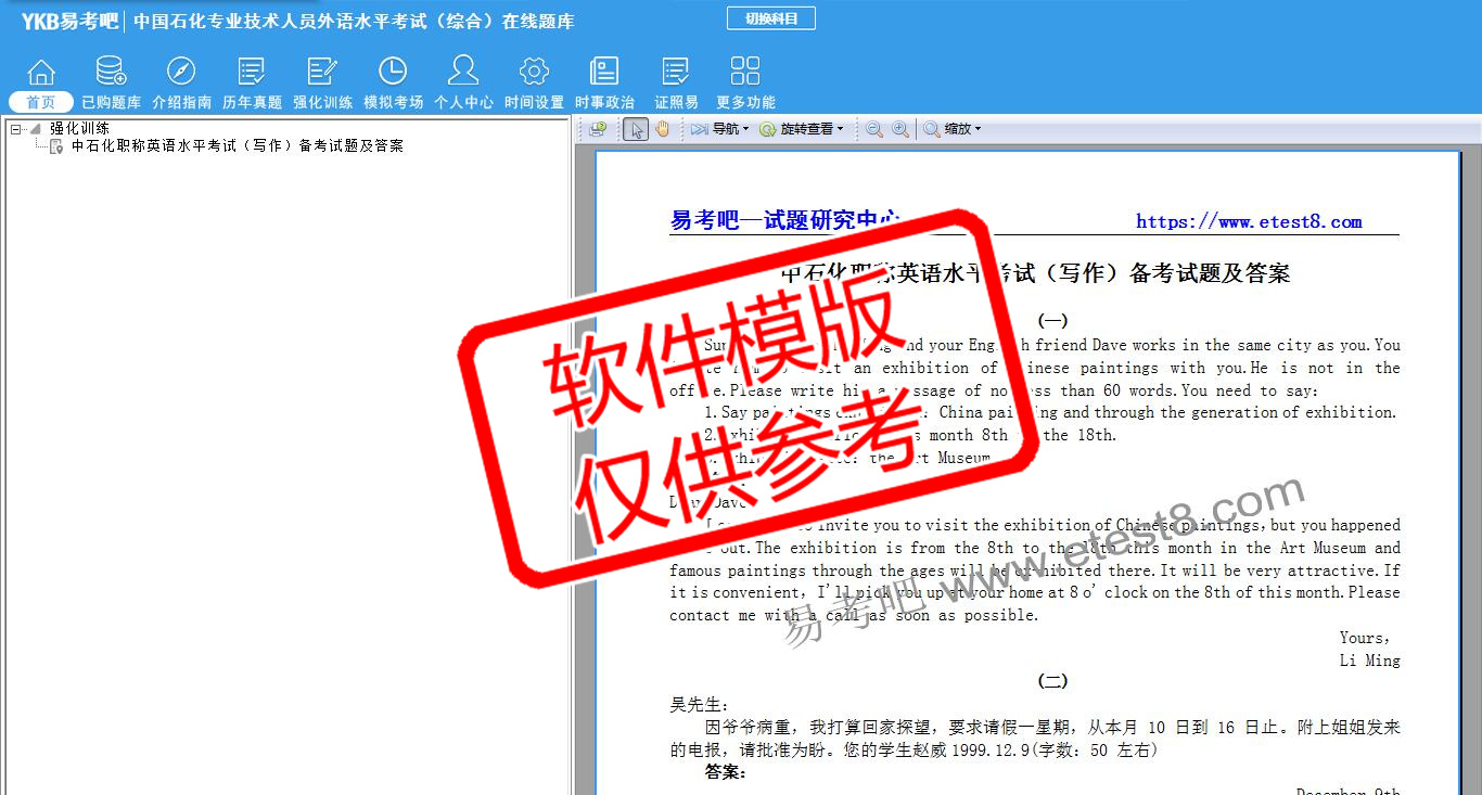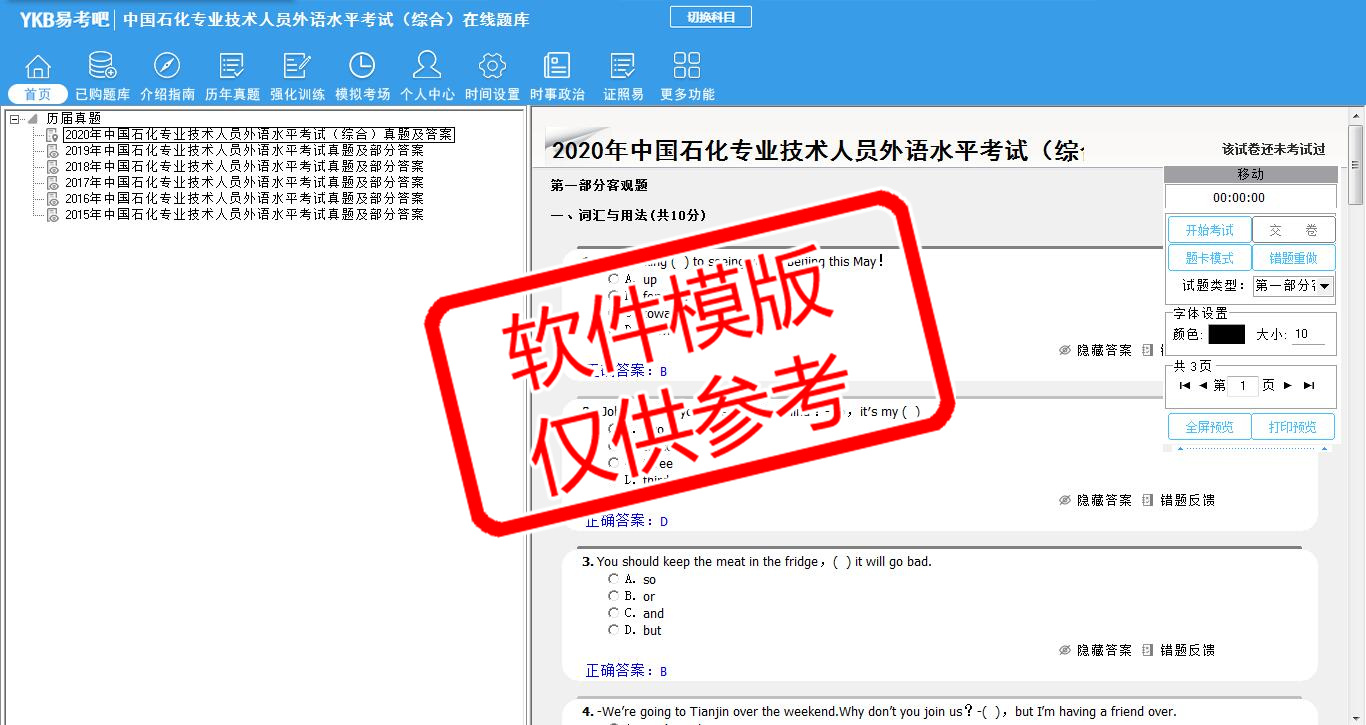 2026年中国石化专业技术人员外语水平考试(综合)易考宝典软件(手机/网页版)是《易考宝典》考试系列软件之一,是专门为参加“职称英语职业资格考试”的朋友量身定做的自我测试系统,是个人、培训学校进行考试前训练、备考冲刺的提分技巧考试平台,题型丰富,图文并茂,内容全面,题库设计符合考试新大纲,海量试题。软件包括了富有价值的模拟考场,有计时打分等功能,就像亲身体会考试一样。