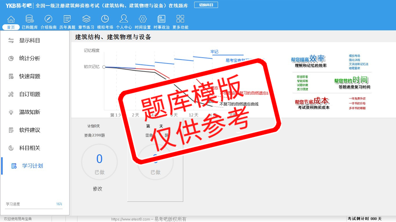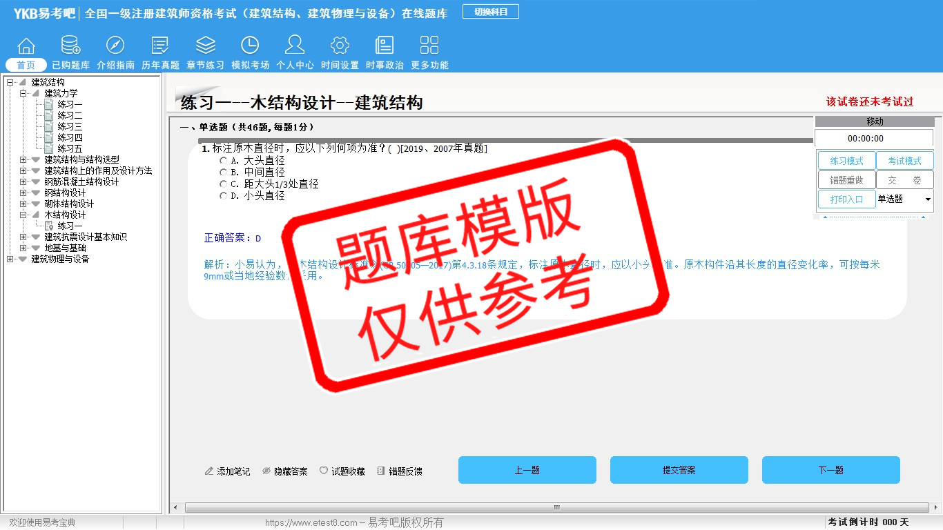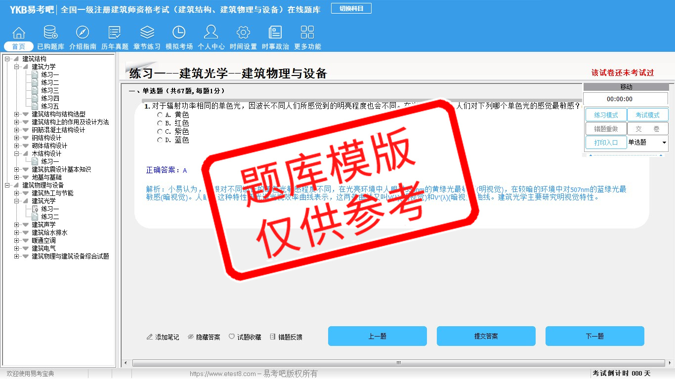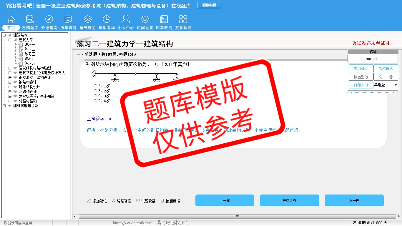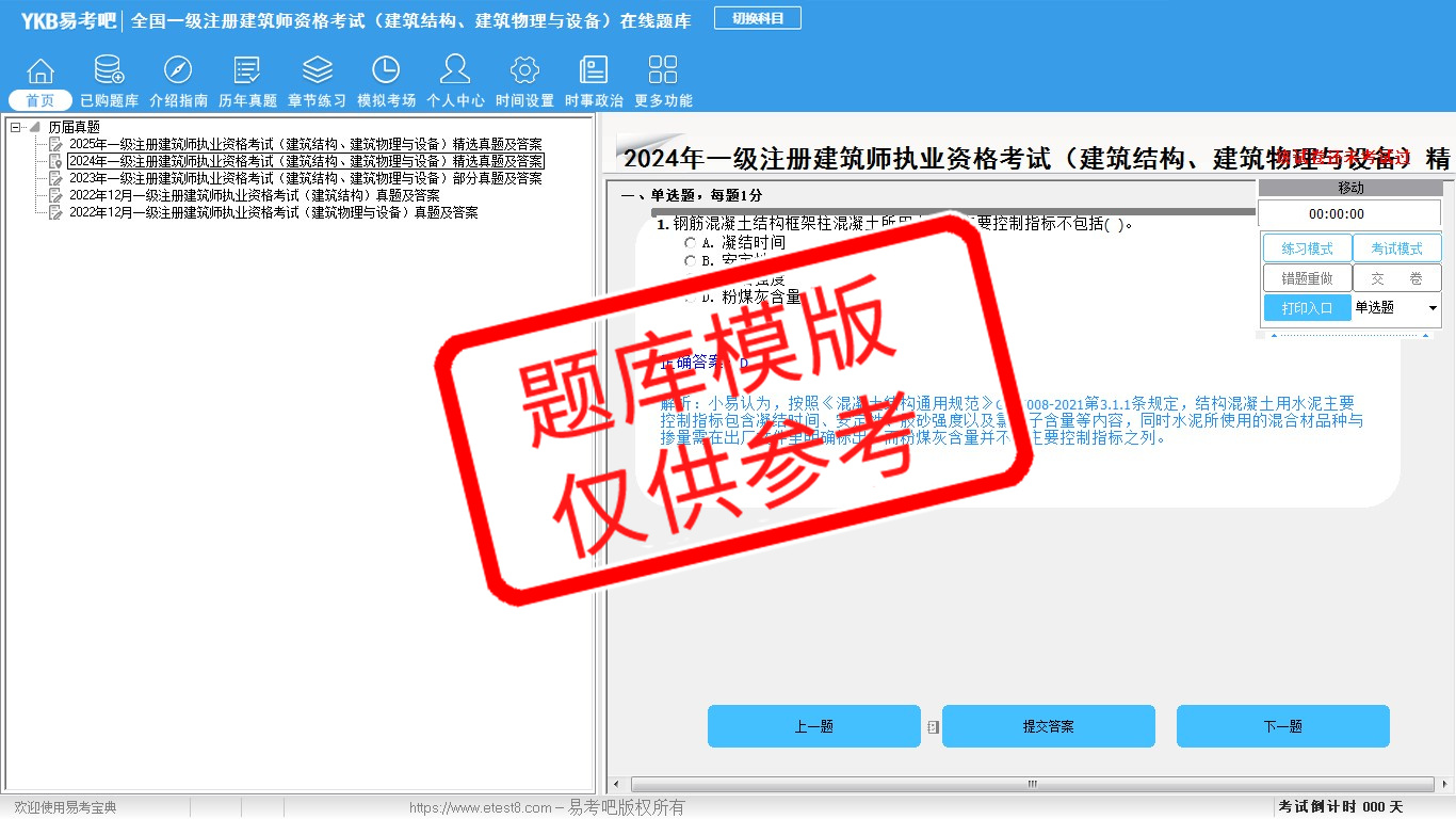2026年全国一级注册建筑师资格考试(建筑结构、建筑物理与设备)易考宝典软件(手机/网页版)是《易考宝典》考试系列软件之一,是专门为参加“建筑师职业资格考试”的朋友量身定做的自我测试系统,是个人、培训学校进行考试前训练、备考冲刺的提分技巧考试平台,题型丰富,图文并茂,内容全面,题库设计符合考试新大纲,海量试题。软件包括了富有价值的模拟考场,有计时打分等功能,就像亲身体会考试一样。