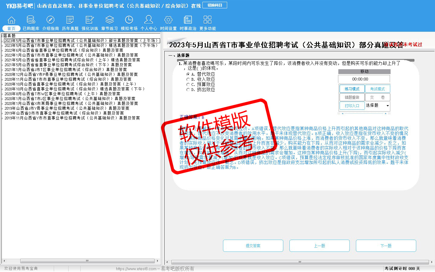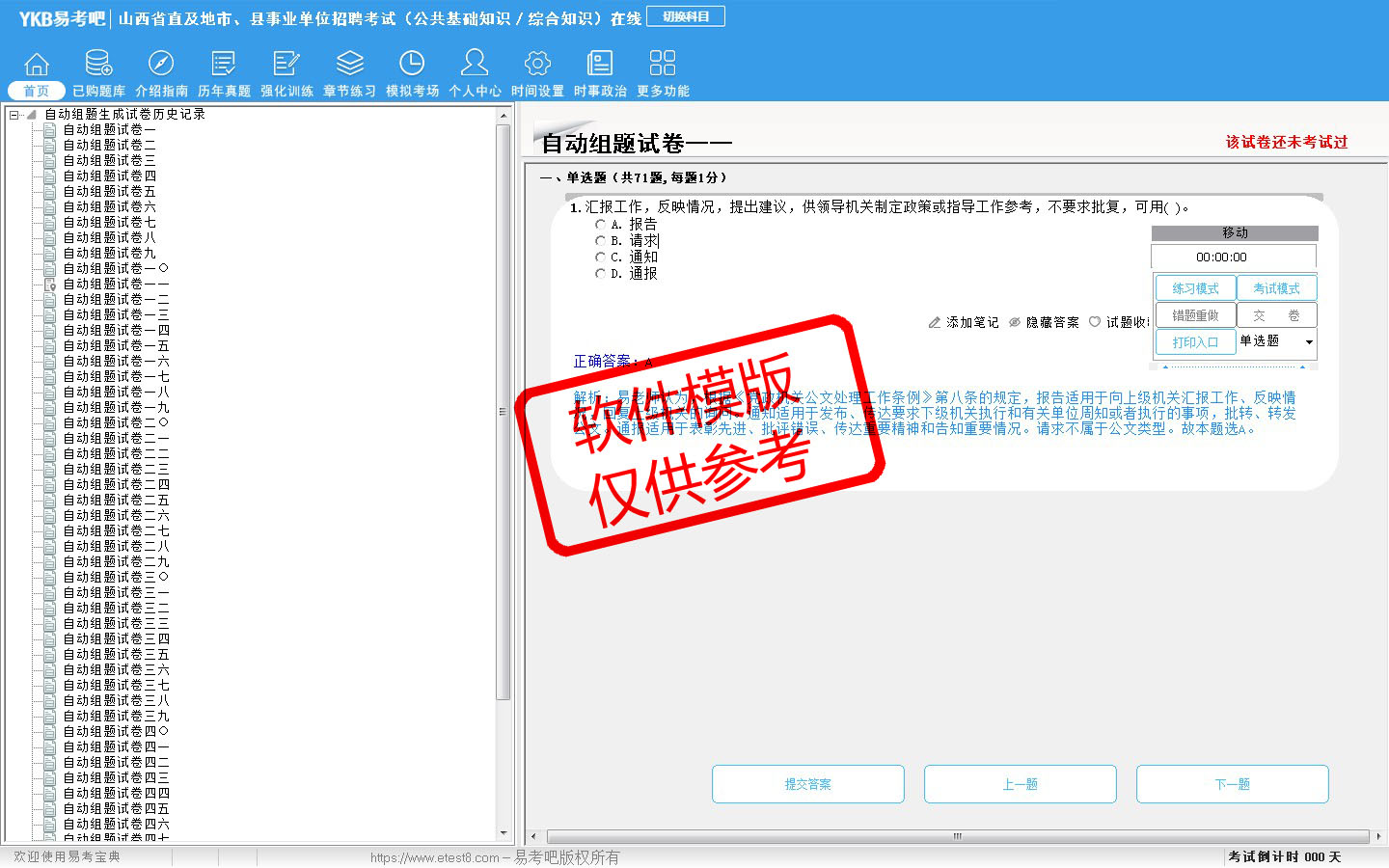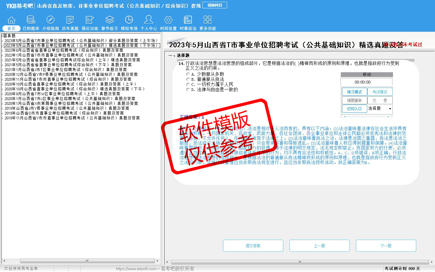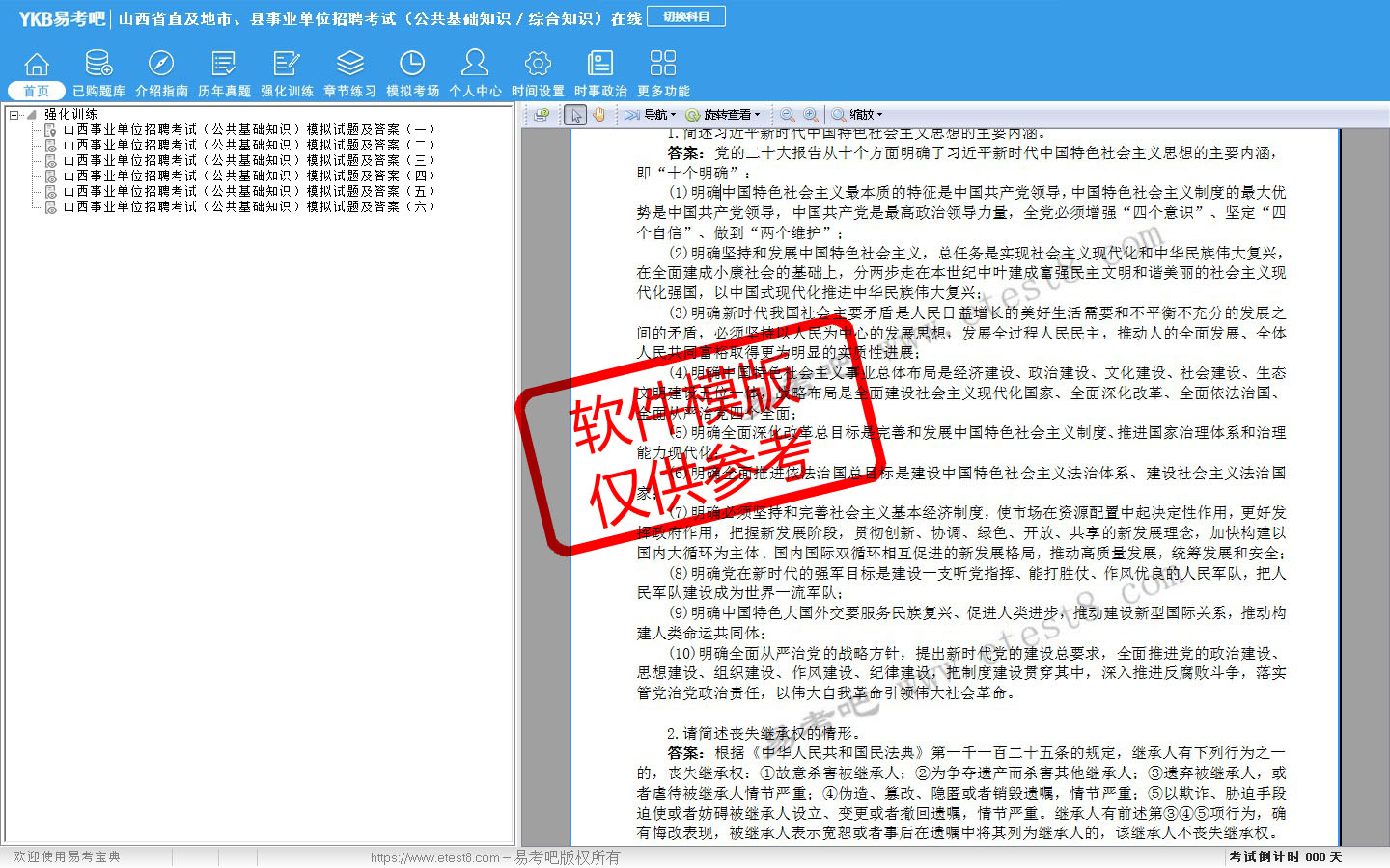 2026年山西省直及地市、县事业单位招聘考试(公共基础知识/综合知识)易考宝典软件(手机/网页版)是《易考宝典》考试系列软件之一,是专门为参加“事业单位职业资格考试”的朋友量身定做的自我测试系统,是个人、培训学校进行考试前训练、备考冲刺的提分技巧考试平台,题型丰富,图文并茂,内容全面,题库设计符合考试新大纲,海量试题。软件包括了富有价值的模拟考场,有计时打分等功能,就像亲身体会考试一样。
