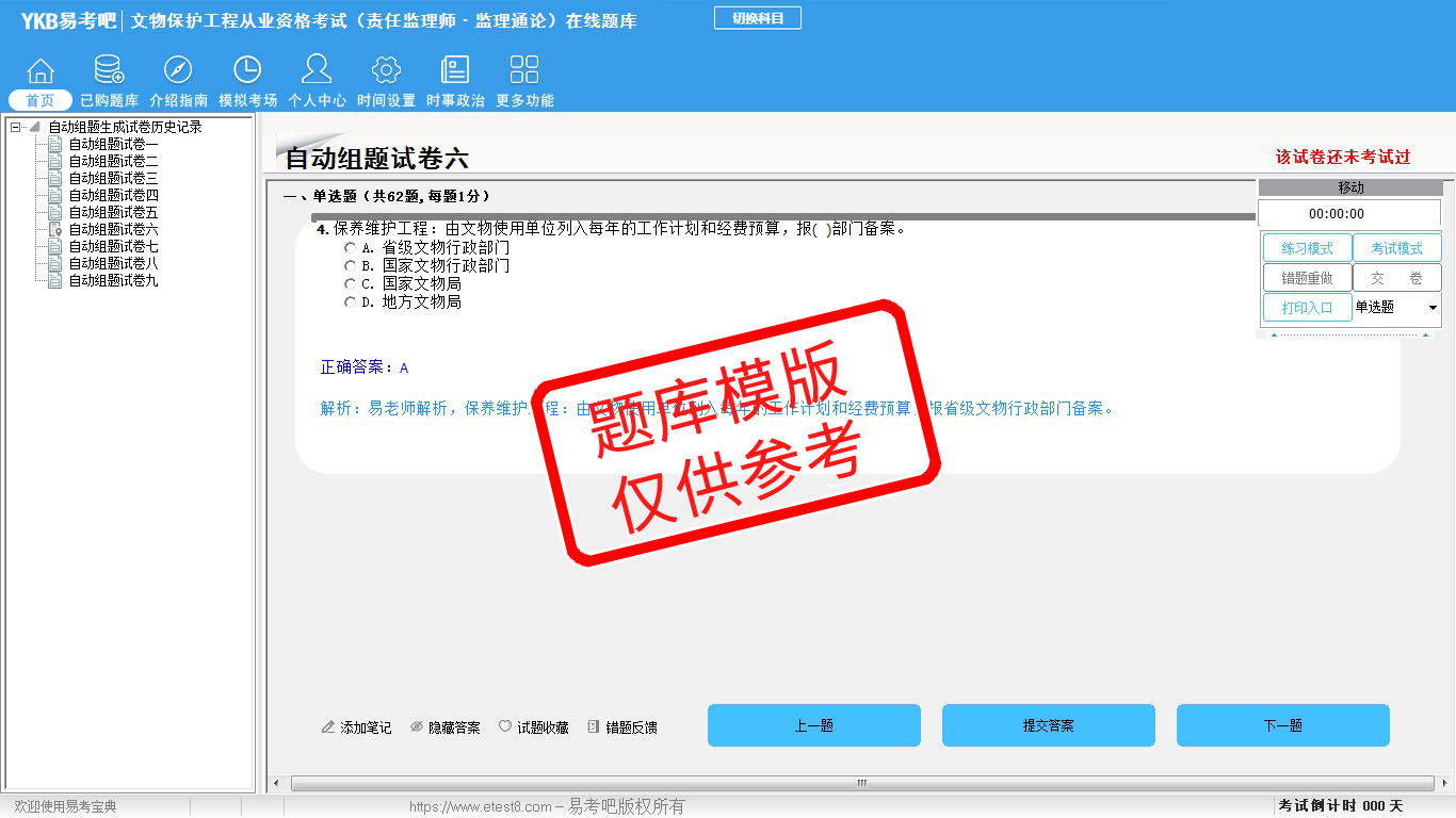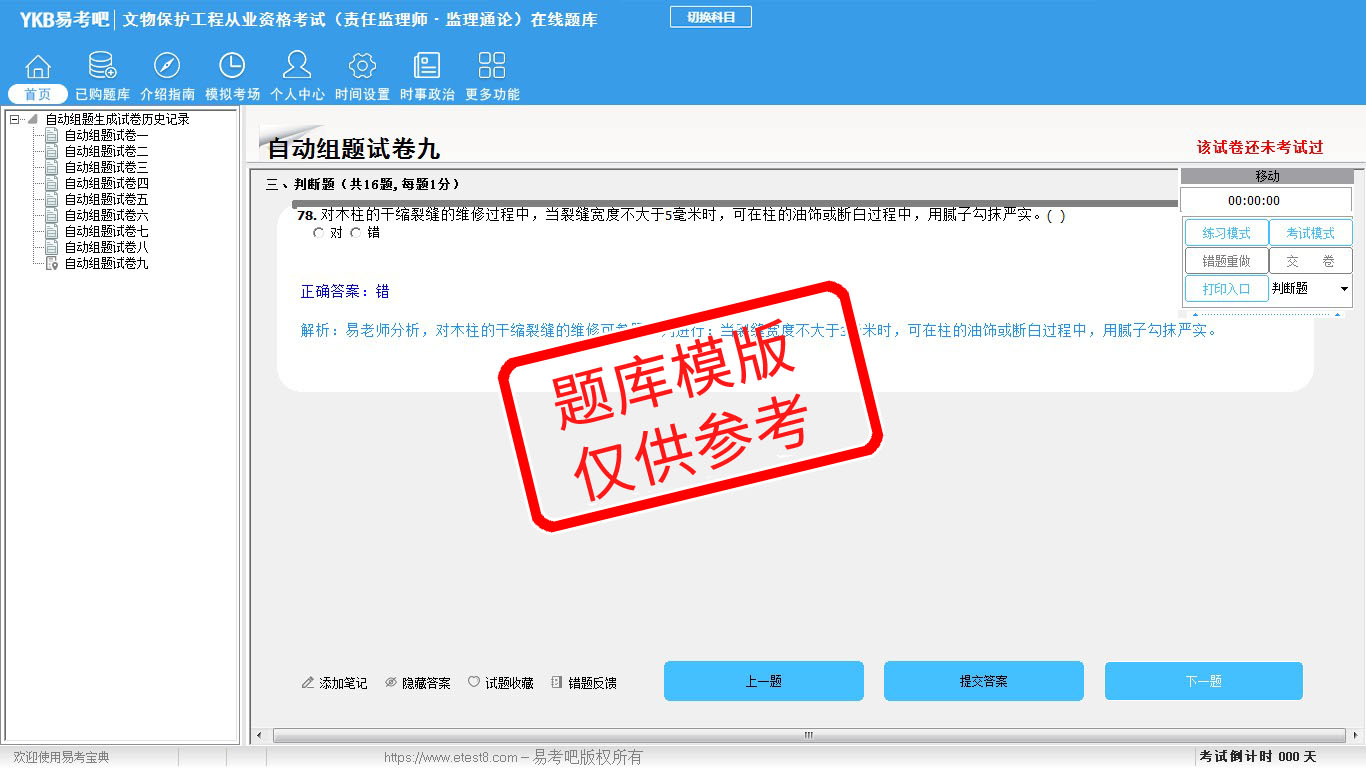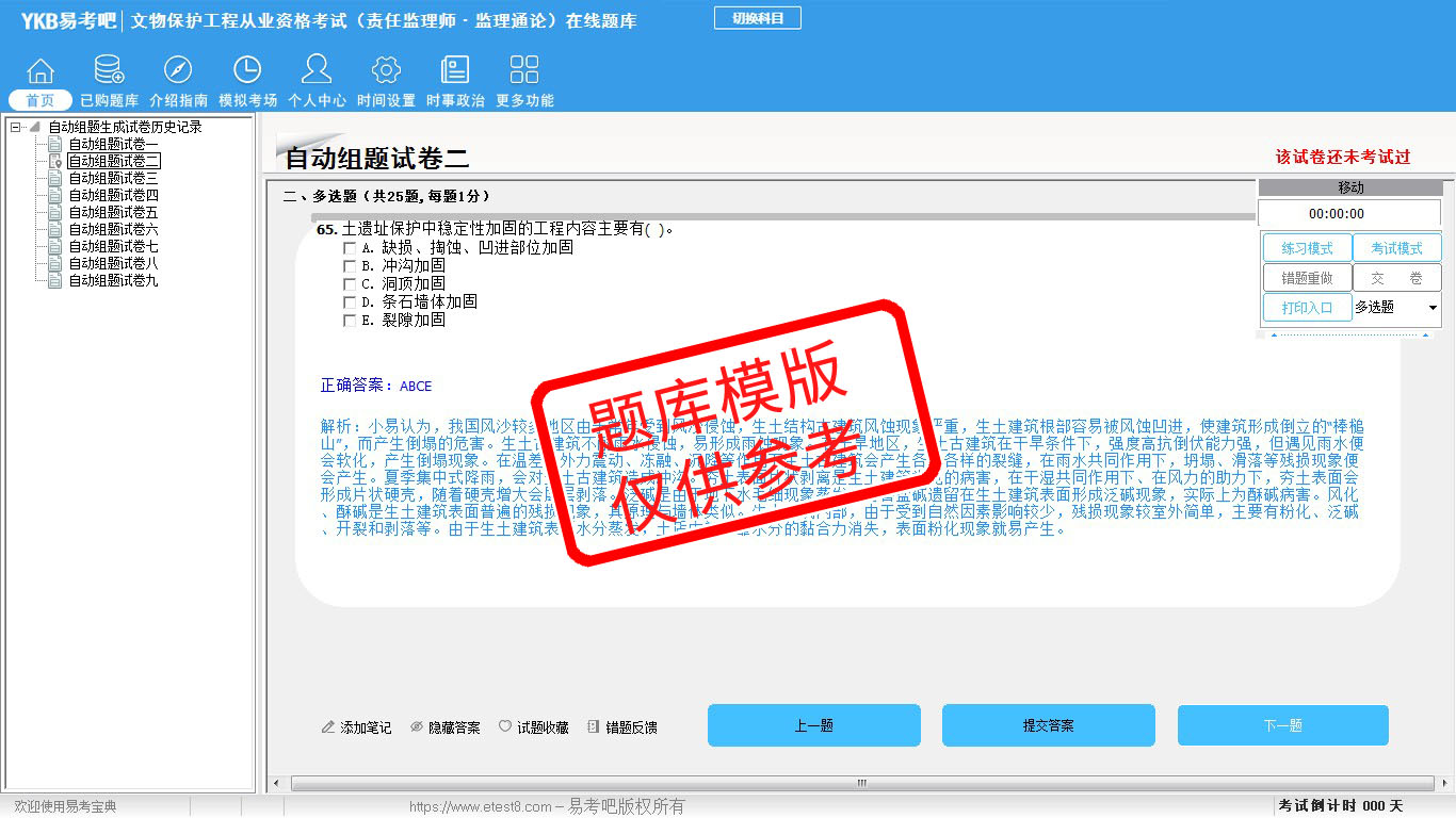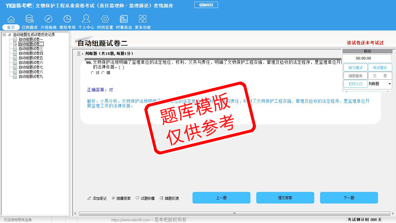 2026年文物保护工程从业资格考试(法律法规与工程管理+监理通论+监理实务)易考宝典软件(手机/网页版)是《易考宝典》考试系列软件之一,是专门为参加“文物保护工程职业资格考试”的朋友量身定做的自我测试系统,是个人、培训学校进行考试前训练、备考冲刺的提分技巧考试平台,题型丰富,图文并茂,内容全面,题库设计符合考试新大纲,海量试题。软件包括了富有价值的模拟考场,有计时打分等功能,就像亲身体会考试一样。