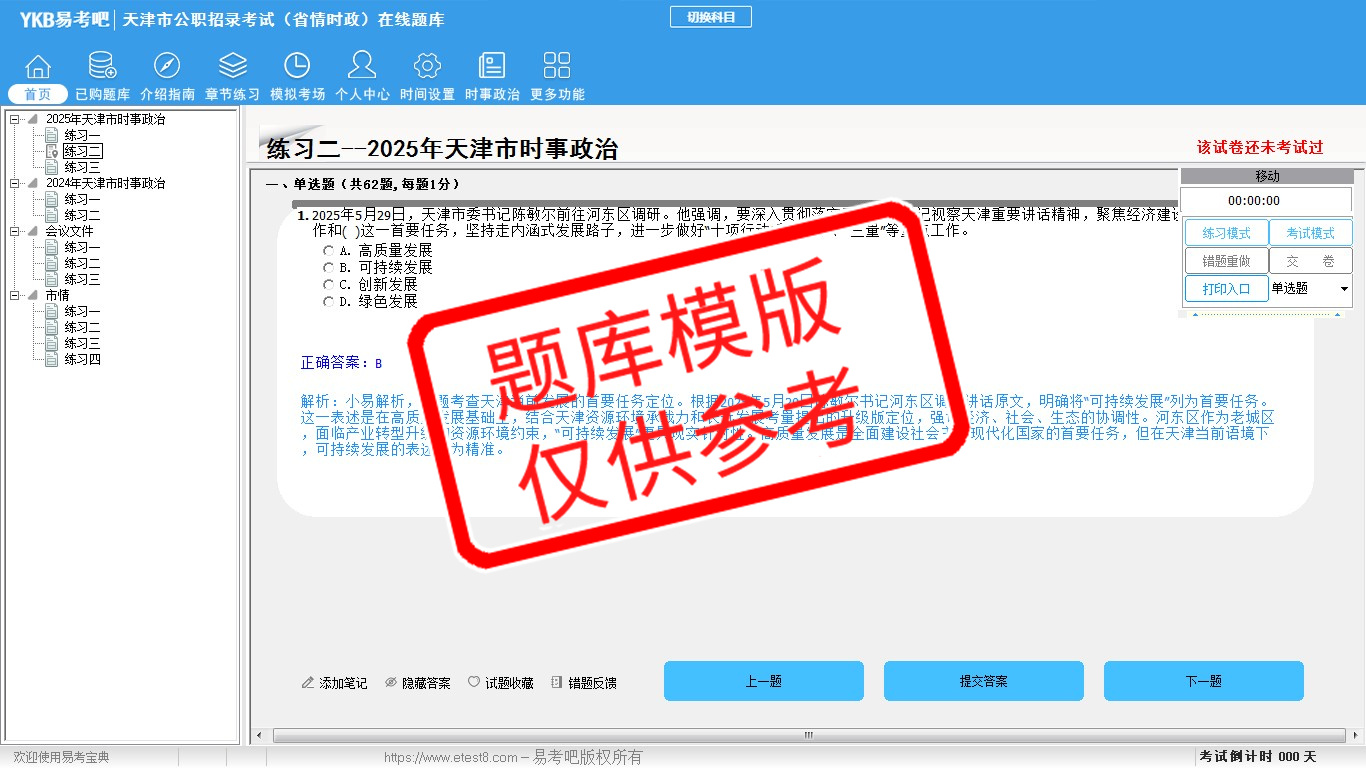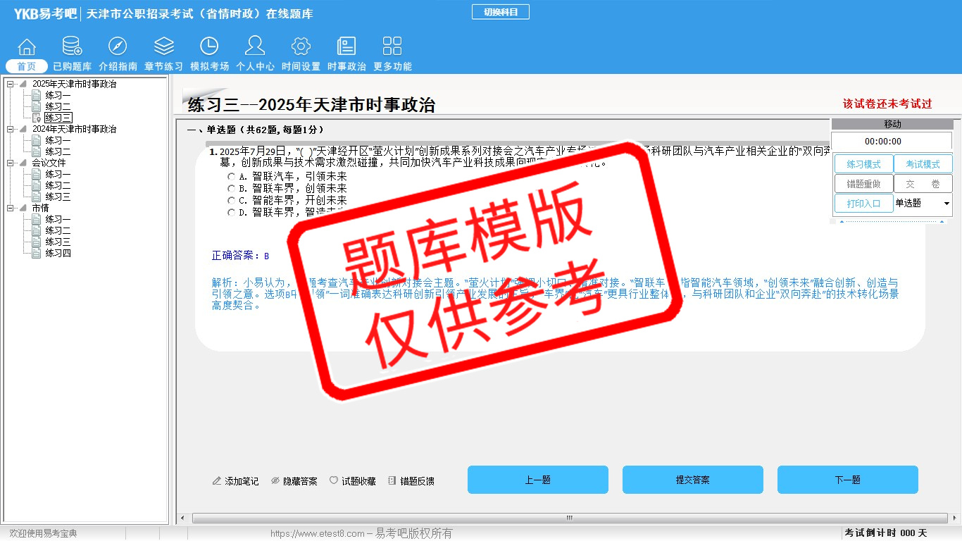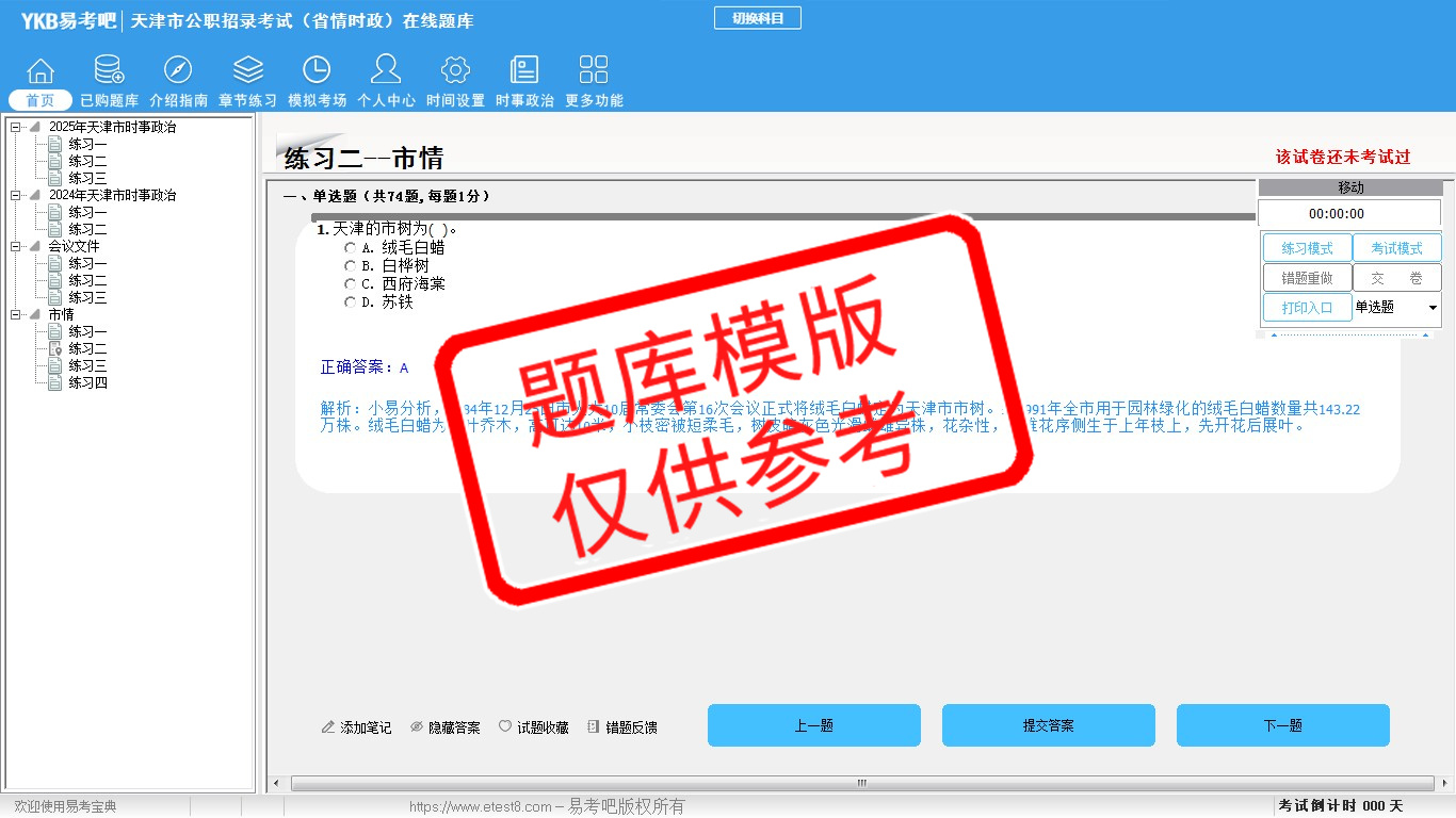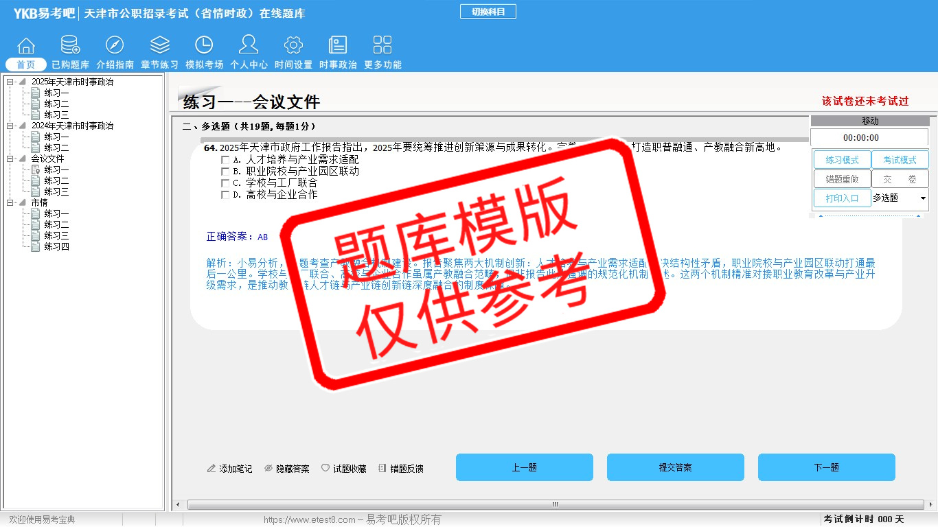 2026年天津市公职招录考试时政热点(省情时政)易考宝典软件(手机/网页版)是《易考宝典》考试系列软件之一,是专门为参加“时政省情职业资格考试”的朋友量身定做的自我测试系统,是个人、培训学校进行考试前训练、备考冲刺的提分技巧考试平台,题型丰富,图文并茂,内容全面,题库设计符合考试新大纲,海量试题。软件包括了富有价值的模拟考场,有计时打分等功能,就像亲身体会考试一样。