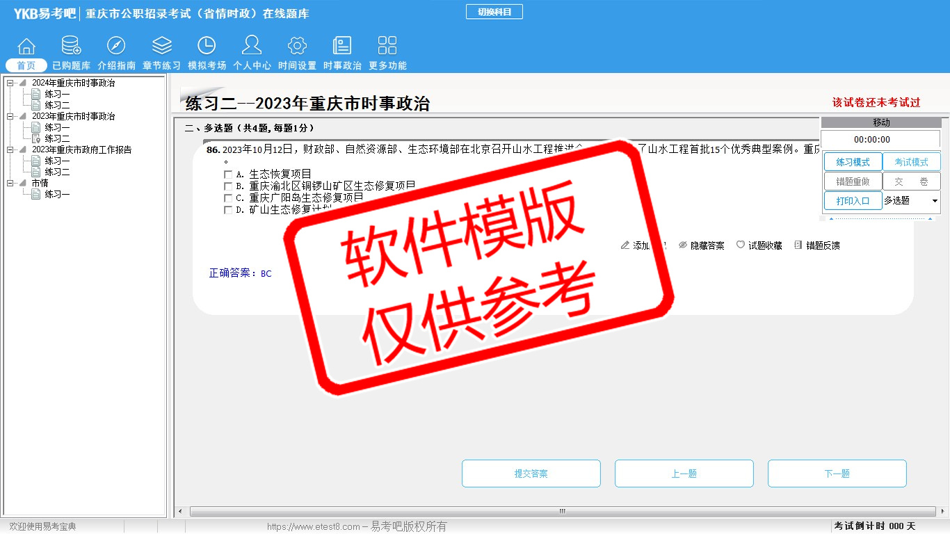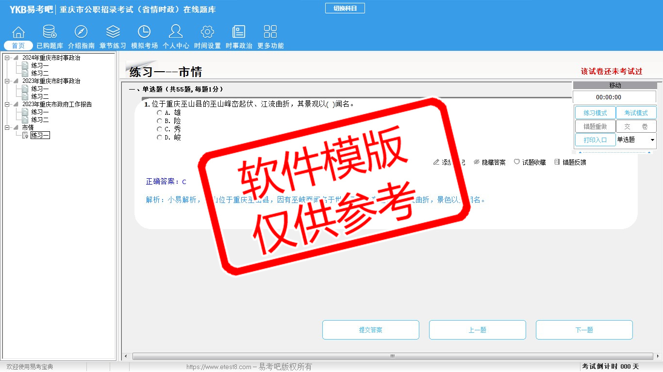 2026年重庆市公职招录考试时政热点(省情时政)易考宝典软件(手机/网页版)是《易考宝典》考试系列软件之一,是专门为参加“时政省情职业资格考试”的朋友量身定做的自我测试系统,是个人、培训学校进行考试前训练、备考冲刺的提分技巧考试平台,题型丰富,图文并茂,内容全面,题库设计符合考试新大纲,海量试题。软件包括了富有价值的模拟考场,有计时打分等功能,就像亲身体会考试一样。