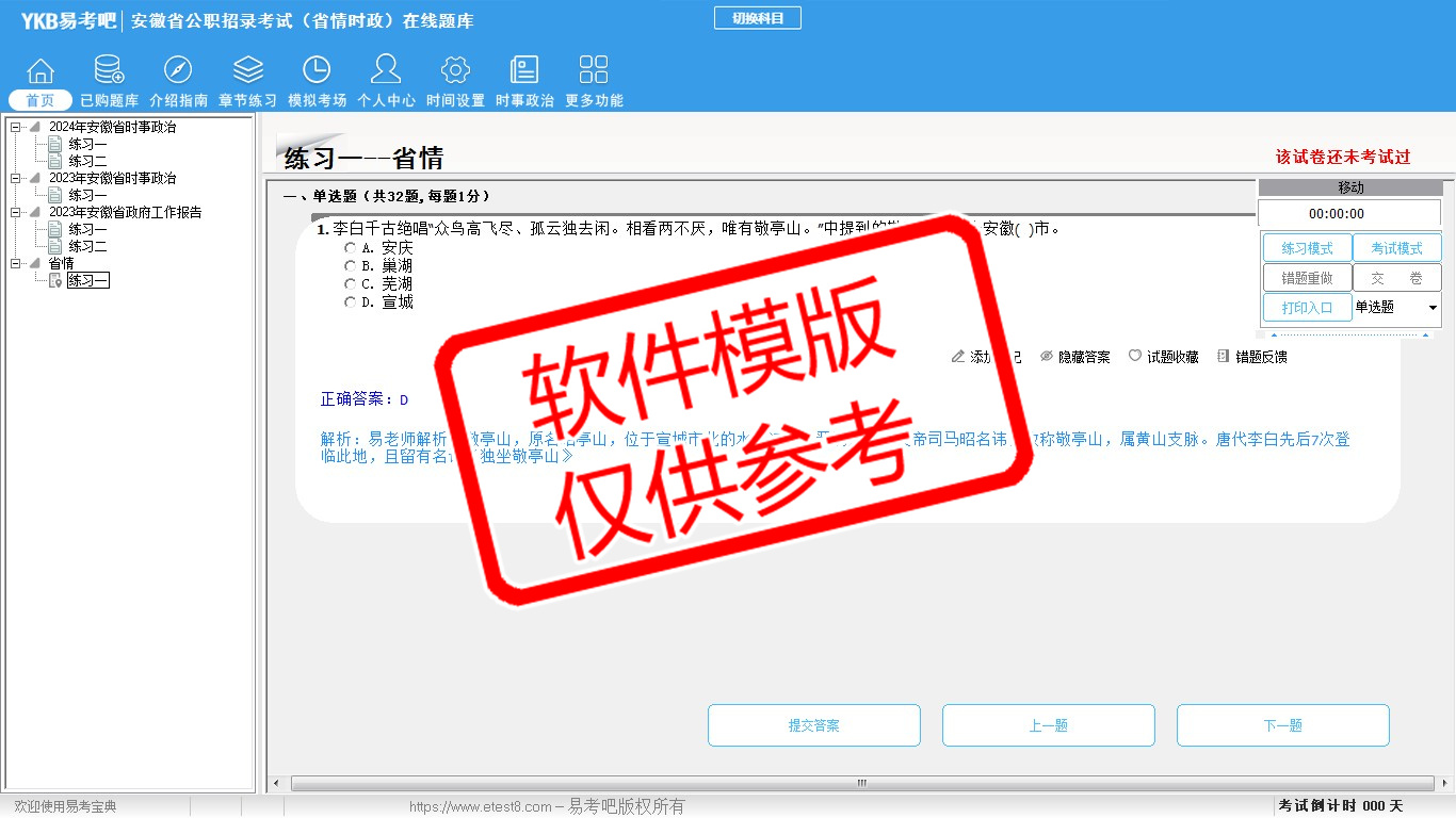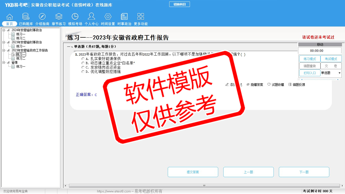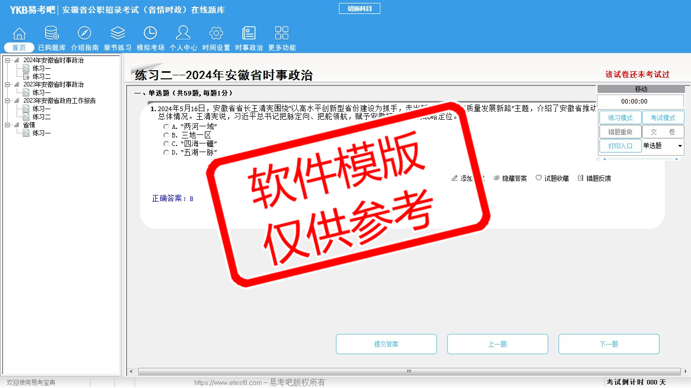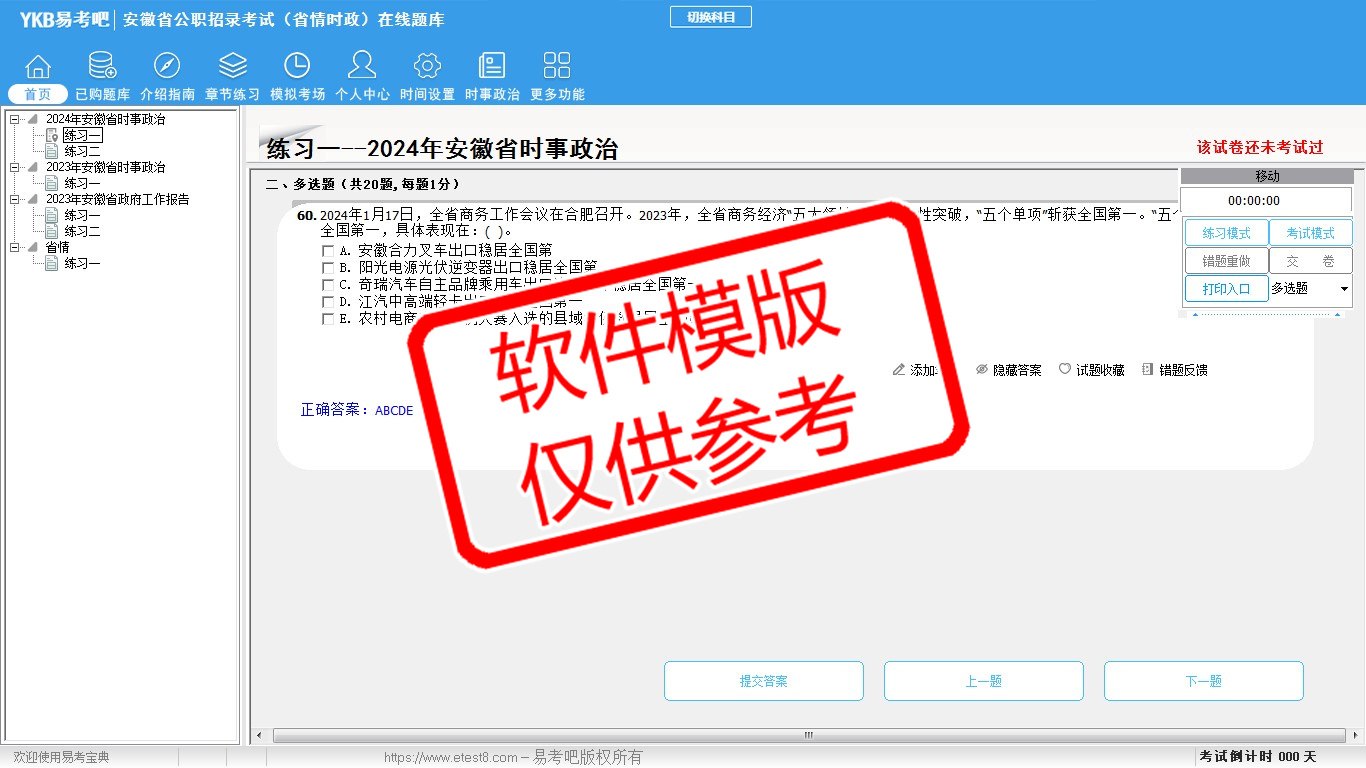 2026年安徽省公职招录考试时政热点(省情时政)易考宝典软件(手机/网页版)是《易考宝典》考试系列软件之一,是专门为参加“时政省情职业资格考试”的朋友量身定做的自我测试系统,是个人、培训学校进行考试前训练、备考冲刺的提分技巧考试平台,题型丰富,图文并茂,内容全面,题库设计符合考试新大纲,海量试题。软件包括了富有价值的模拟考场,有计时打分等功能,就像亲身体会考试一样。