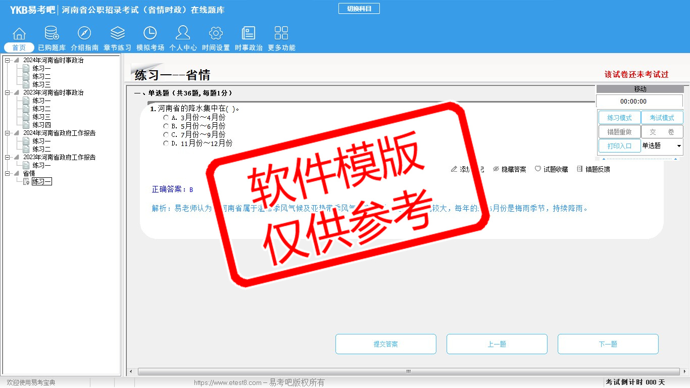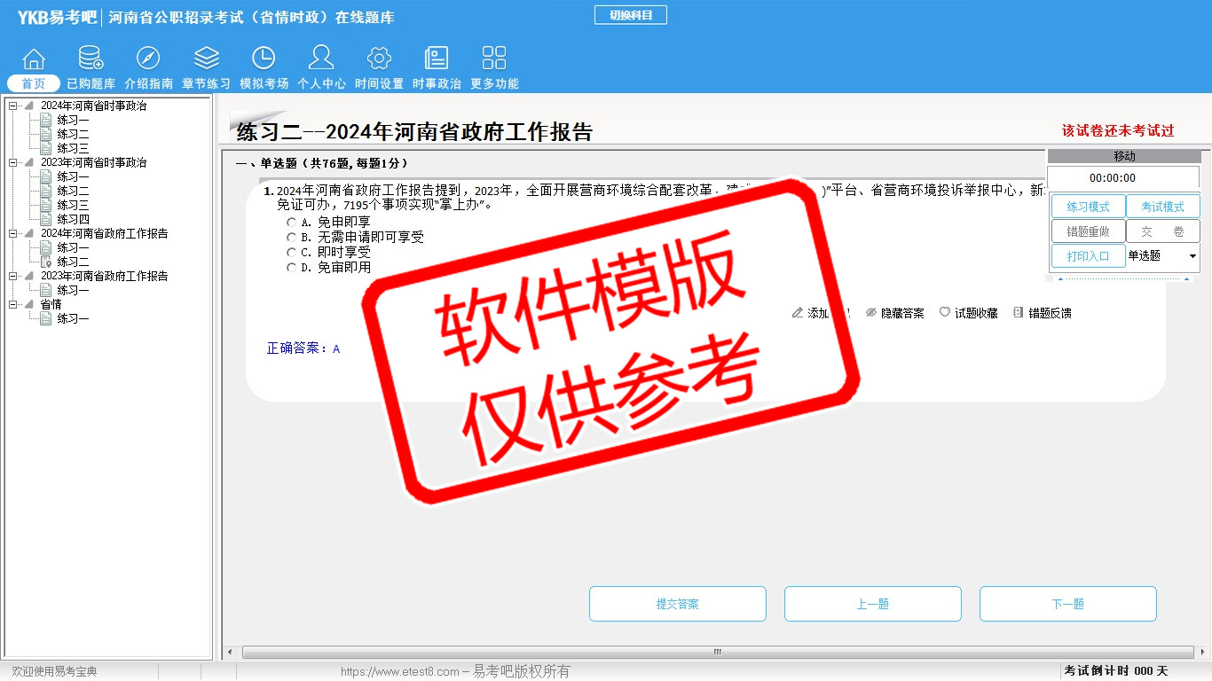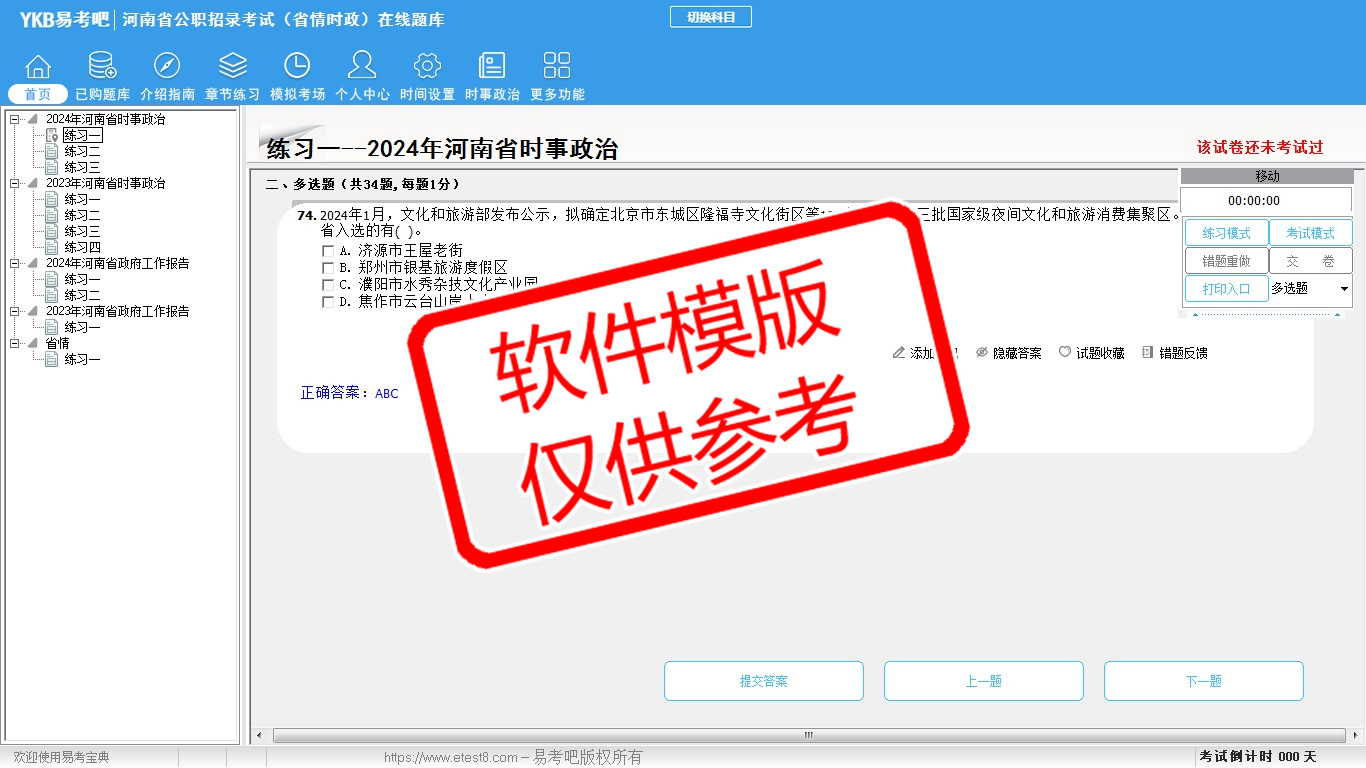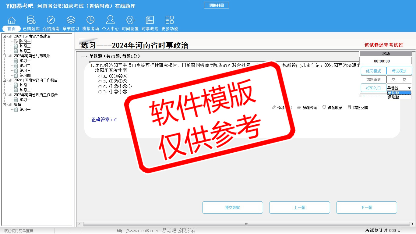 2026年河南省公职招录考试时政热点(省情时政)易考宝典软件(手机/网页版)是《易考宝典》考试系列软件之一,是专门为参加“时政省情职业资格考试”的朋友量身定做的自我测试系统,是个人、培训学校进行考试前训练、备考冲刺的提分技巧考试平台,题型丰富,图文并茂,内容全面,题库设计符合考试新大纲,海量试题。软件包括了富有价值的模拟考场,有计时打分等功能,就像亲身体会考试一样。